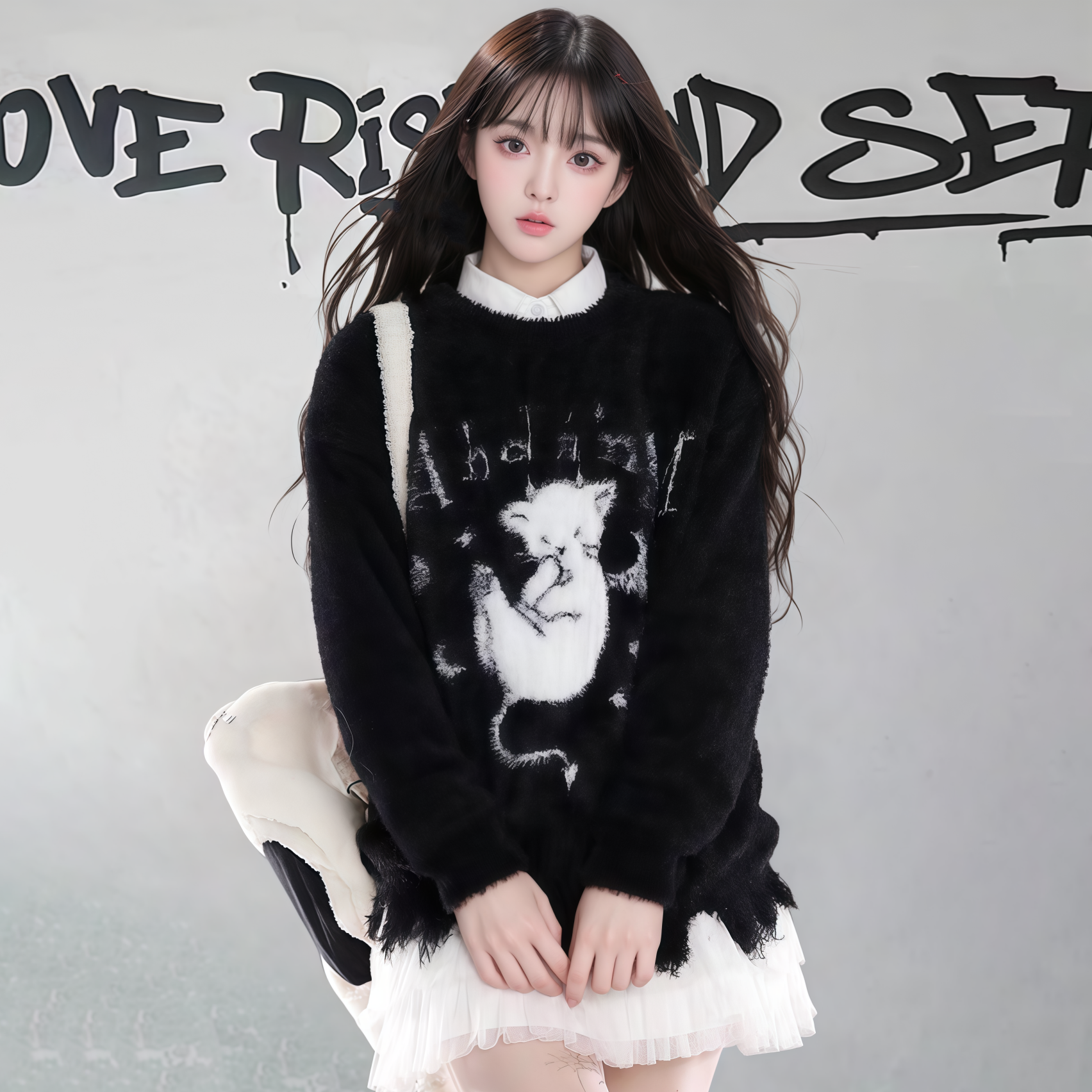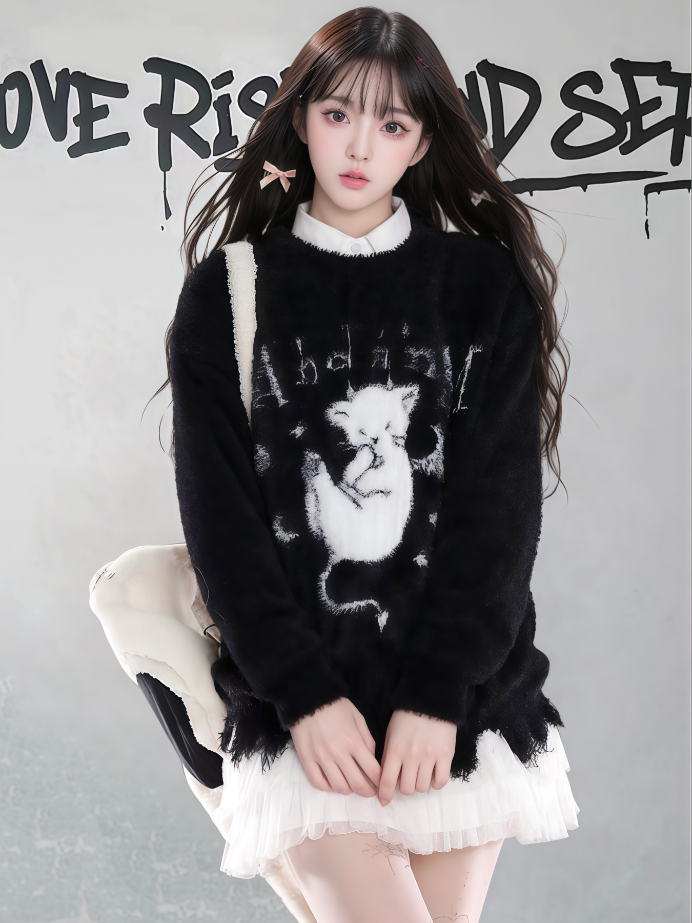 【トップス】ダメージ加工 猫モチーフ ニットセーター レディース 秋冬 ゆったり ルーズ カジュアル【FCシリーズ】