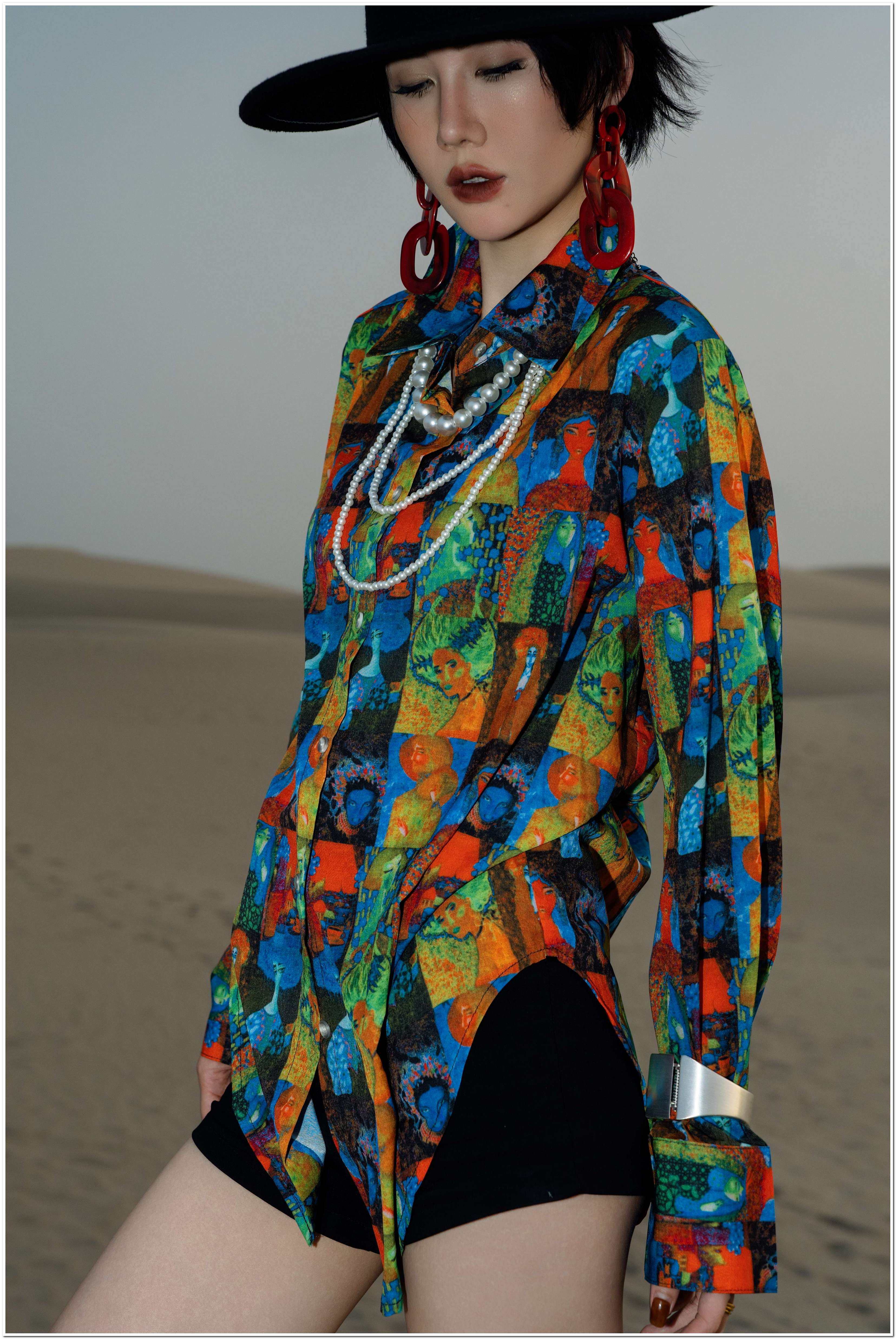 【ワンピース】香港風 クルーネック 切替 シャツ生地 大きめサイズ 長袖 ワンピース ビッグシルエット ゆったり【JZシリーズ】