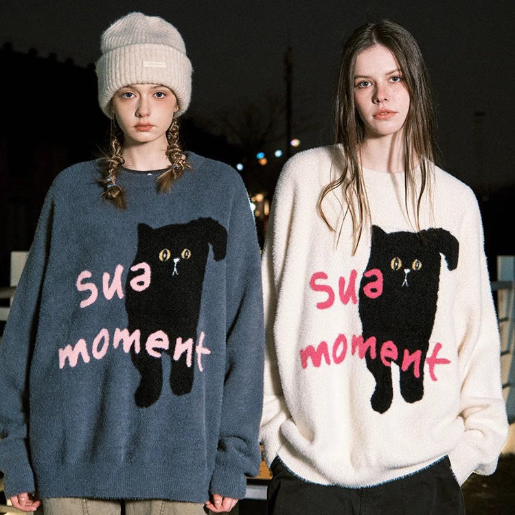 【トップス】もこもこ黒猫ロゴ 仿貂毛ニットセーター ユニセックス・オーバーサイズ・カップル対応【FCシリーズ】【10~15日内発送】