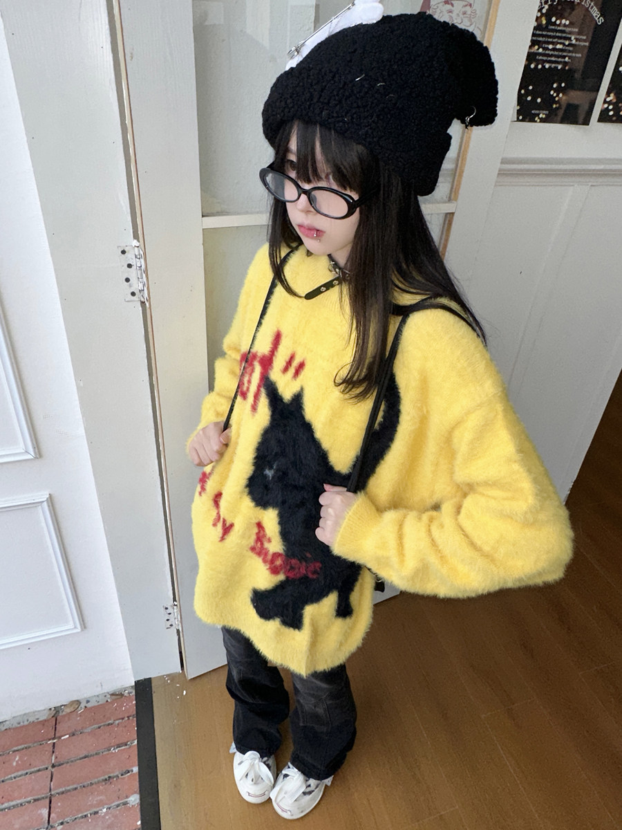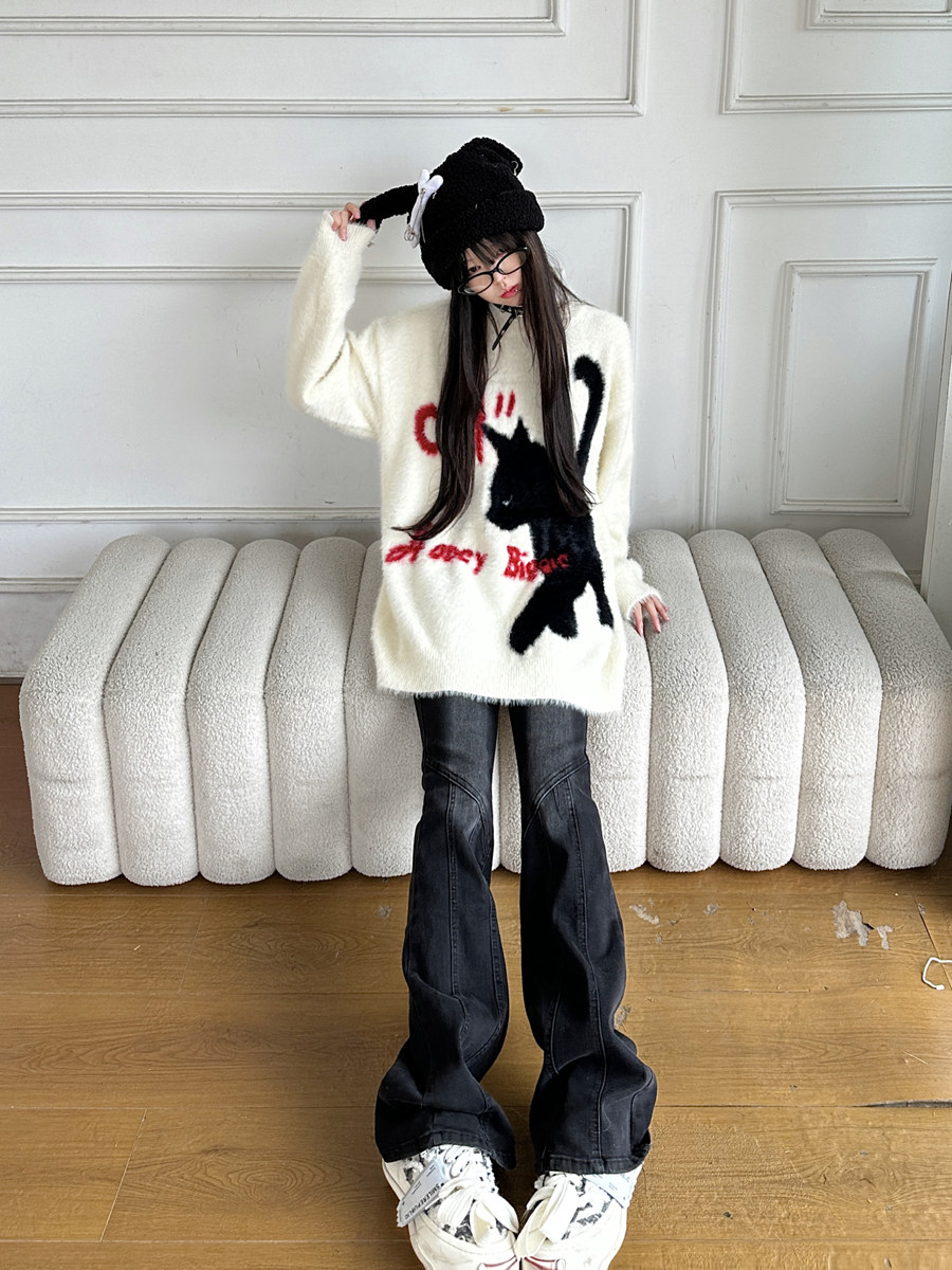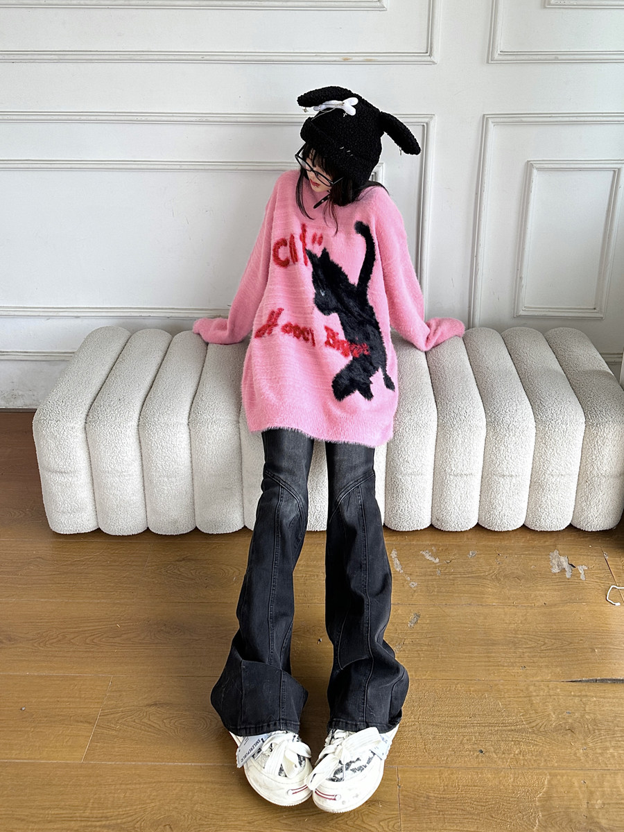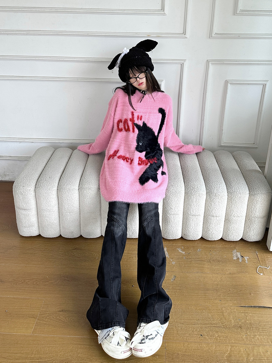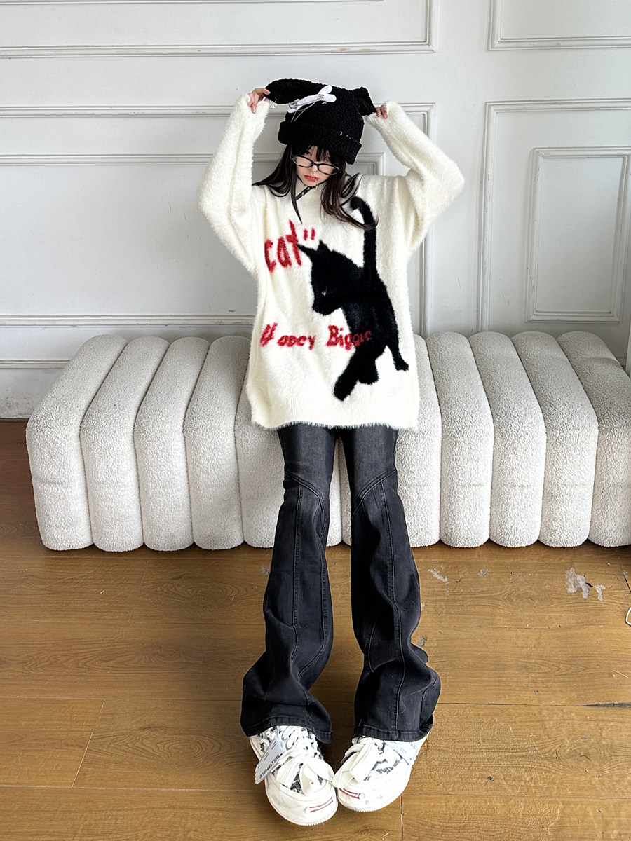 【トップス】アメリカンレトロ 猫モチーフ 猫柄 ネコ クルーネック ニット ルーズ 秋新作【FCシリーズ】