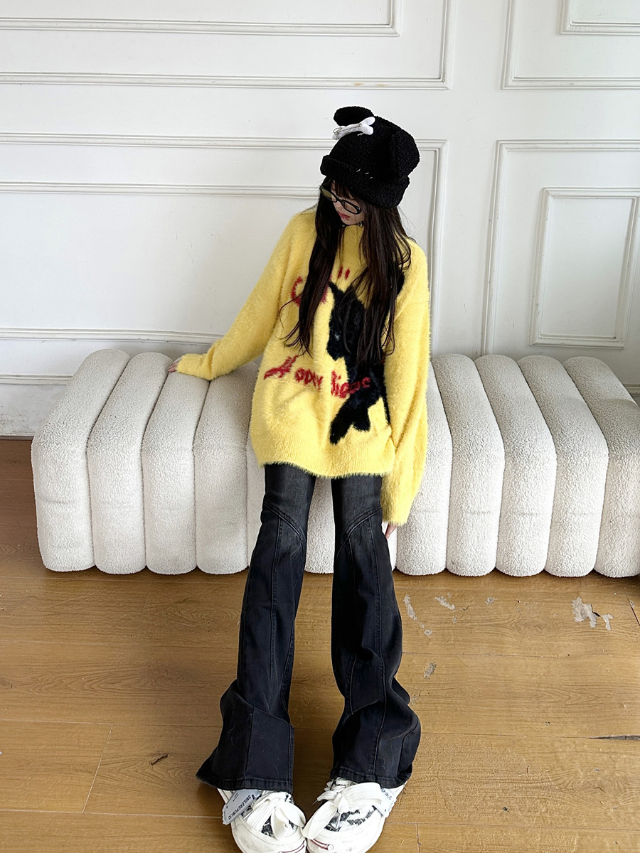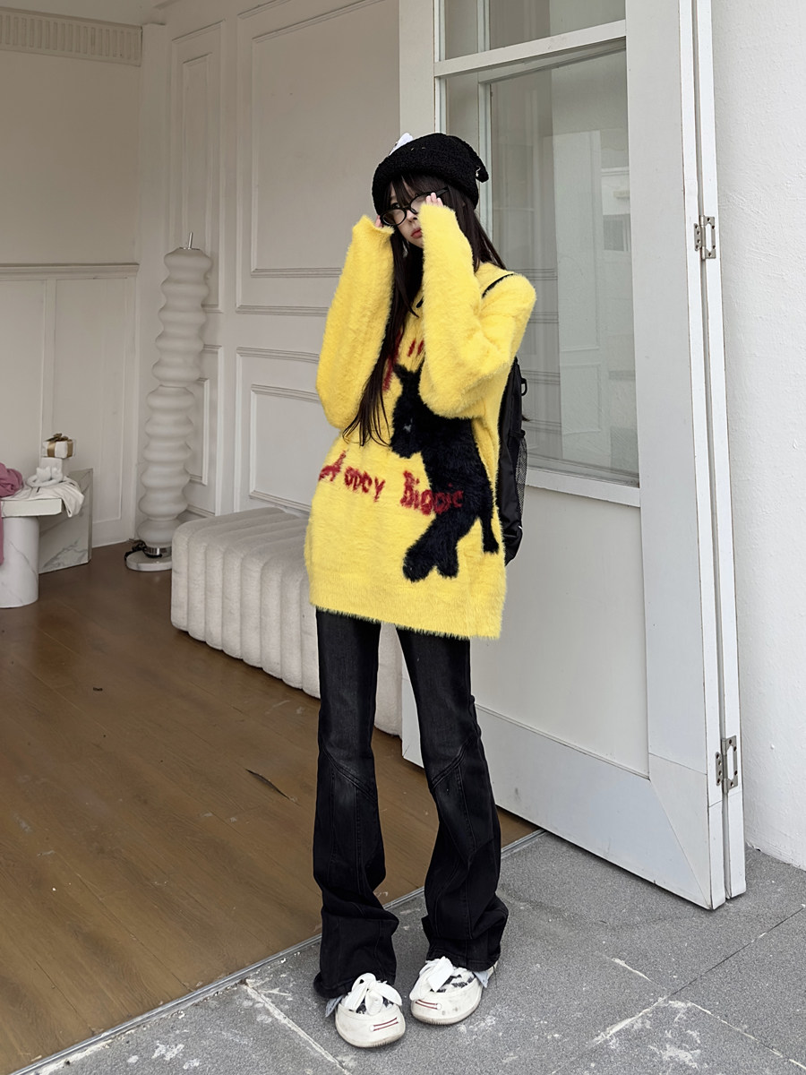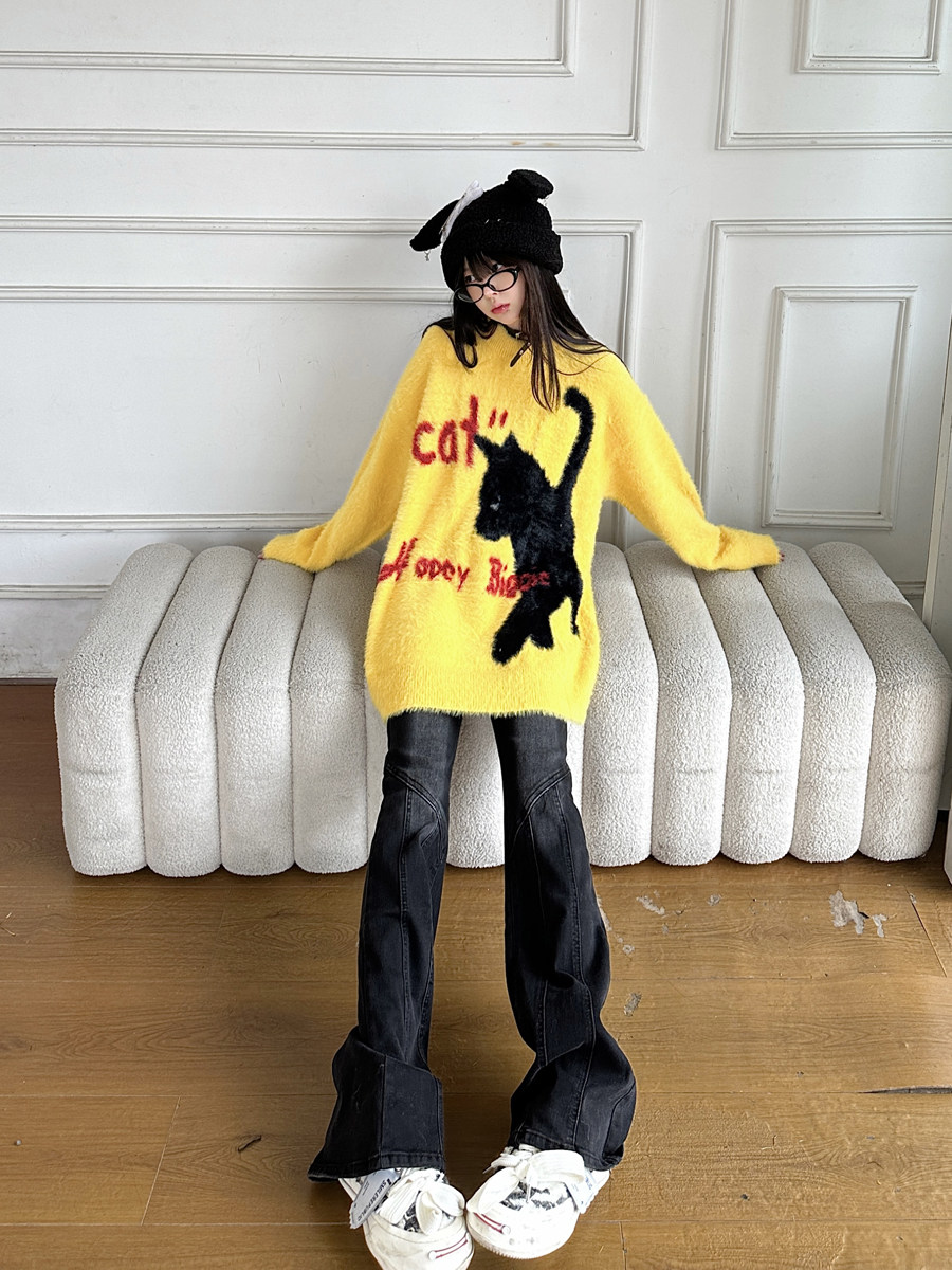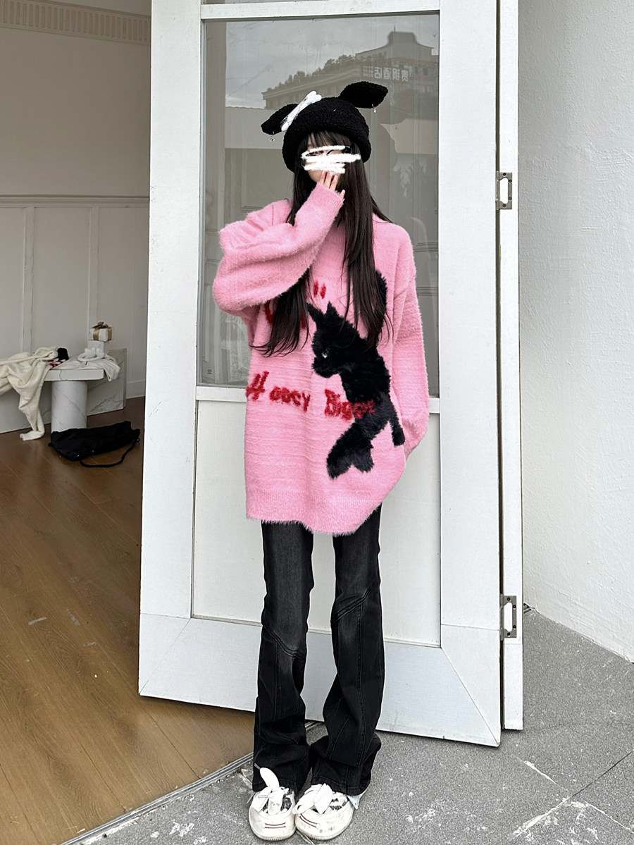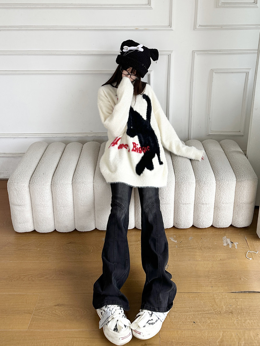 【トップス】アメリカンレトロ 猫モチーフ 猫柄 ネコ クルーネック ニット ルーズ 秋新作【FCシリーズ】