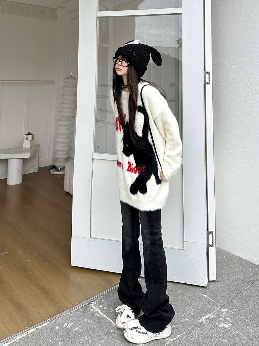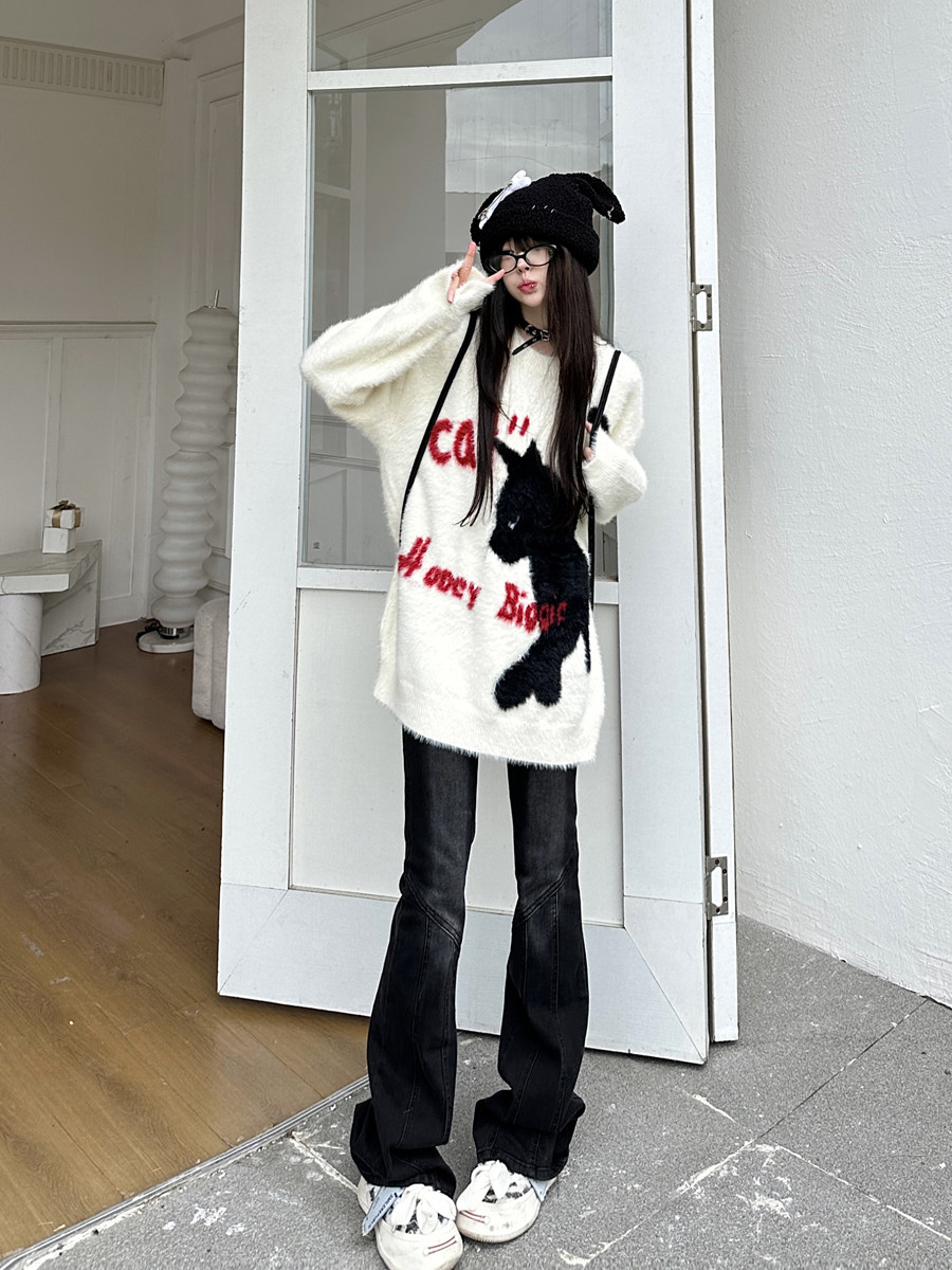 【トップス】レトロ デザイン 小犬柄 クルーネック ニット レディース ゆったり ルーズ 着回し セーター【FCシリーズ】