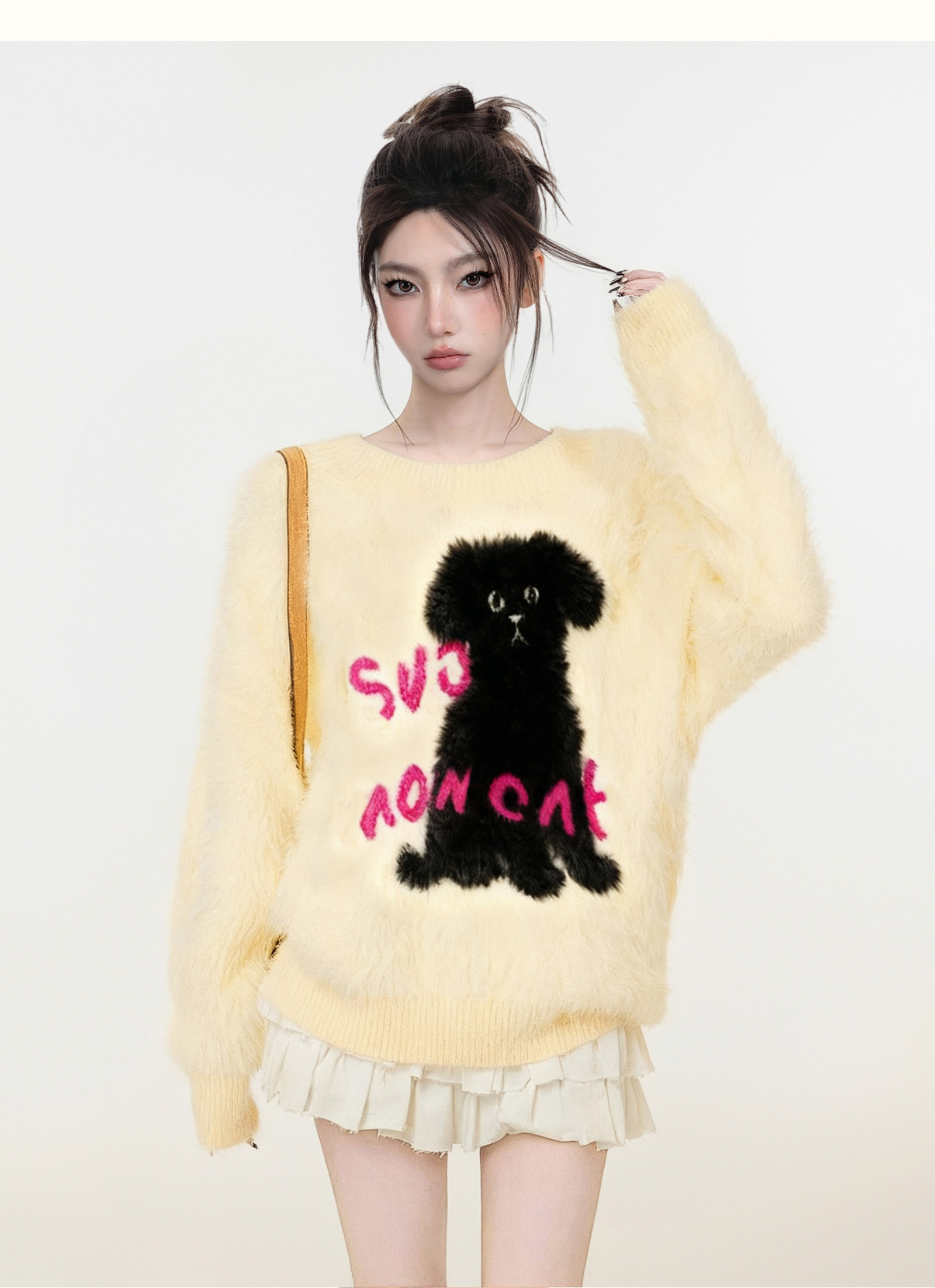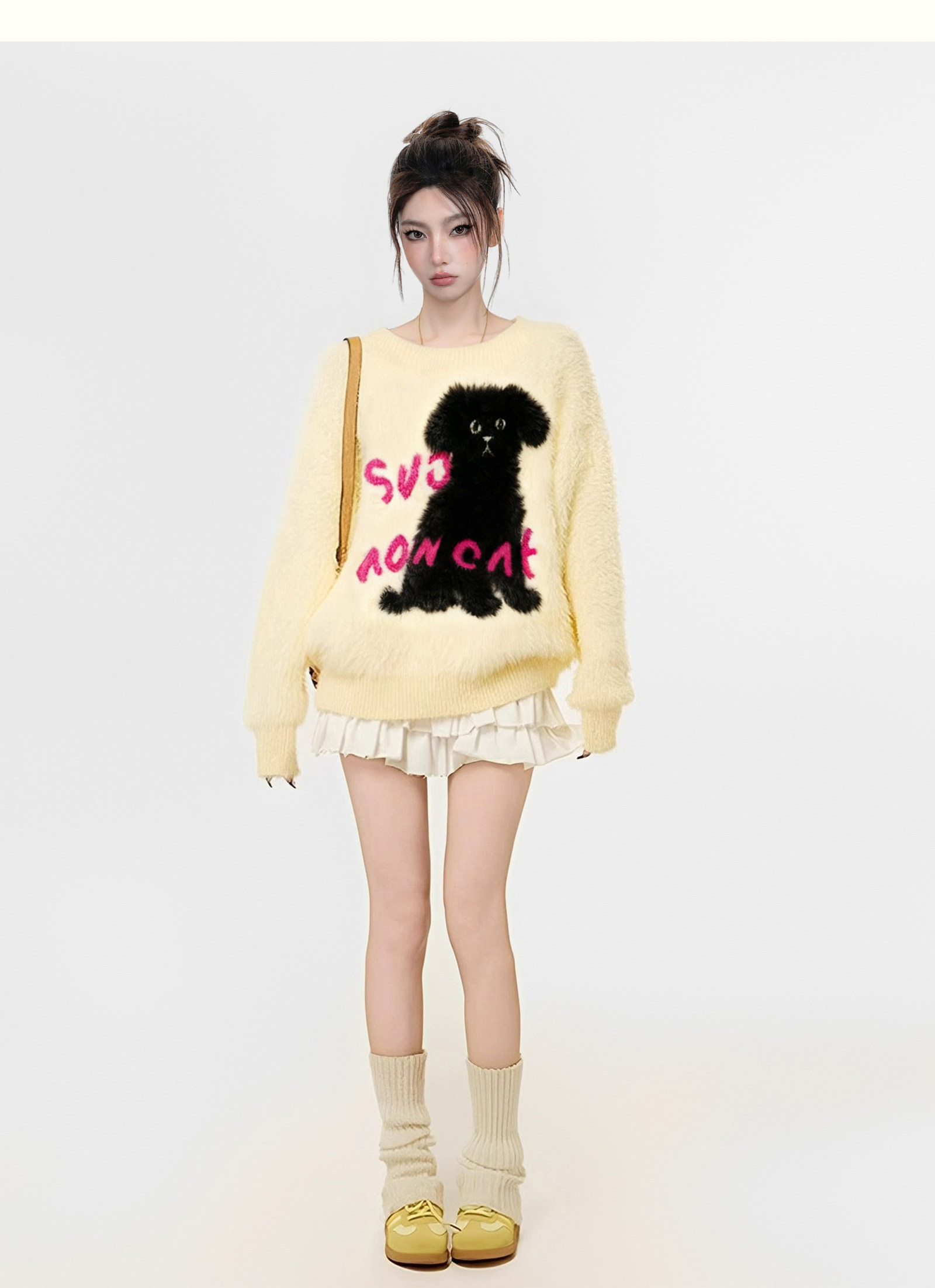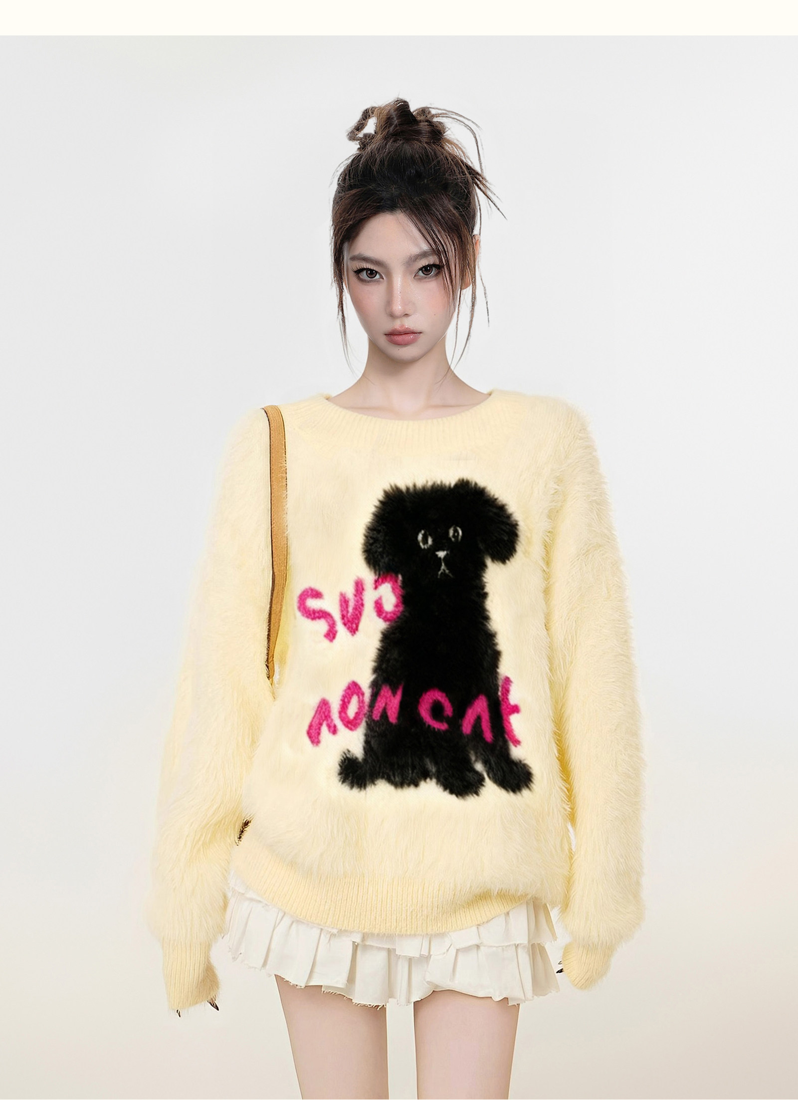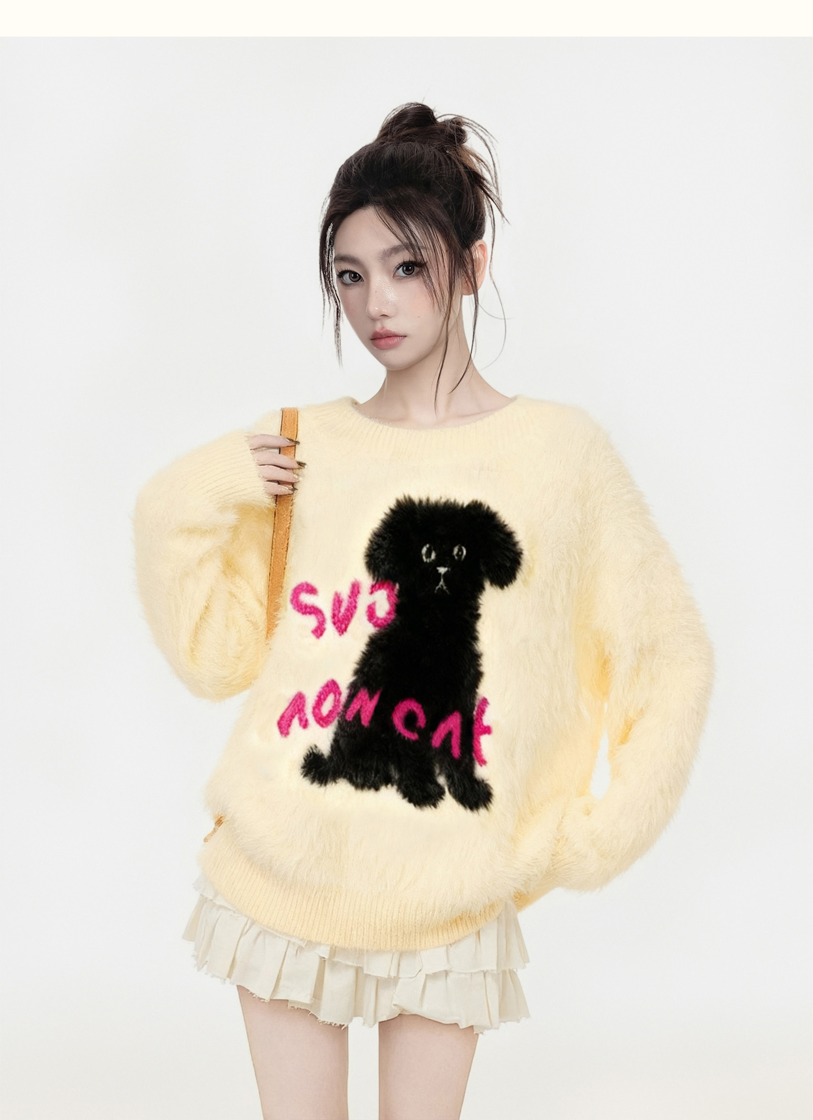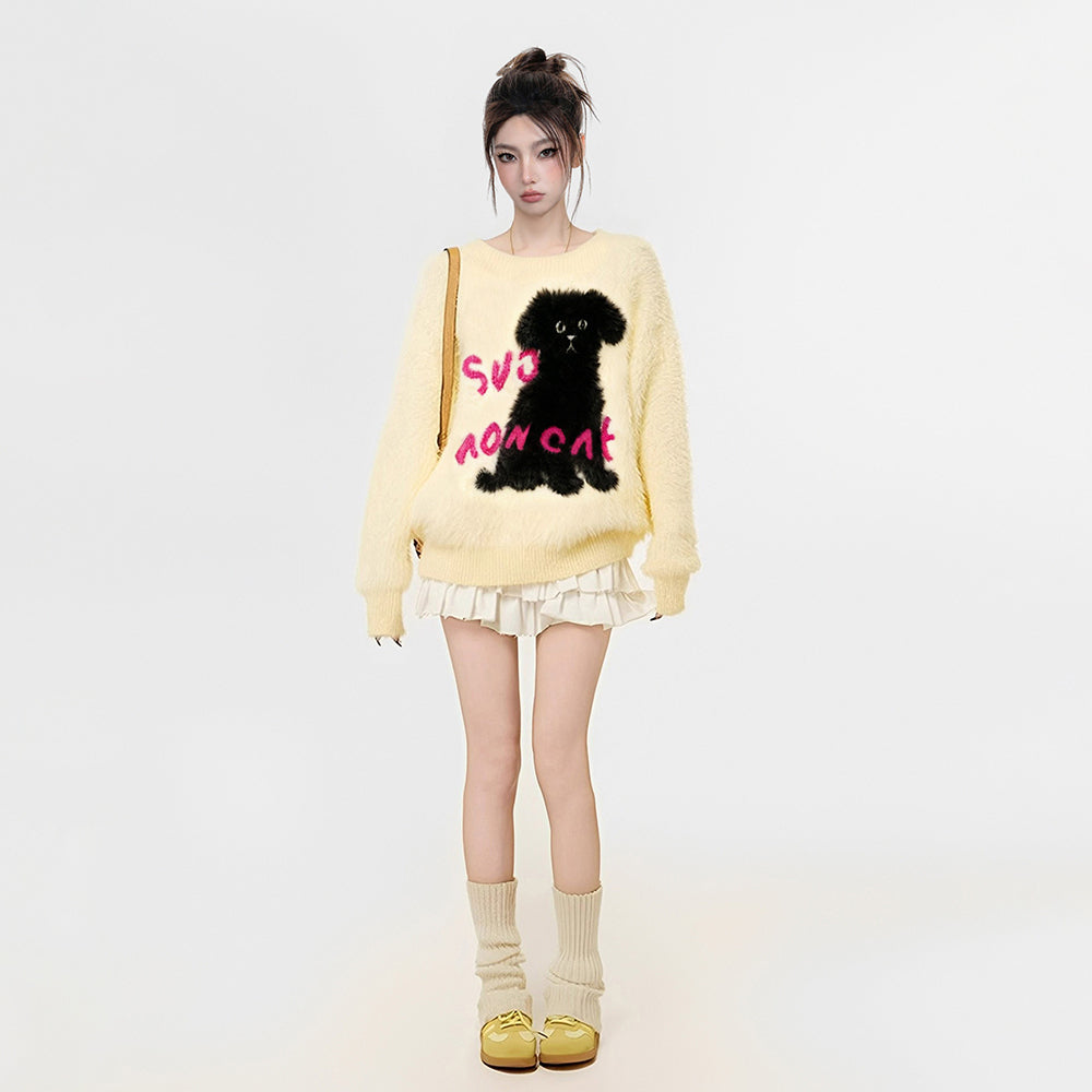 【商品名】【トップス】小犬モチーフ マハラム風 ニット レディース 秋冬 厚手 ふんわり ミンク風 クルーネック セーター【FCシリーズ】