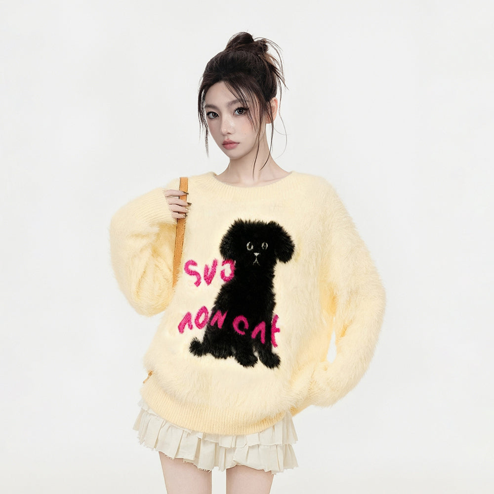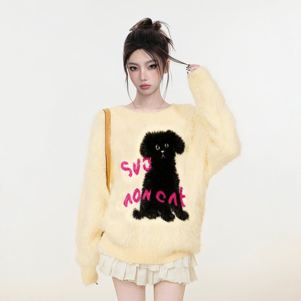 【トップス】小犬モチーフ マハラム風 ニット レディース 秋冬 厚手 ふんわり ミンク風 クルーネック セーター【FCシリーズ】