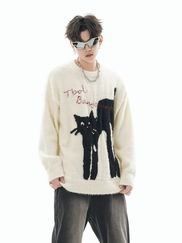 1/30~2/1⭐️期間限定 60%OFF !🏆 売れ筋No.1【トップス】ユニセックス対応 レトロ 豹柄 猫 ゆったり ラウンドネック ネコ柄 ニットセーター【FCシリーズ】