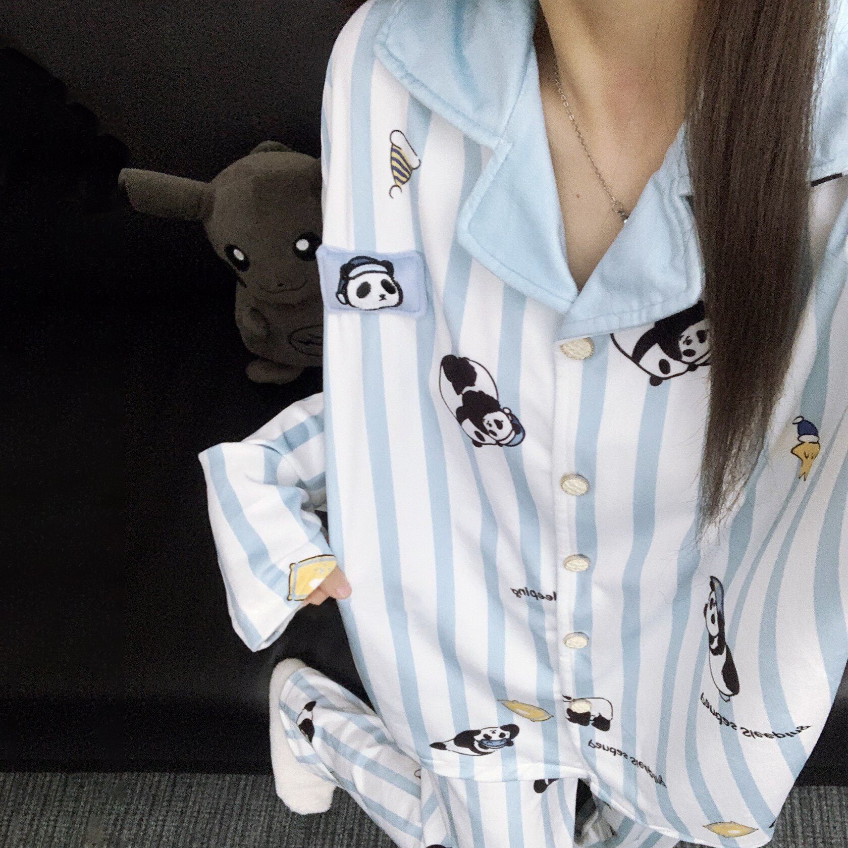 【インナー】かわいいパンダ ストライプ柄 アイランドフリース 薄手 ルームウェア レディース 秋冬