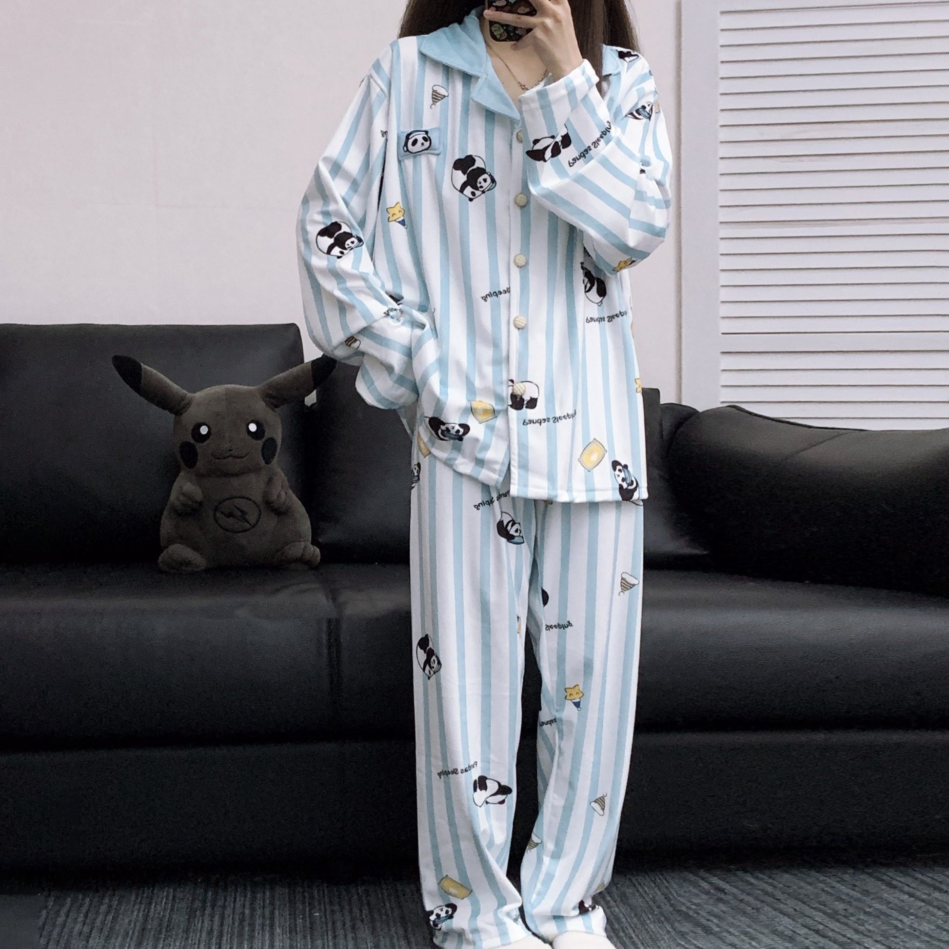 【商品名】【インナー】かわいいパンダ ストライプ柄 アイランドフリース 薄手 ルームウェア レディース 秋冬