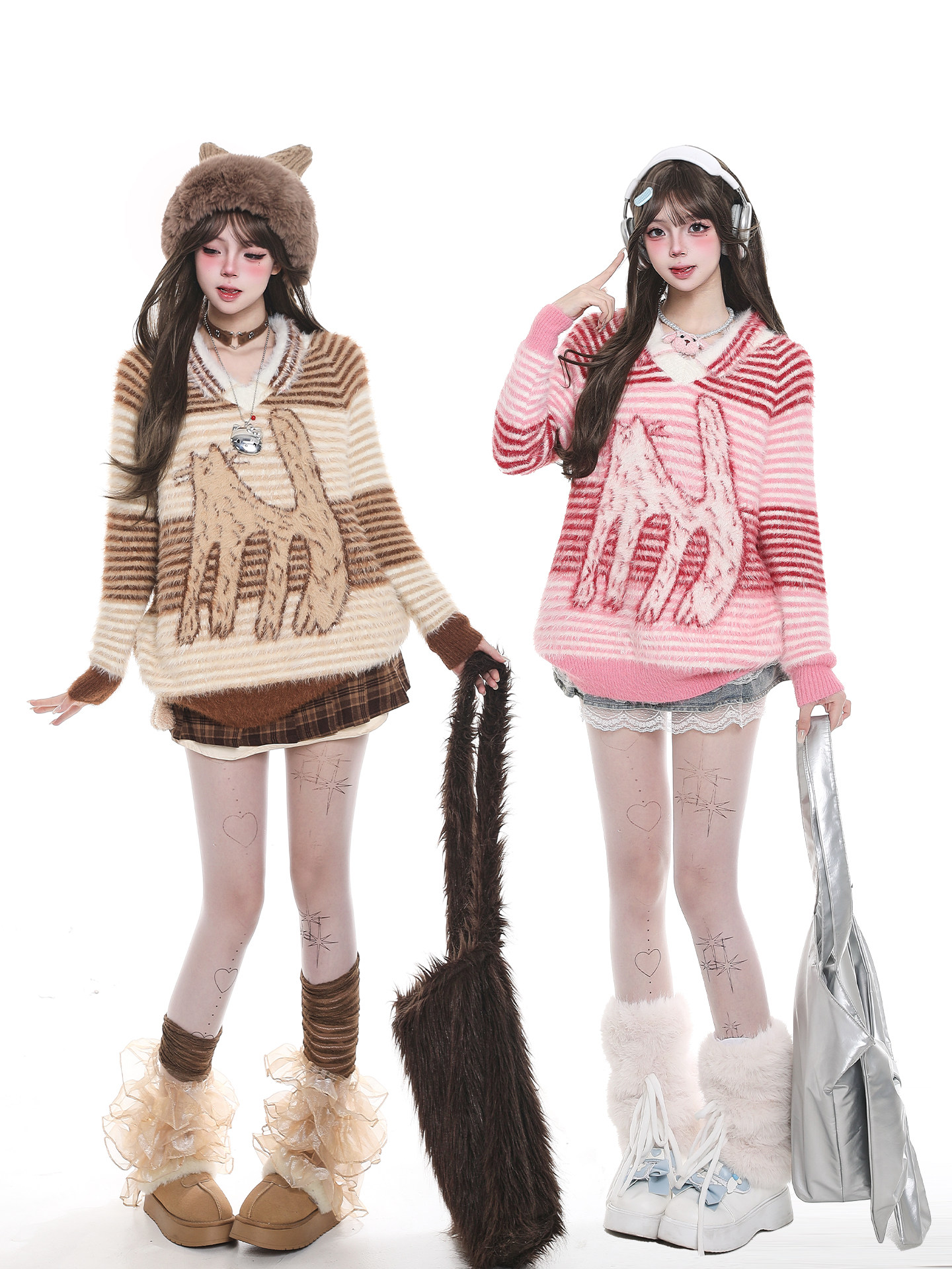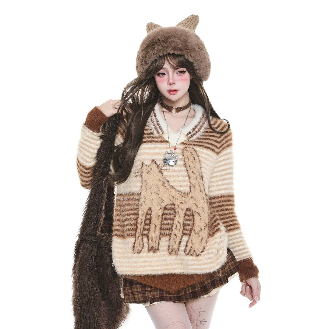 【商品名】【トップス】猫柄ストライプ 韓国風カジュアル ゆったり ニットセーター【FCシリーズ】