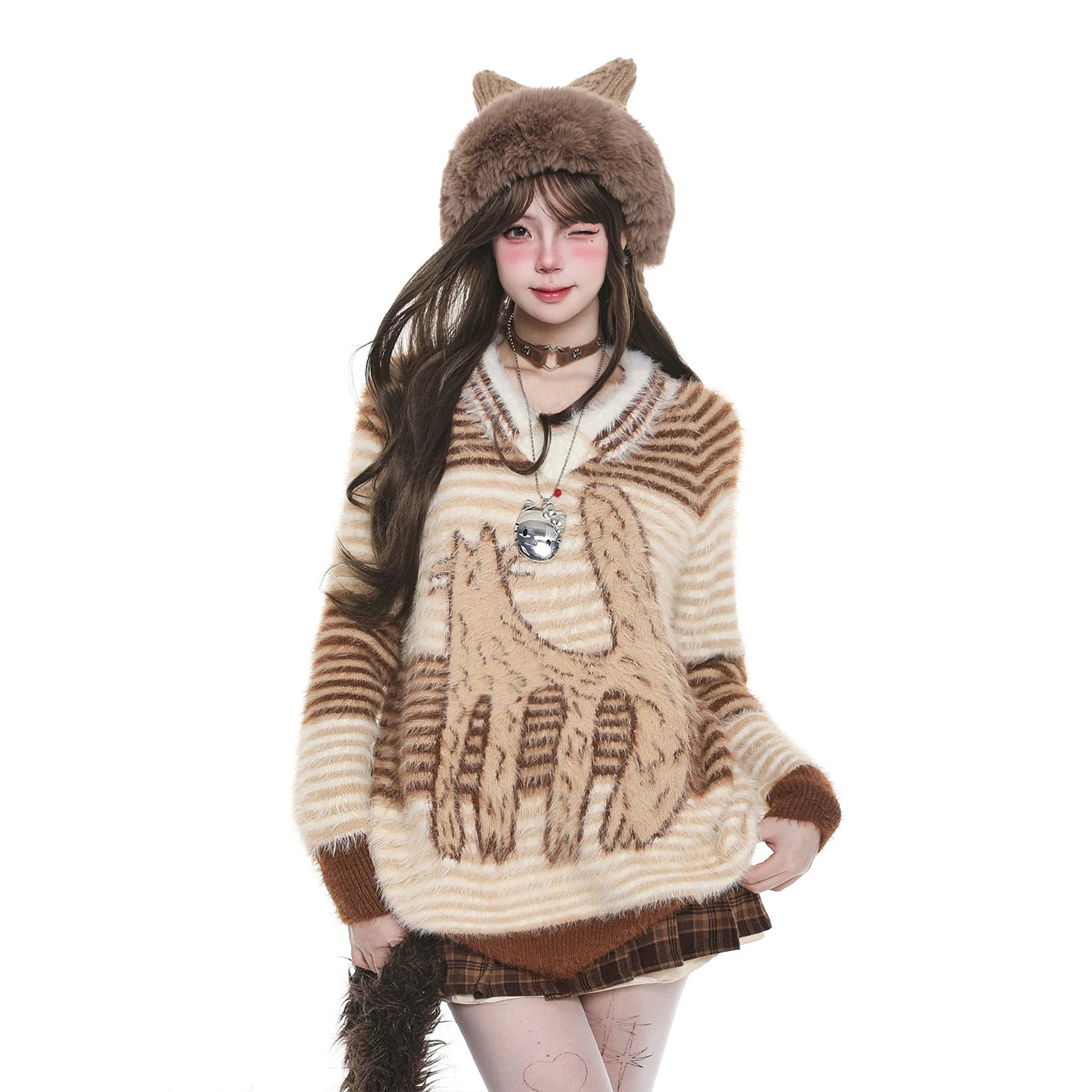 【トップス】猫柄ストライプ 韓国風カジュアル ゆったり ニットセーター【FCシリーズ】