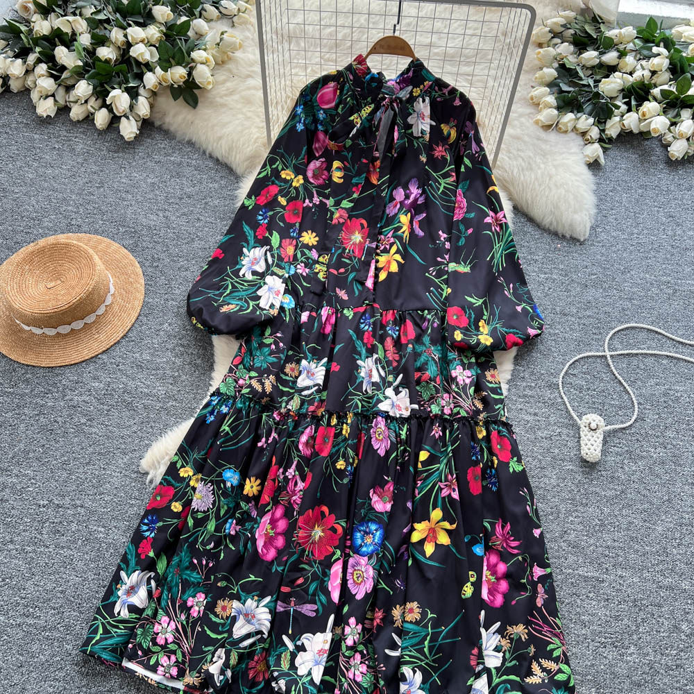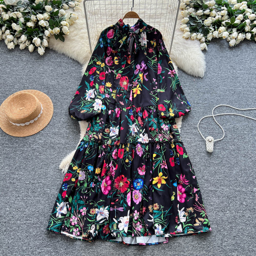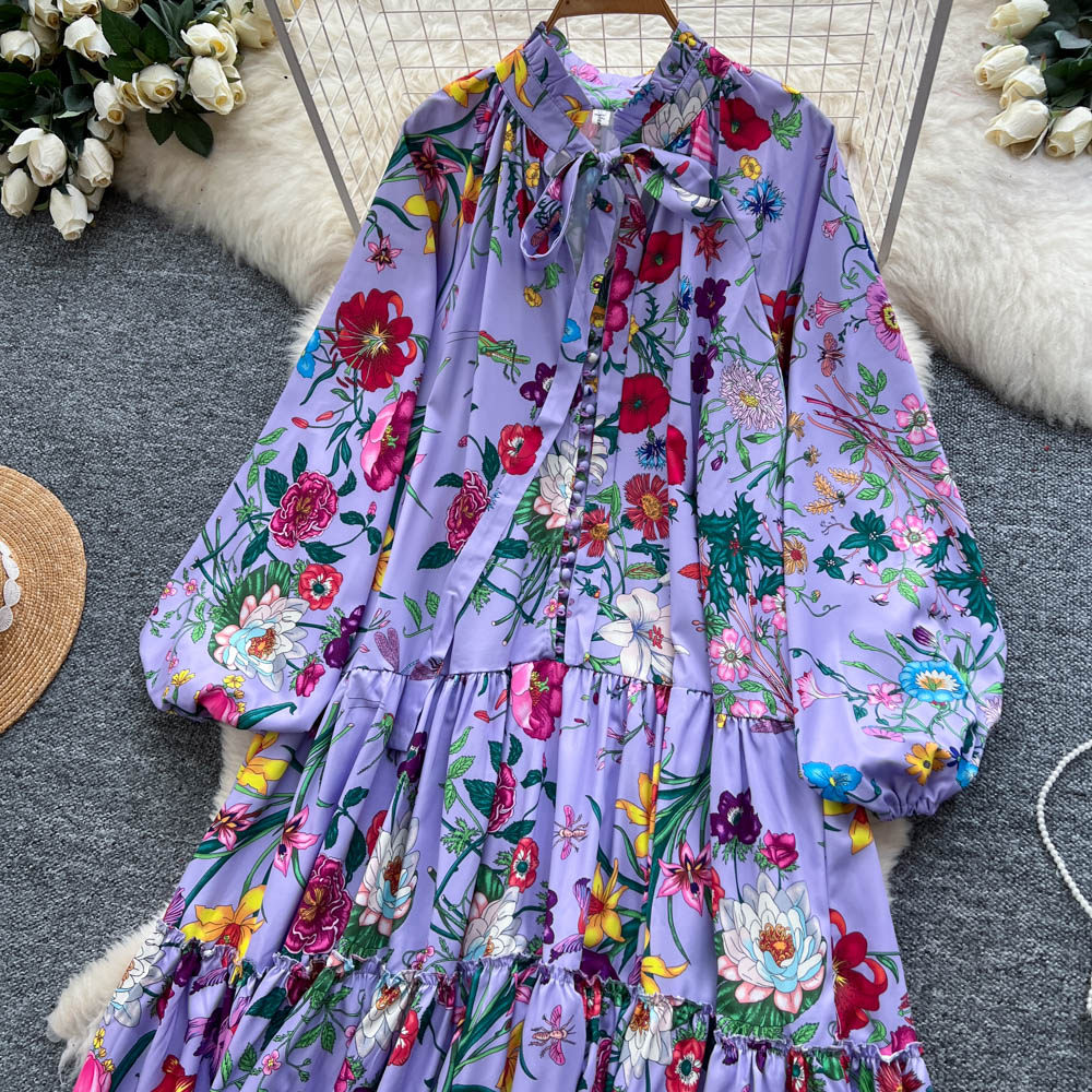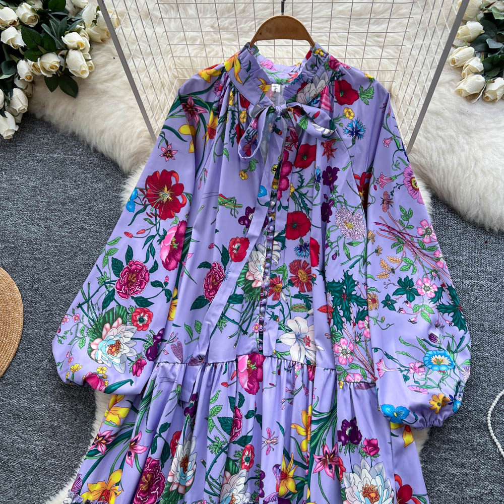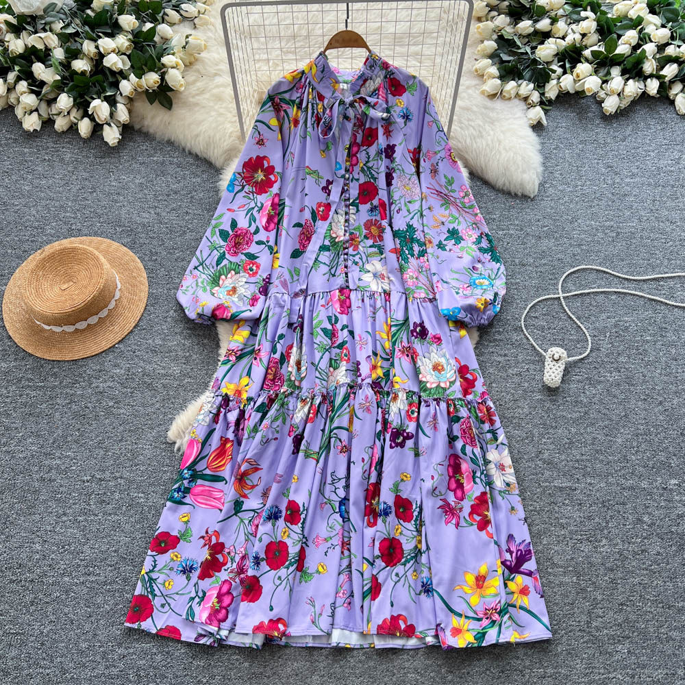 【60%OFF⭐️早い者勝ち】【ワンピース】クラシカル バルーンスリーブ フレンチ リボン付き 花柄 プリント 長袖 ワンピース【SHシリーズ】