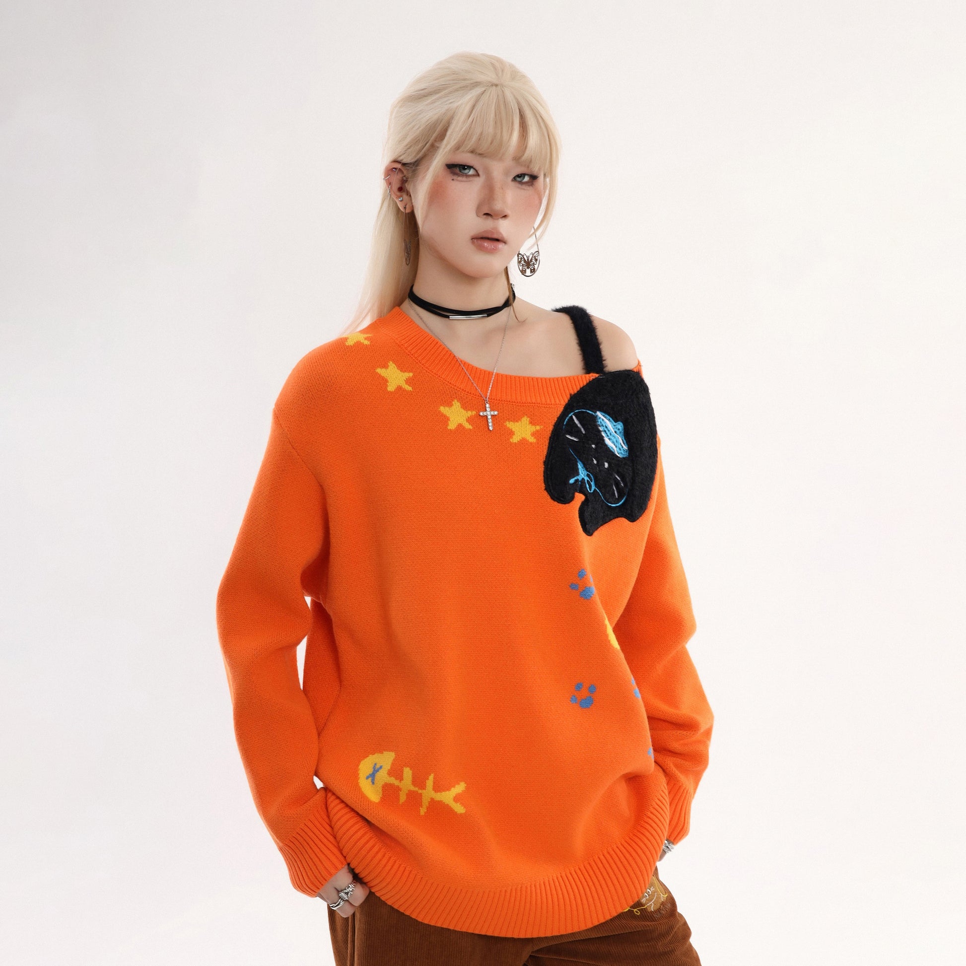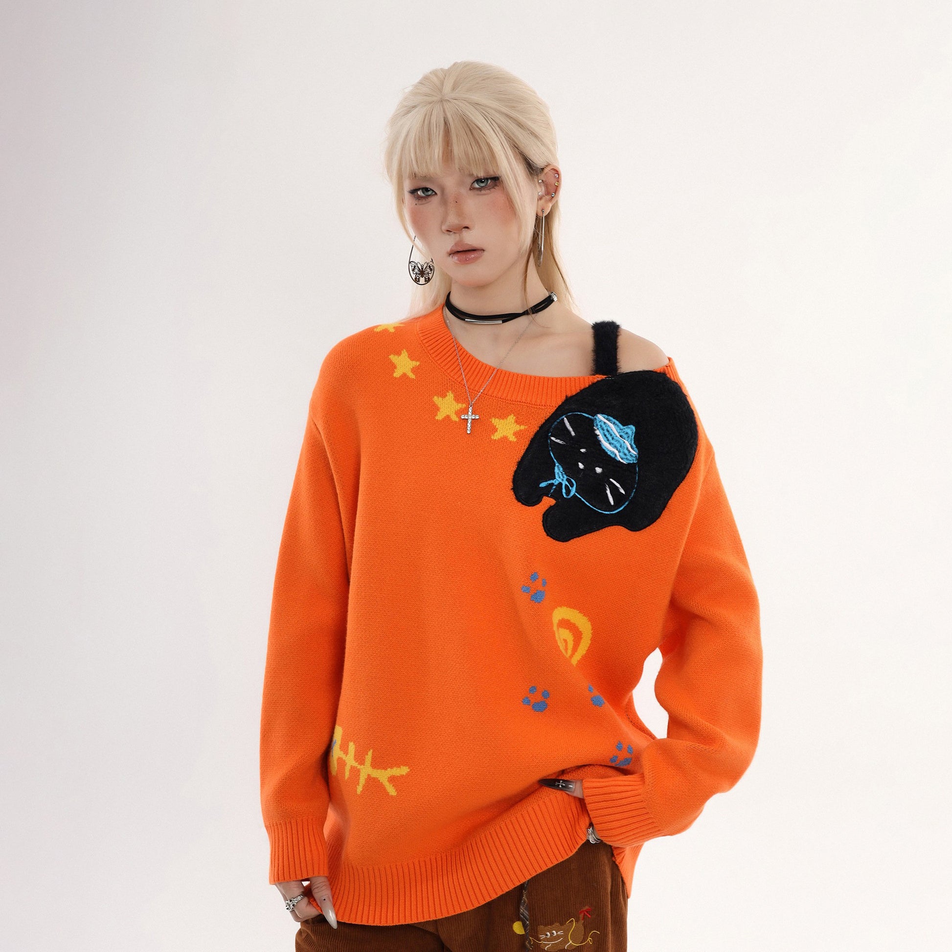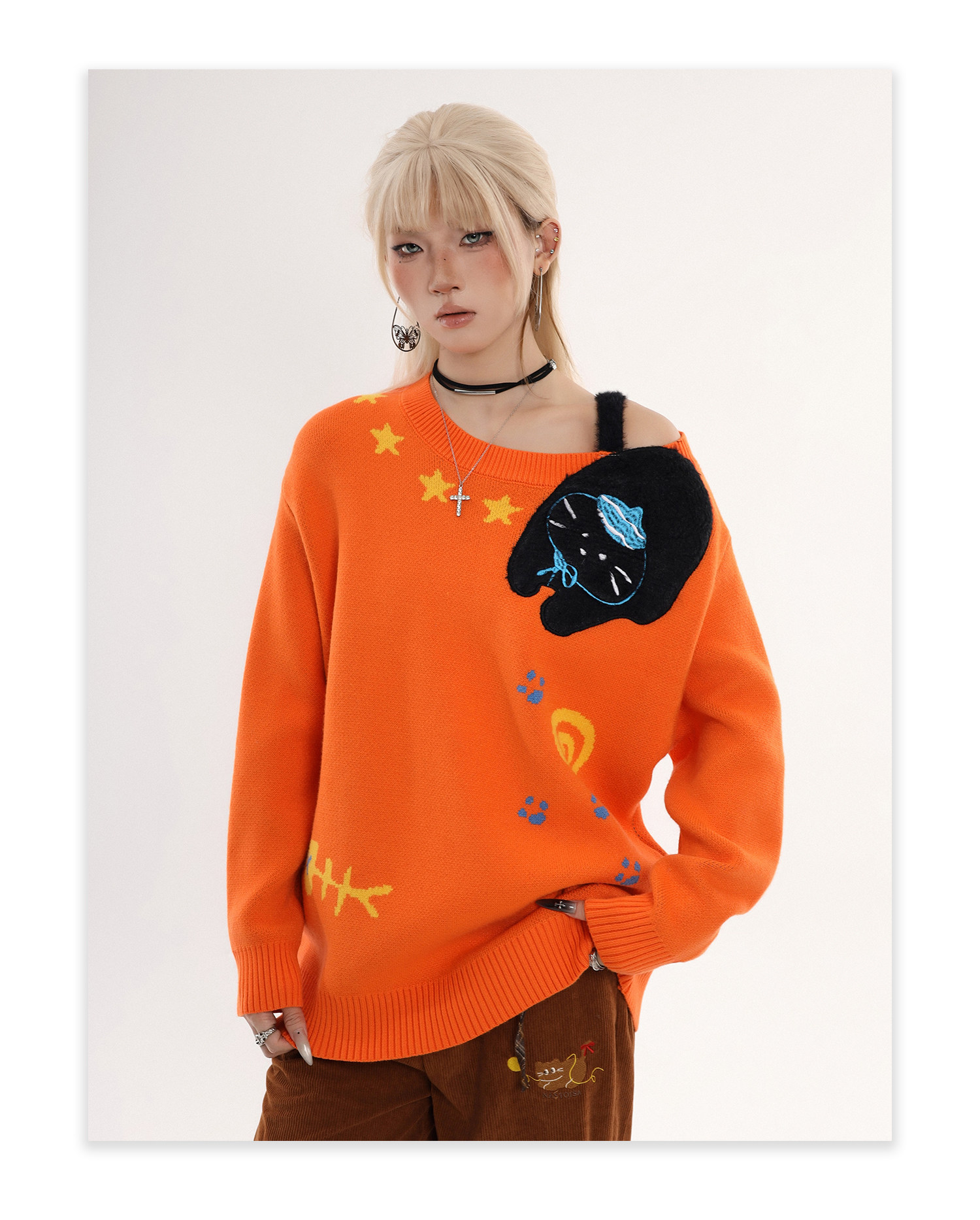 【商品名】【トップス】アメリカンカジュアル 猫刺繍 オフショルダーニット 秋冬 オレンジ ゆったり レイジー感 セーター【FCシリーズ】