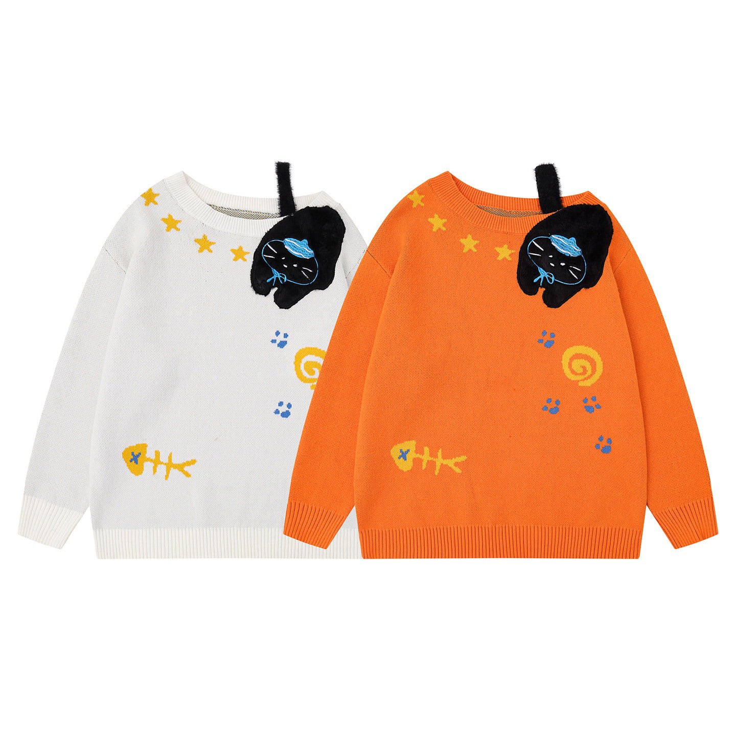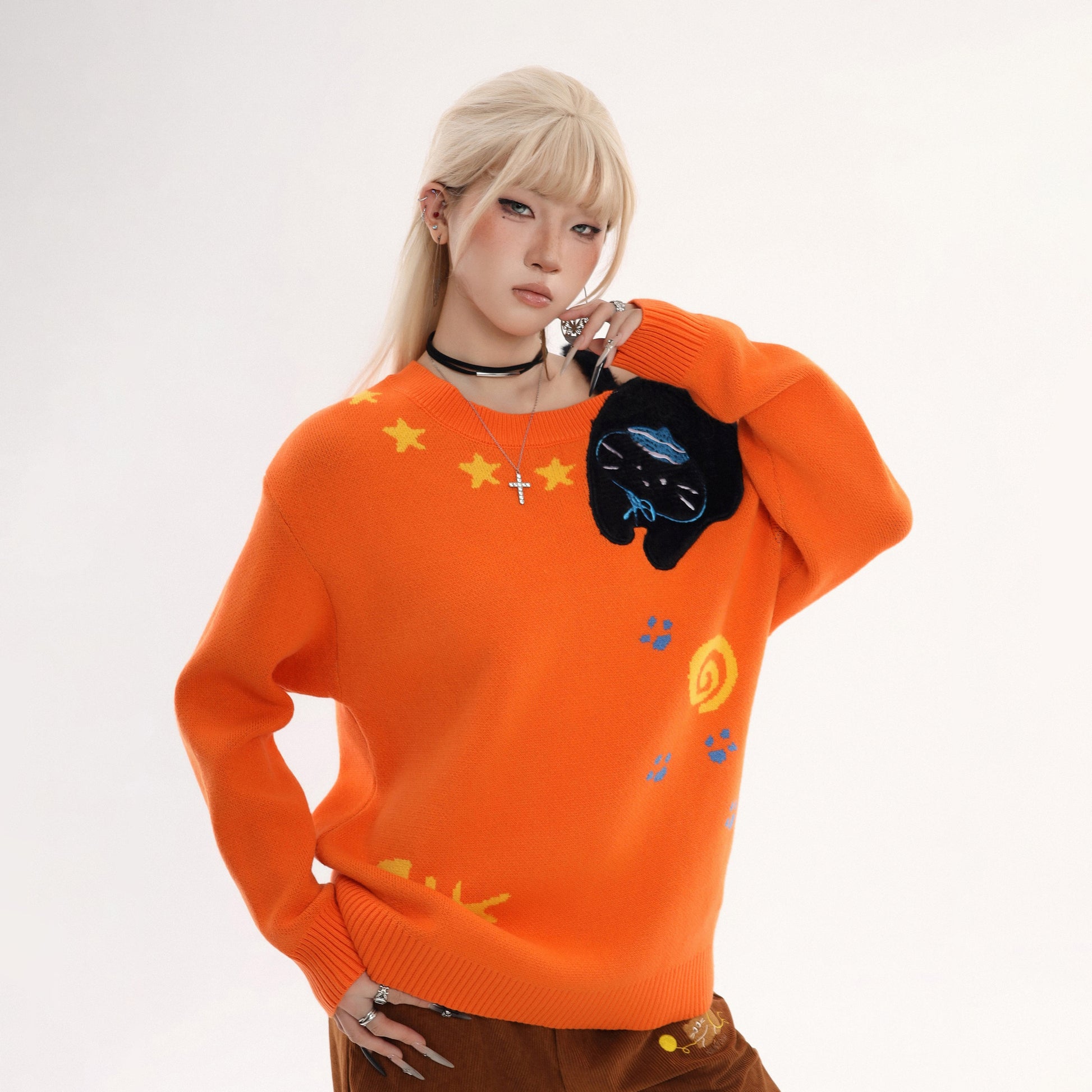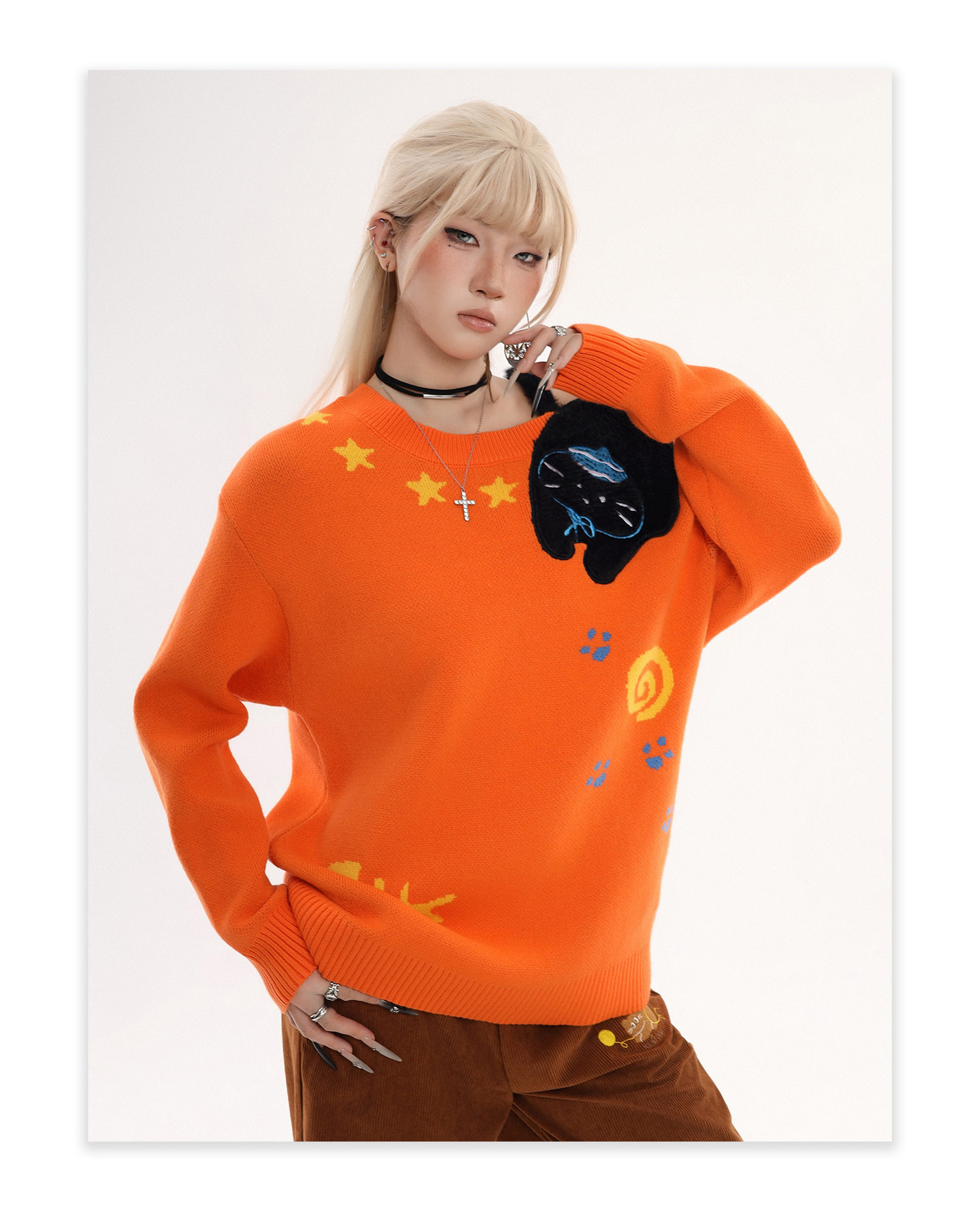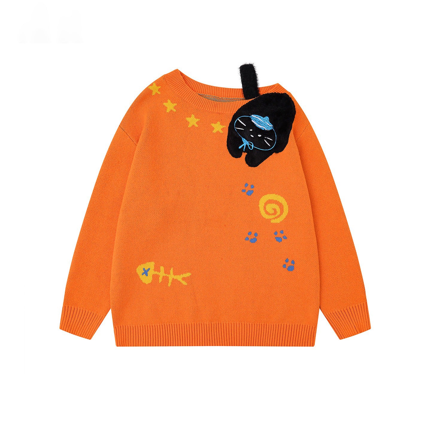 【商品名】【トップス】アメリカンカジュアル 猫刺繍 オフショルダーニット 秋冬 オレンジ ゆったり レイジー感 セーター【FCシリーズ】