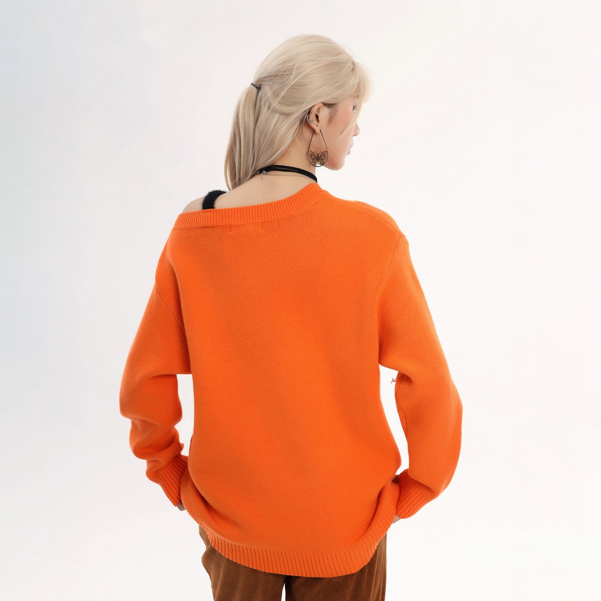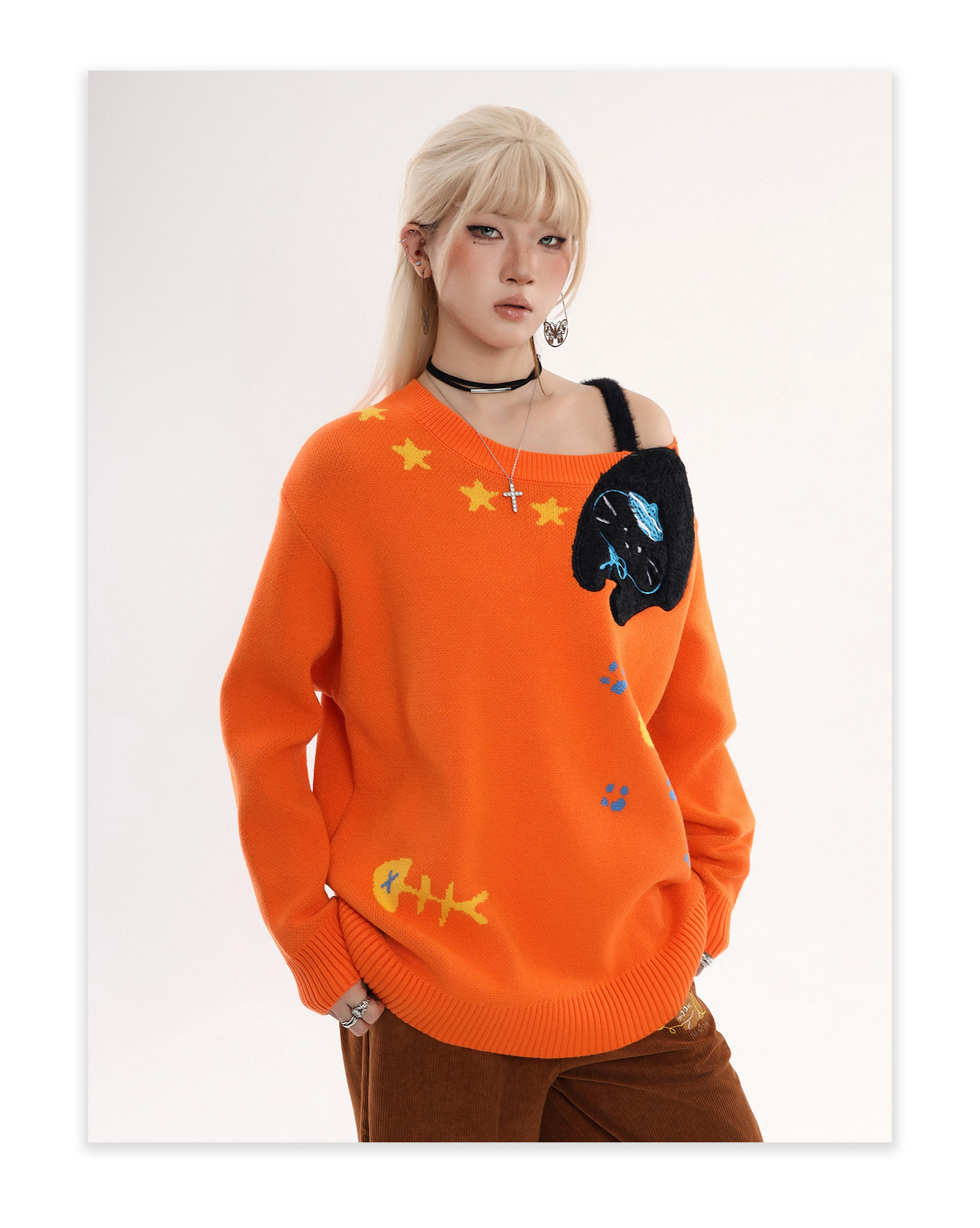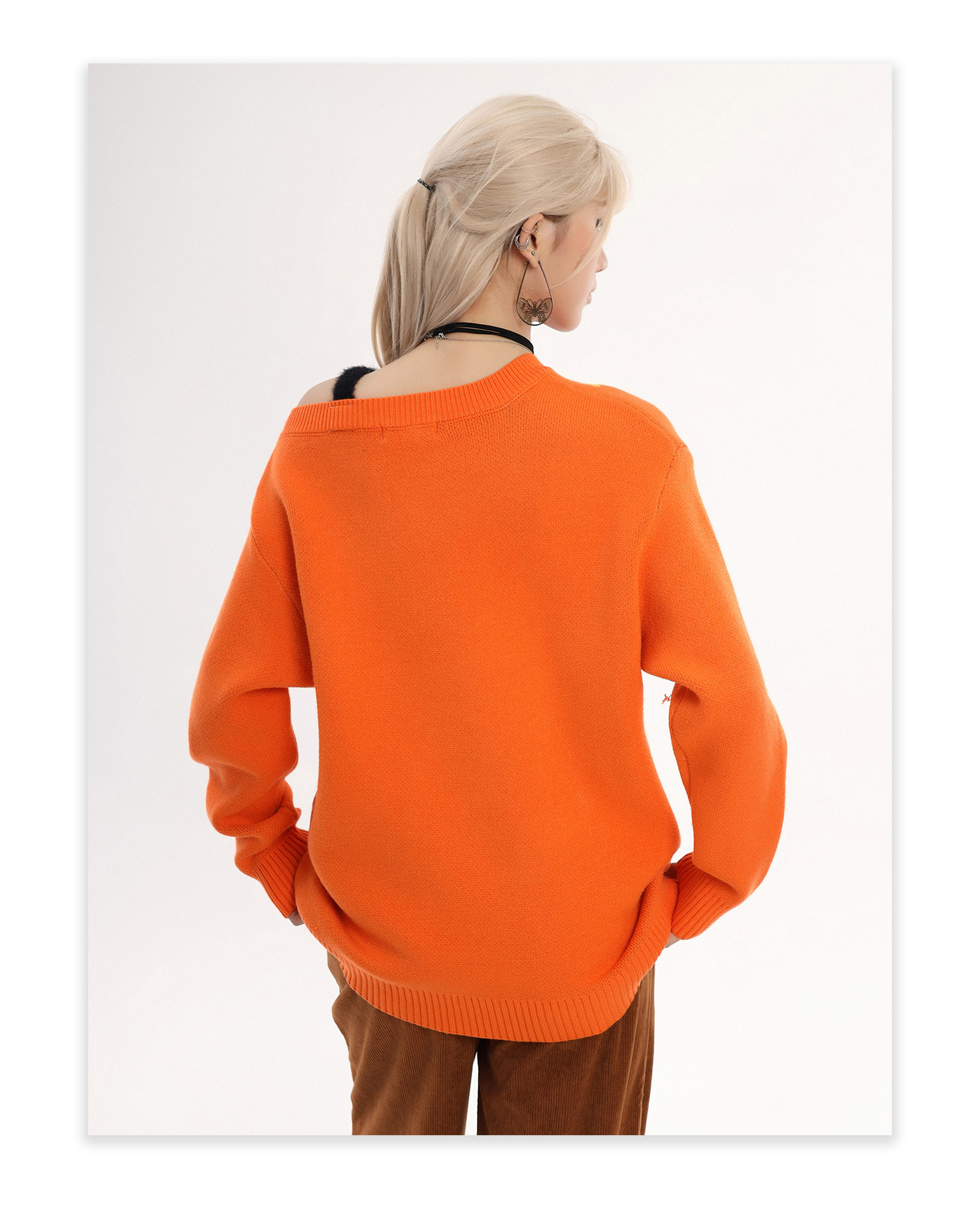 【トップス】アメリカンカジュアル 猫刺繍 オフショルダーニット 秋冬 オレンジ ゆったり レイジー感 セーター【FCシリーズ】