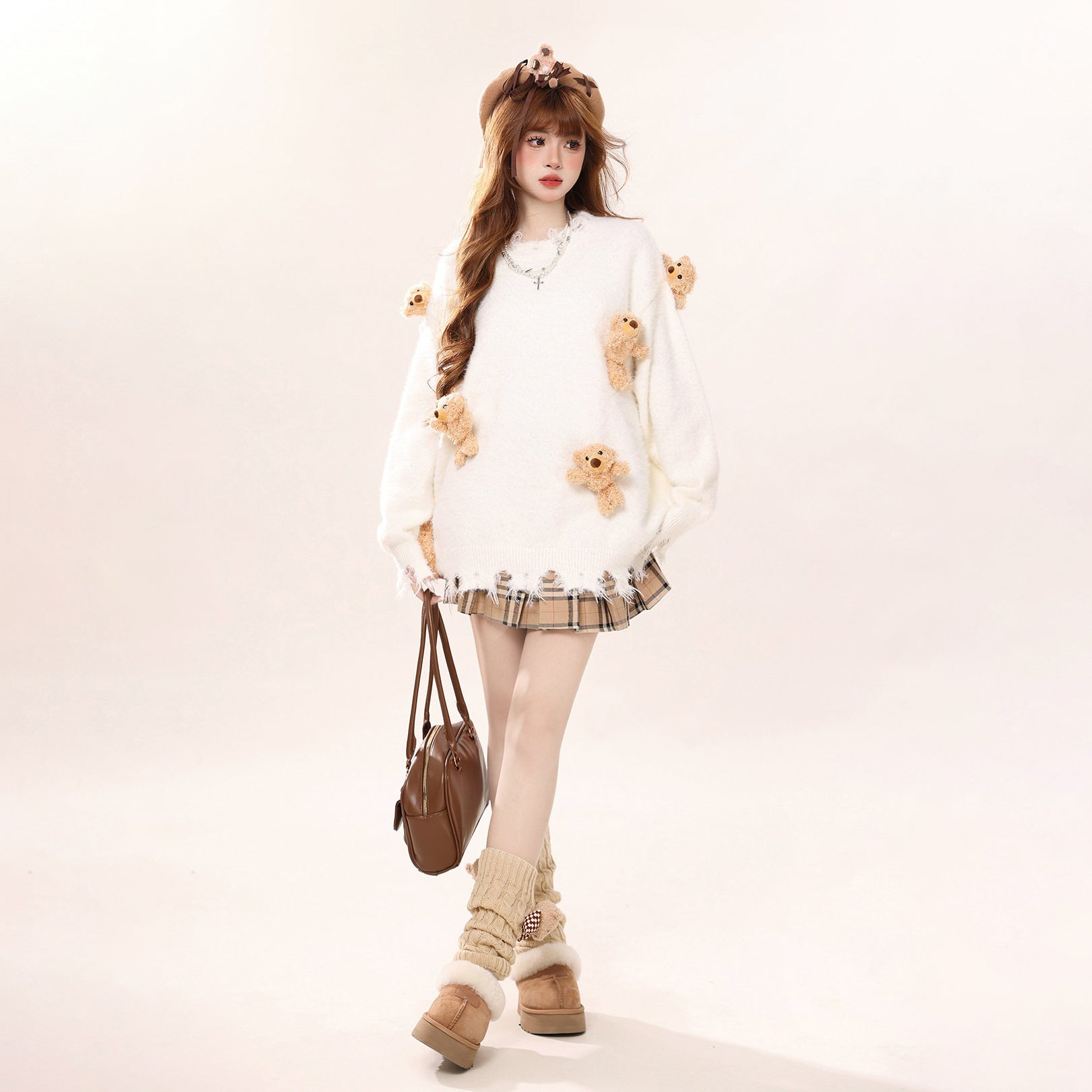 【商品名】【トップス】ベアドール モチーフ カレッジ風 ニットセーター ユニセックス アメリカンレトロ デザイン カップル向け ニット【FCシリーズ】