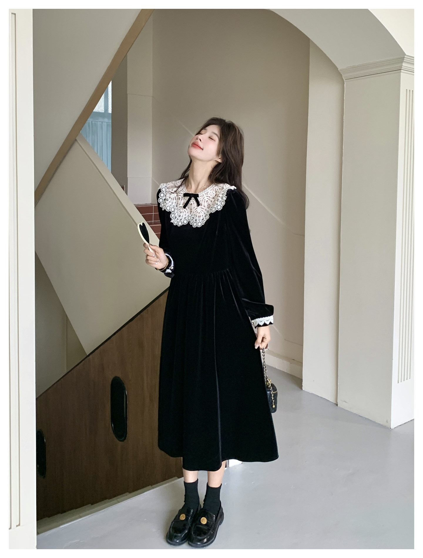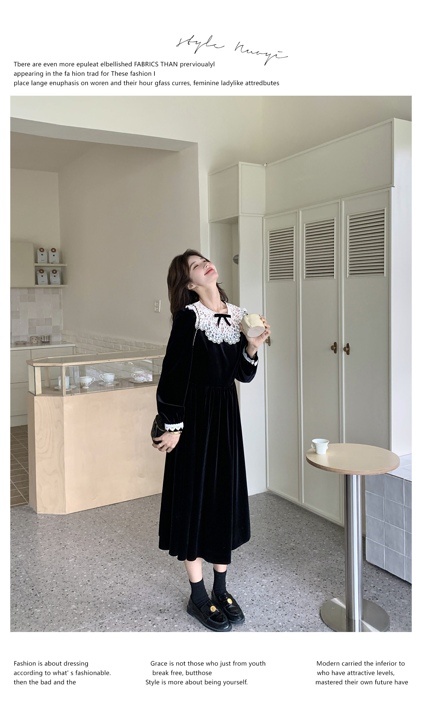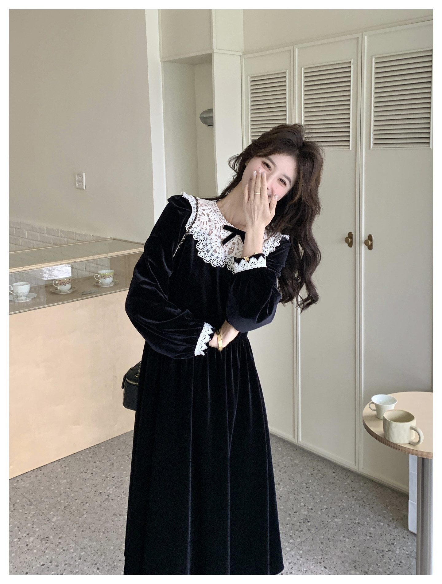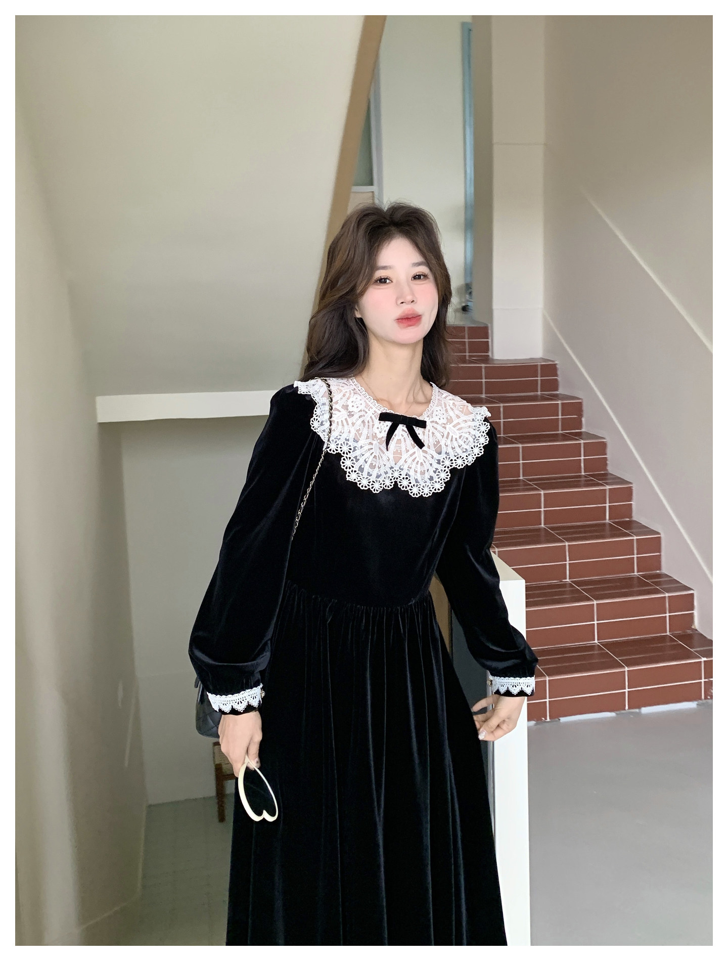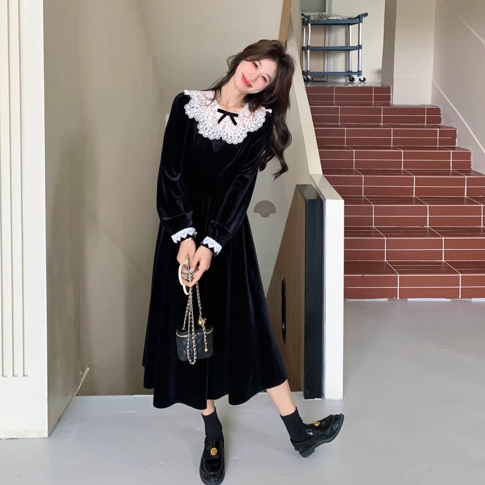 【商品名】【ワンピース】オードリー風 レース 長袖ワンピース レディース 秋冬 上品 レトロ 細見え ロングドレス【JZシリーズ】