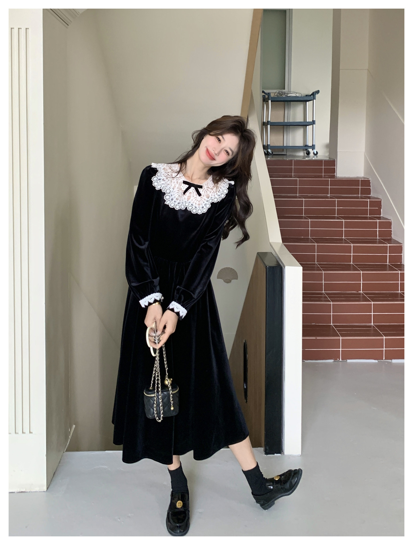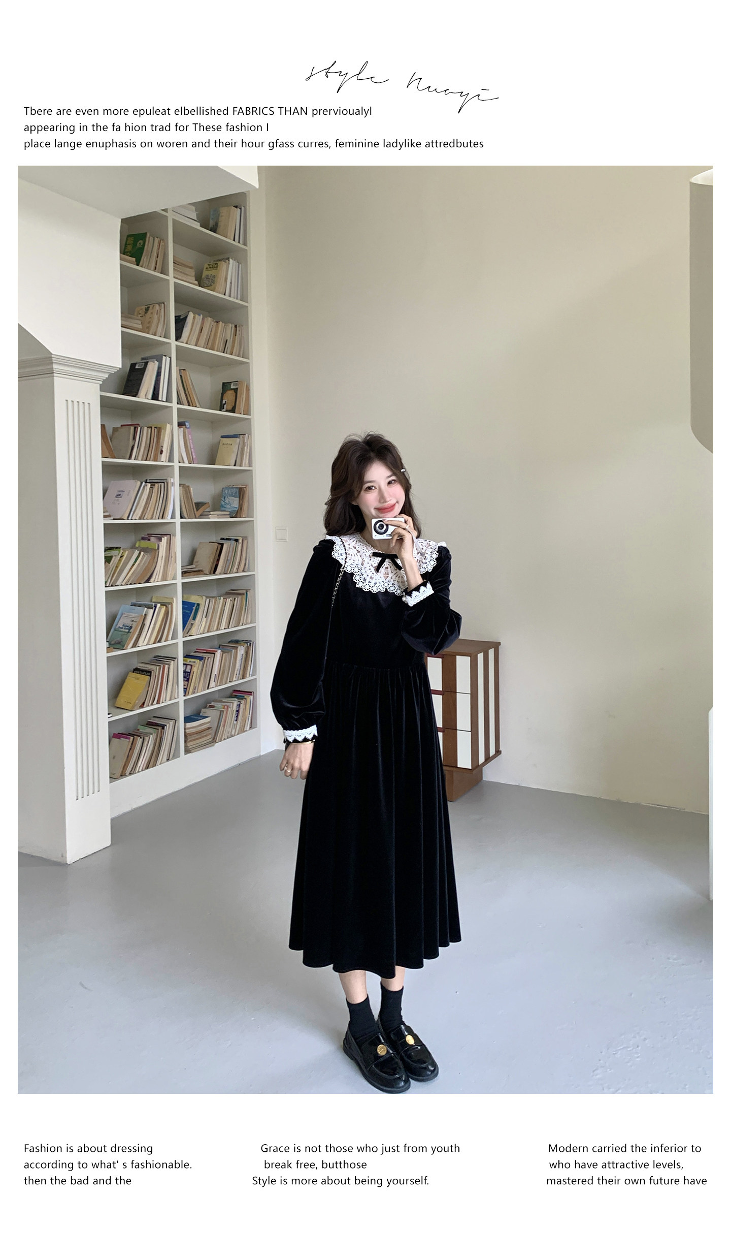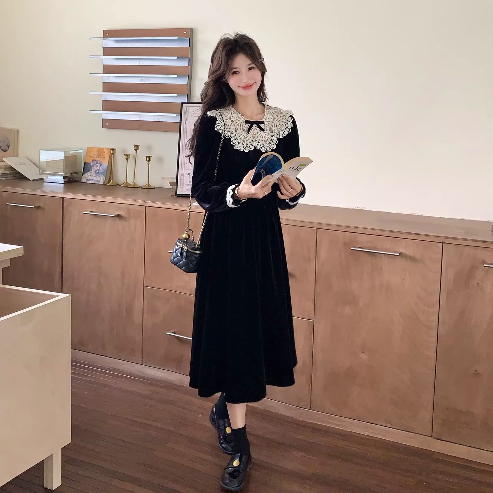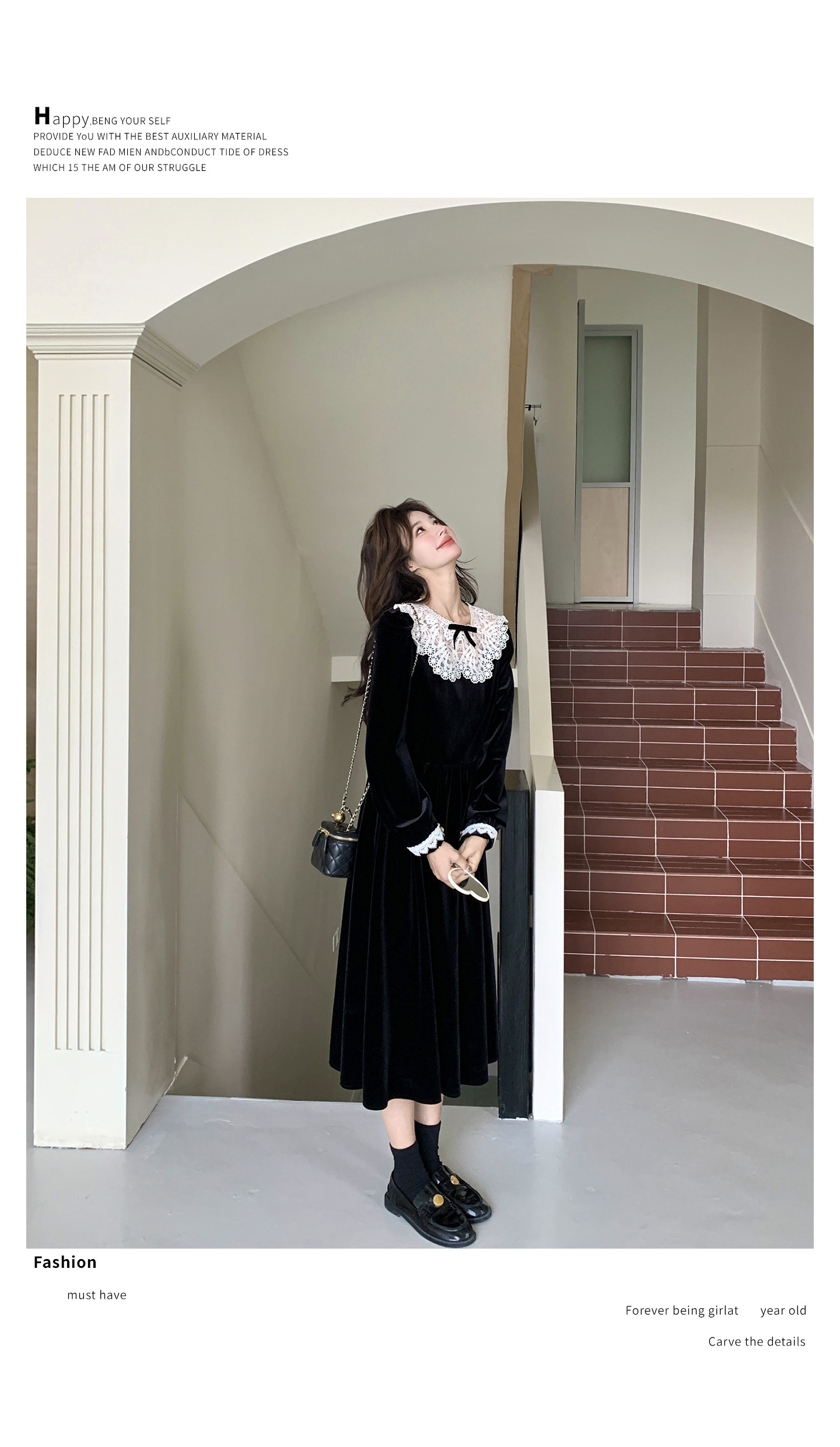 【商品名】【ワンピース】オードリー風 レース 長袖ワンピース レディース 秋冬 上品 レトロ 細見え ロングドレス【JZシリーズ】