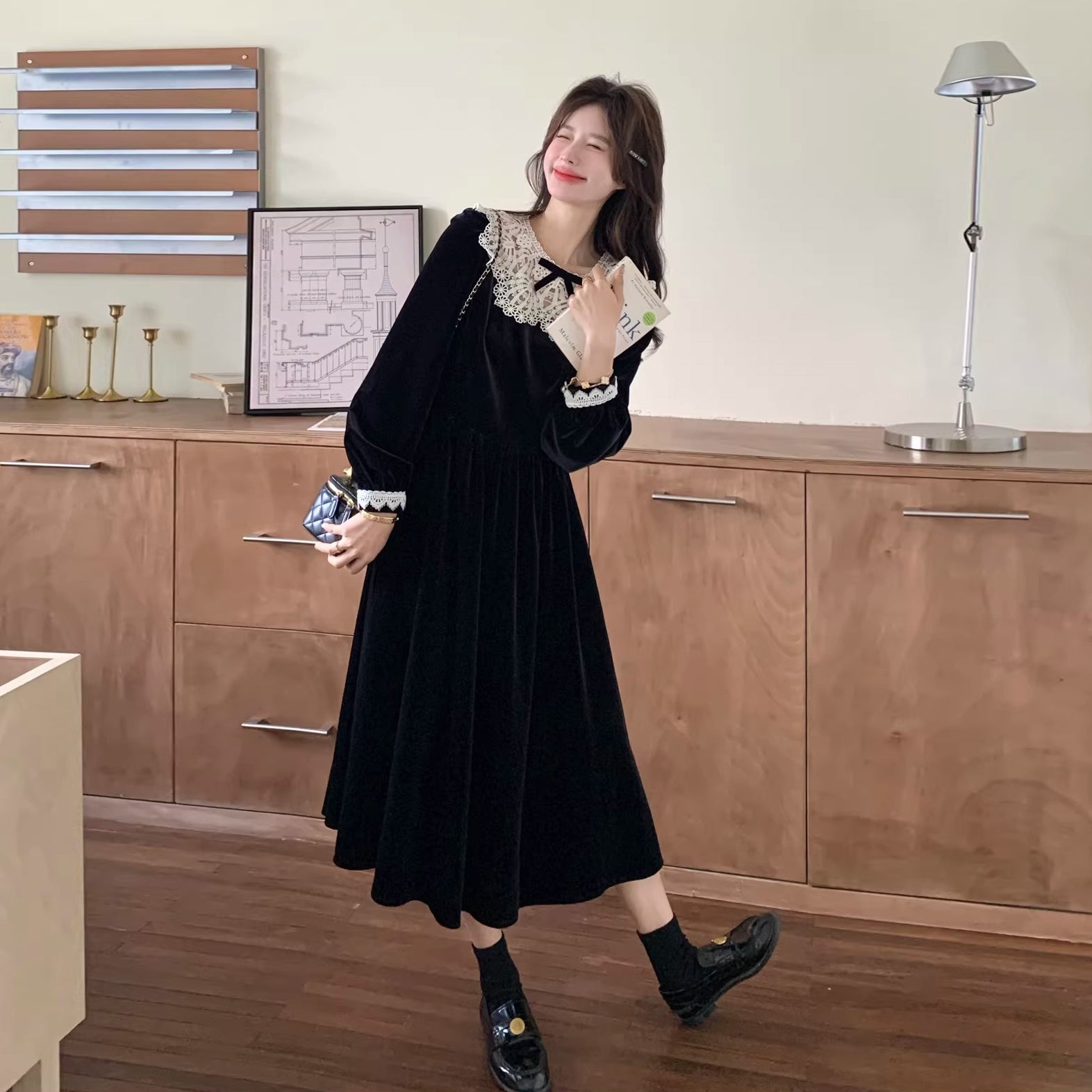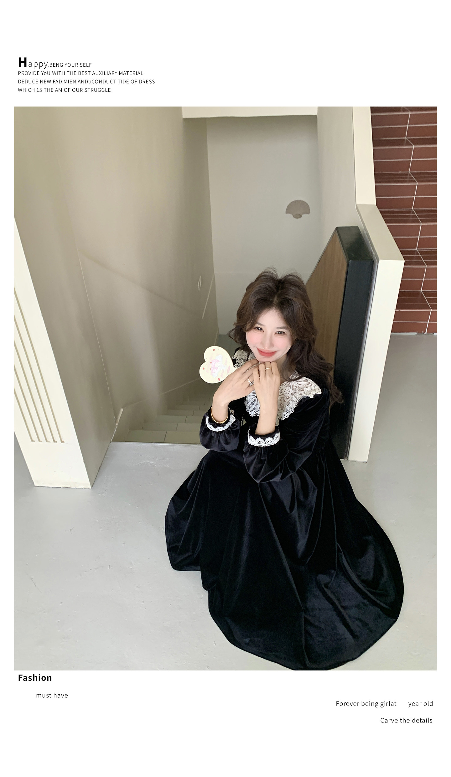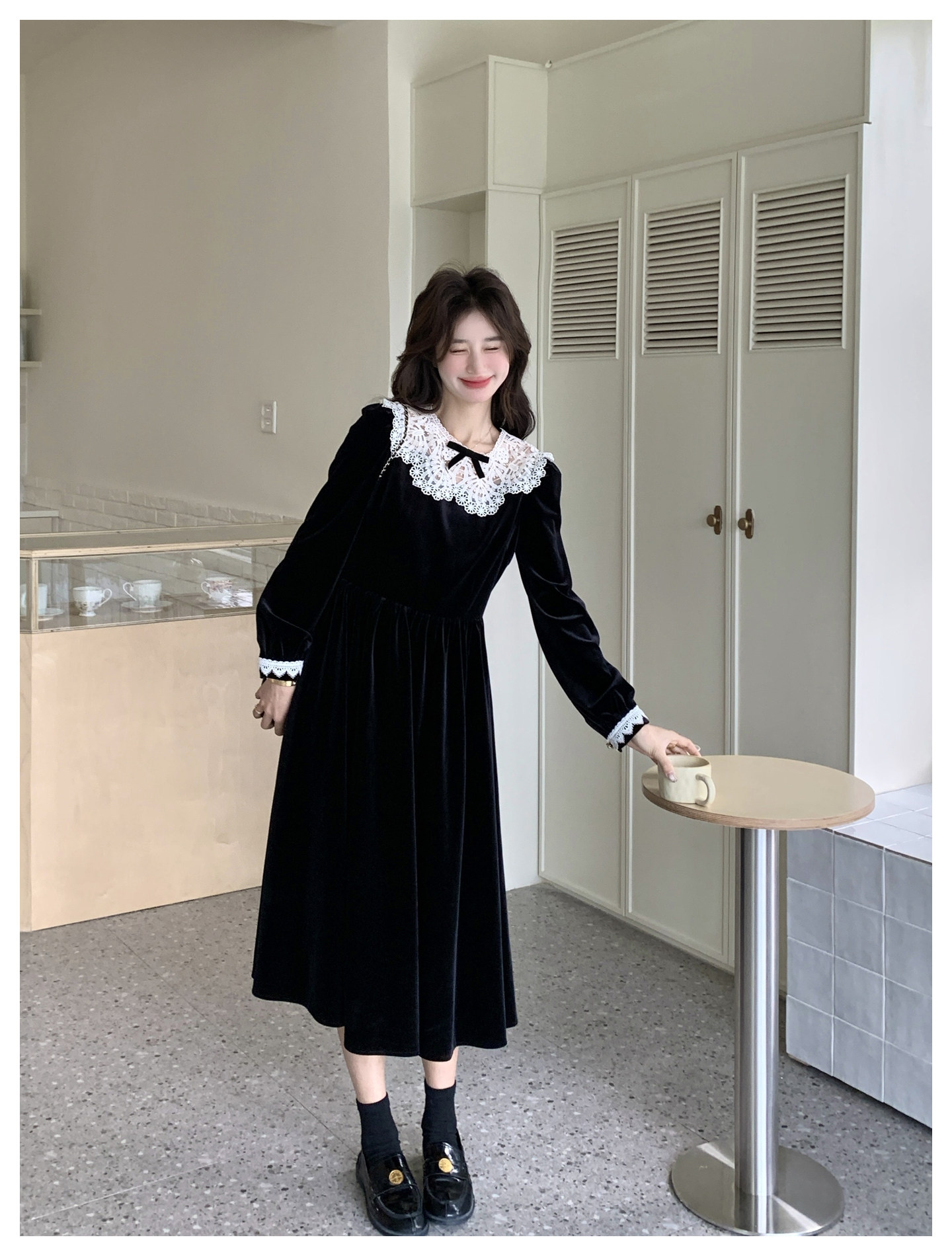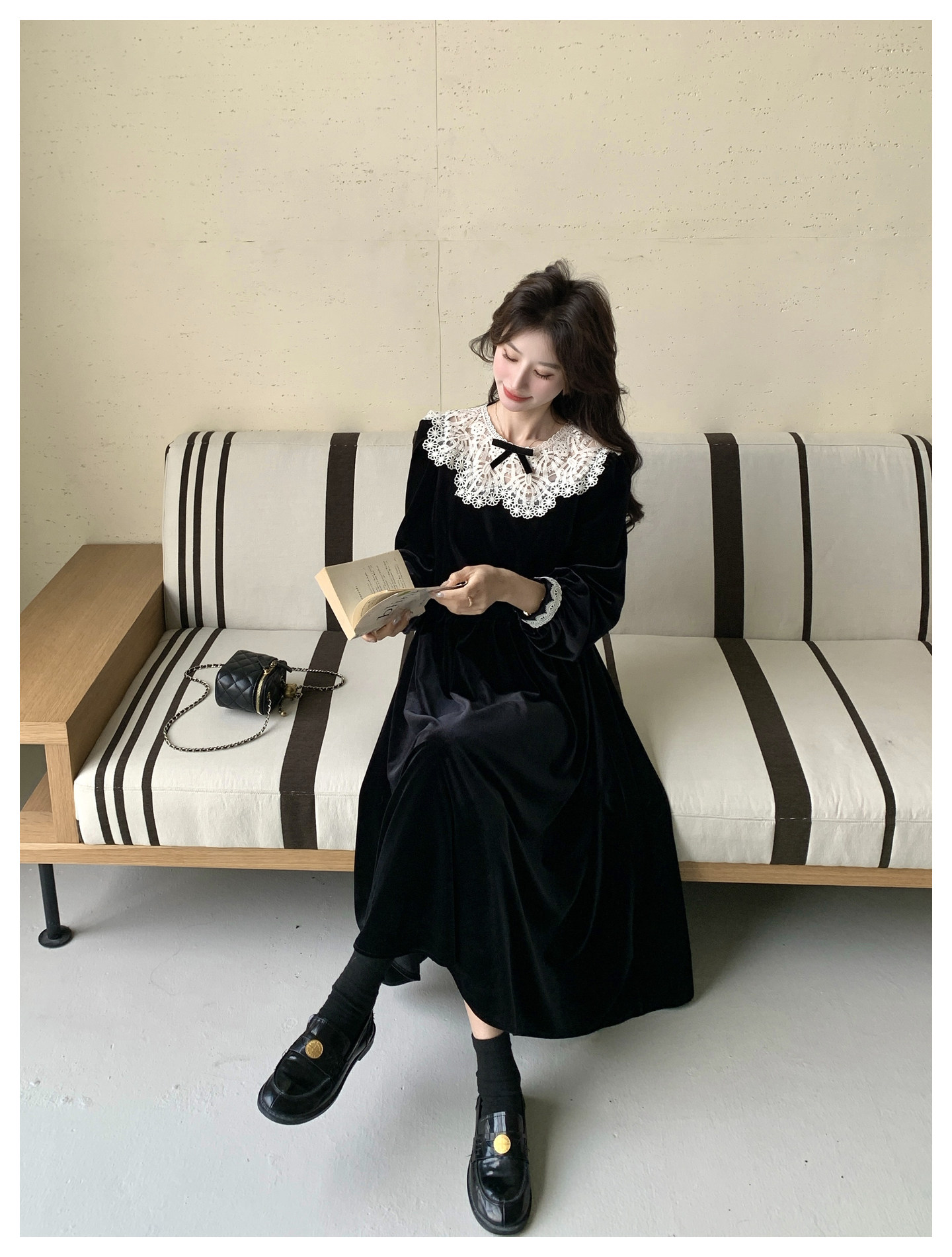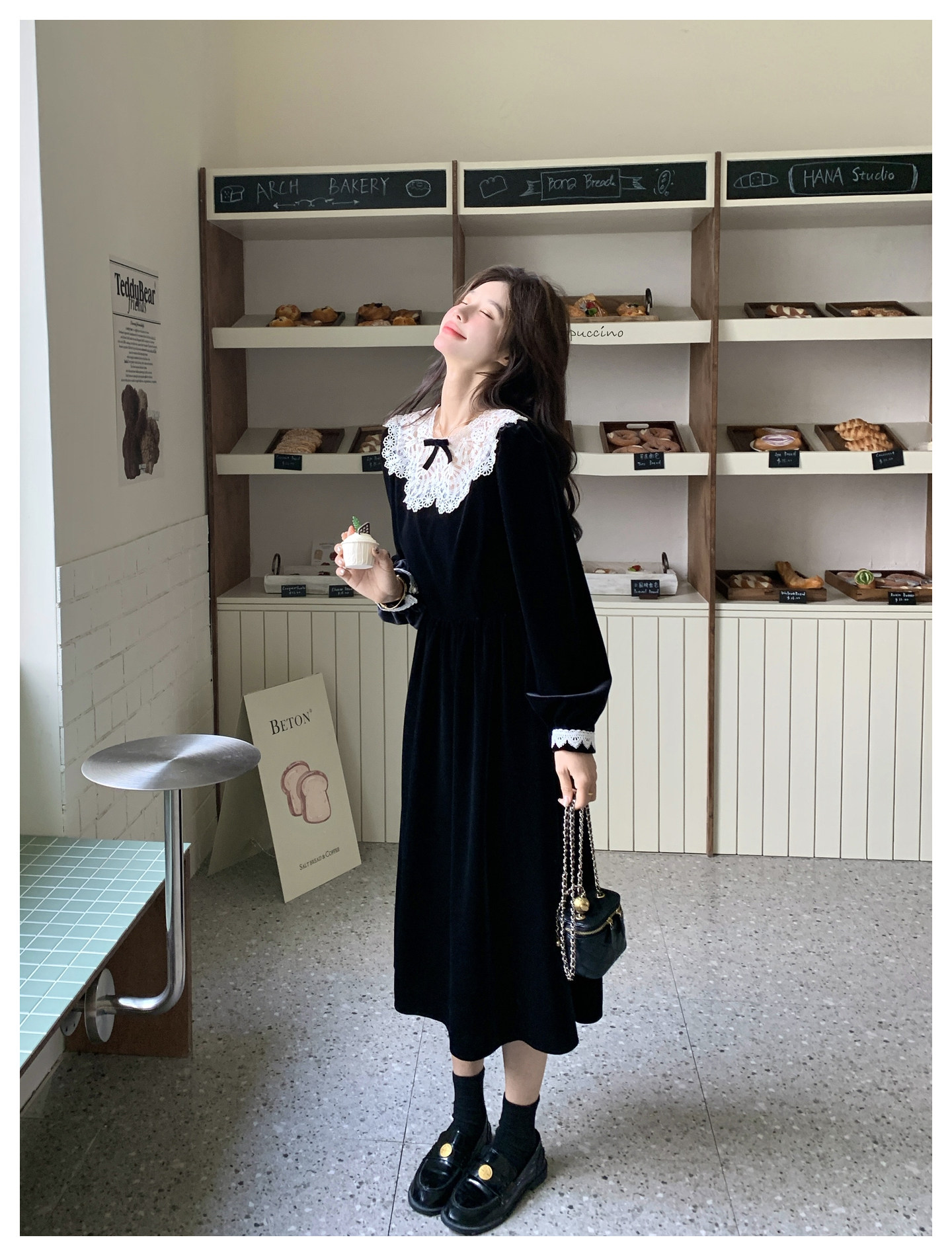 【商品名】【ワンピース】オードリー風 レース 長袖ワンピース レディース 秋冬 上品 レトロ 細見え ロングドレス【JZシリーズ】