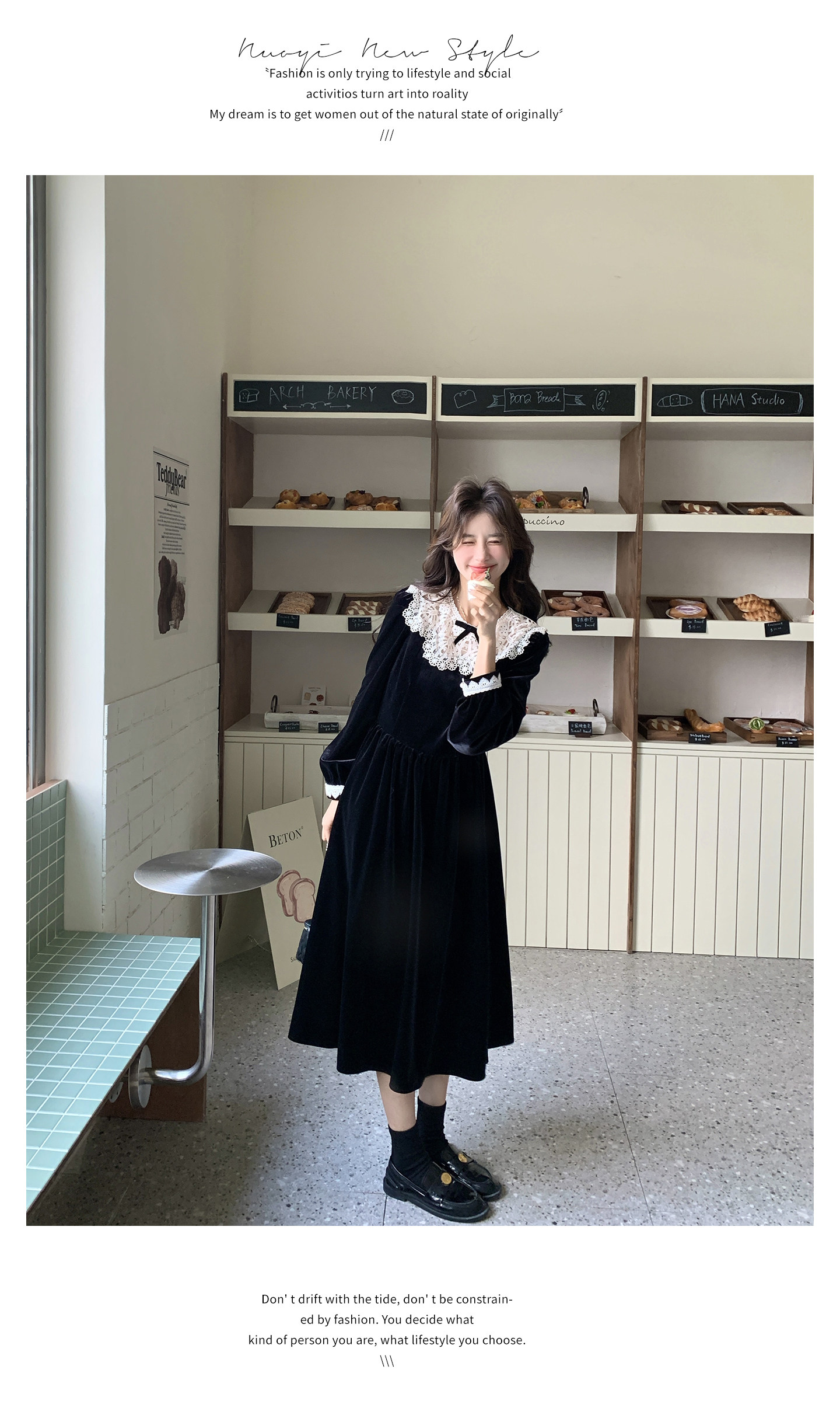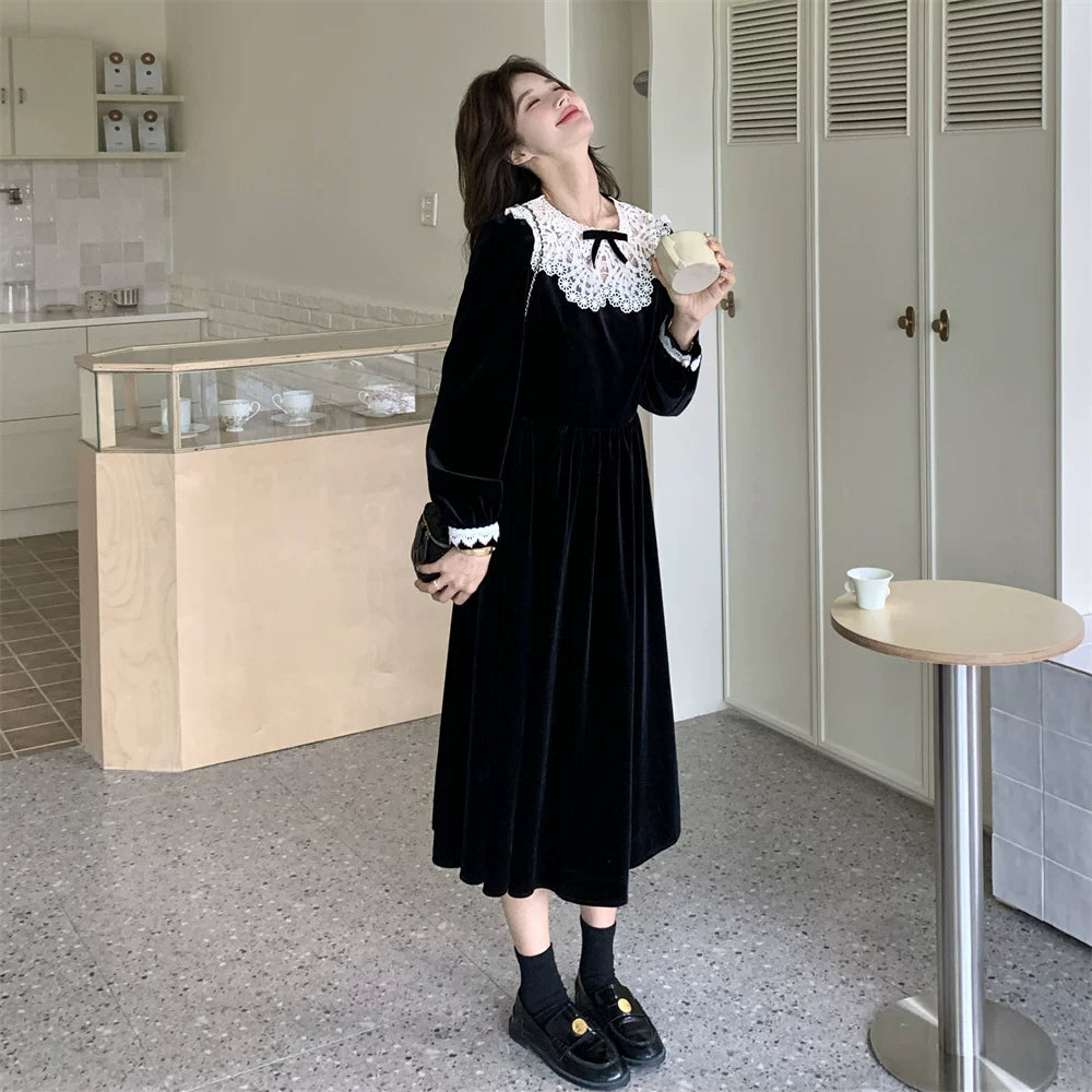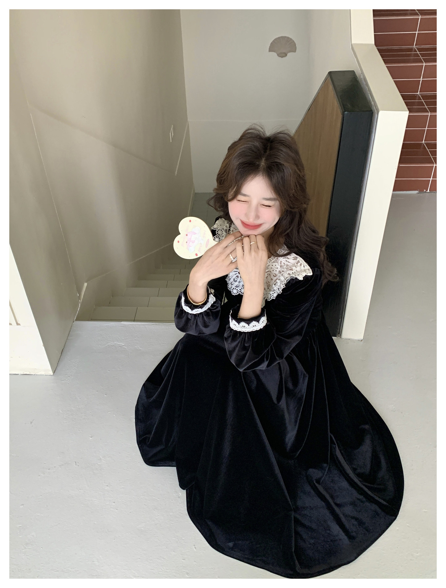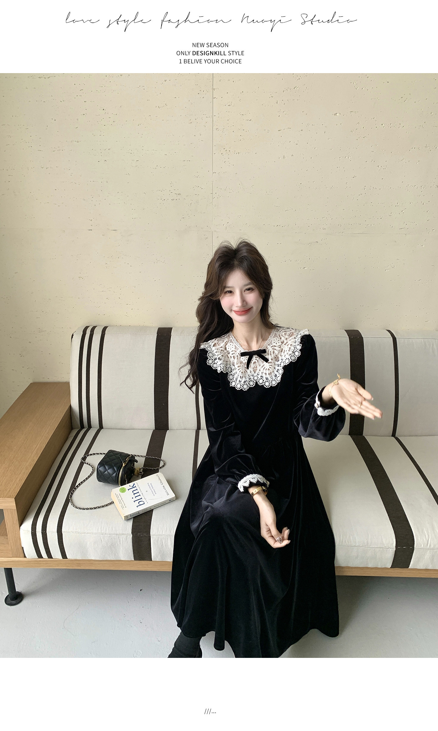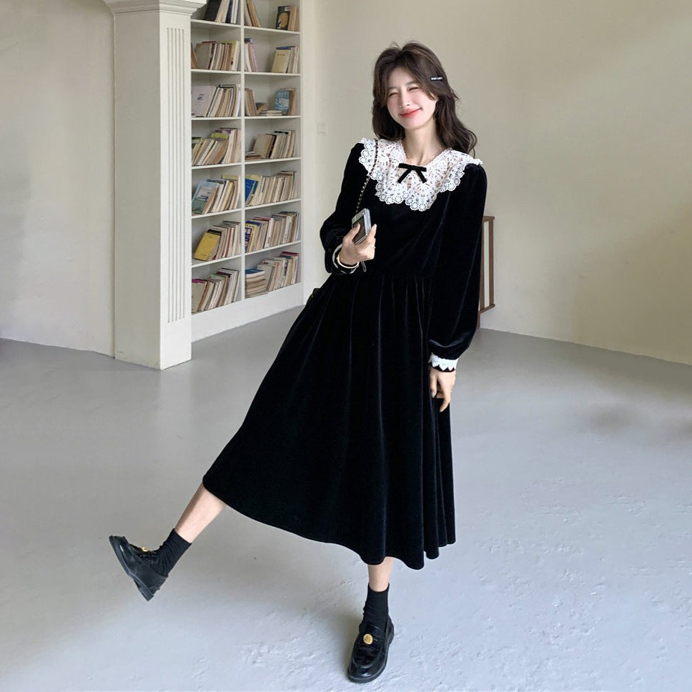 【商品名】【ワンピース】オードリー風 レース 長袖ワンピース レディース 秋冬 上品 レトロ 細見え ロングドレス【JZシリーズ】