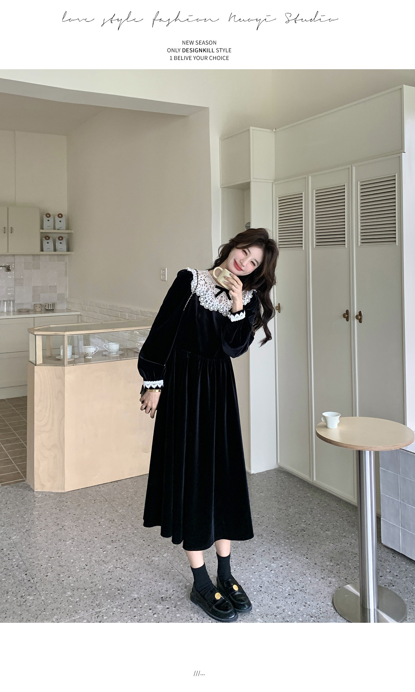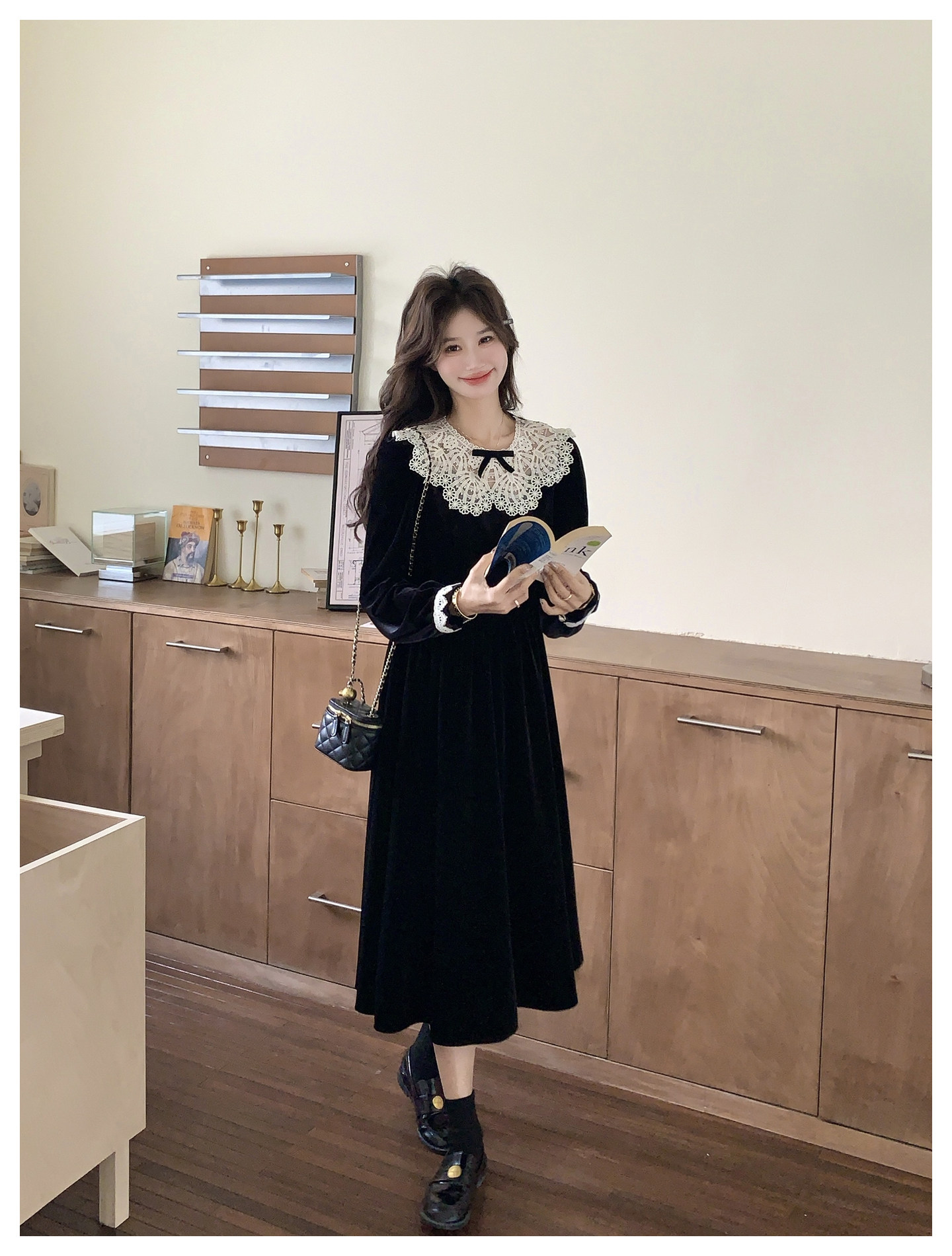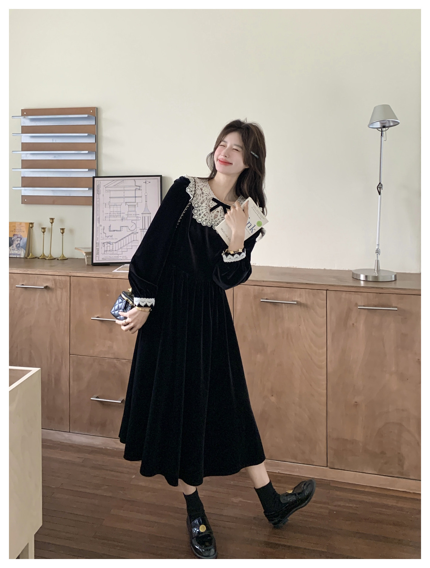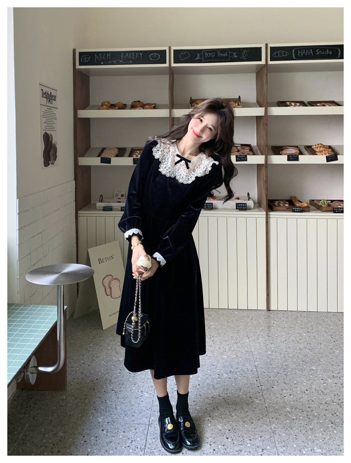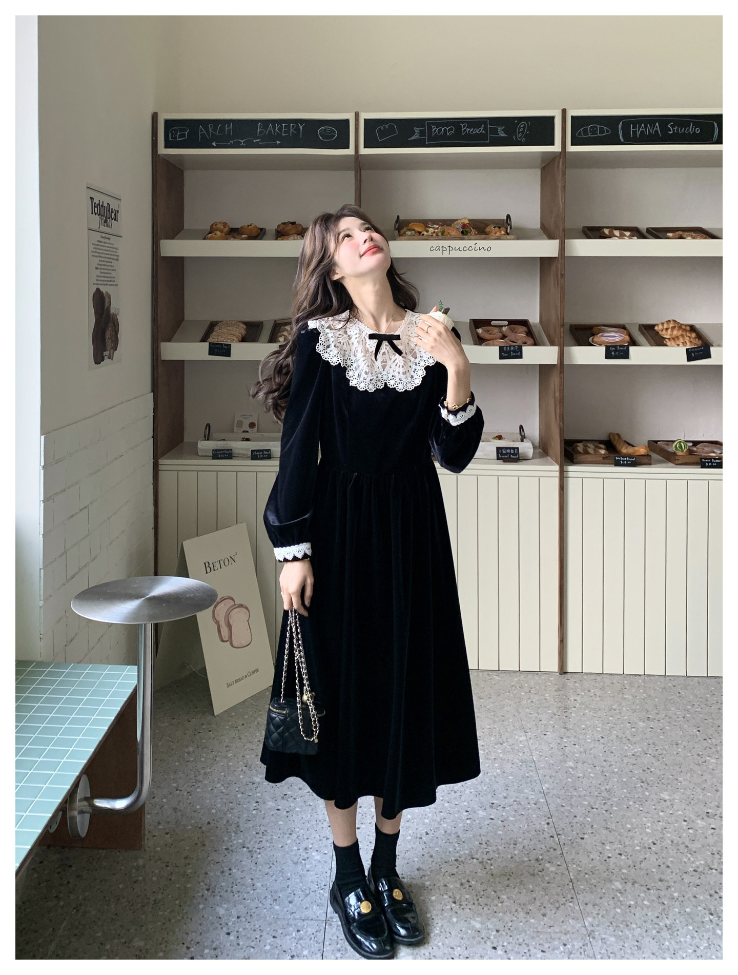 【商品名】【ワンピース】オードリー風 レース 長袖ワンピース レディース 秋冬 上品 レトロ 細見え ロングドレス【JZシリーズ】
