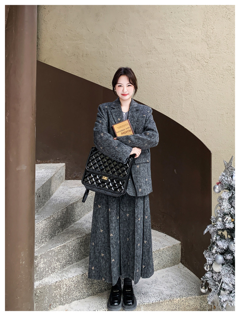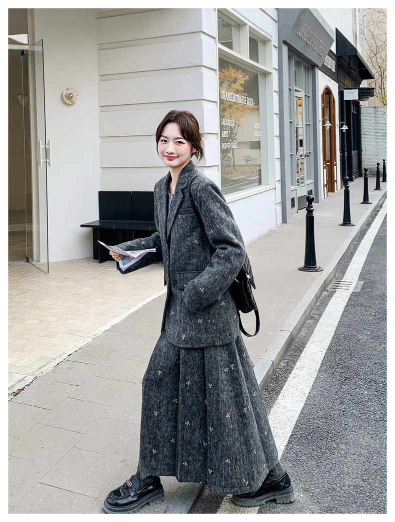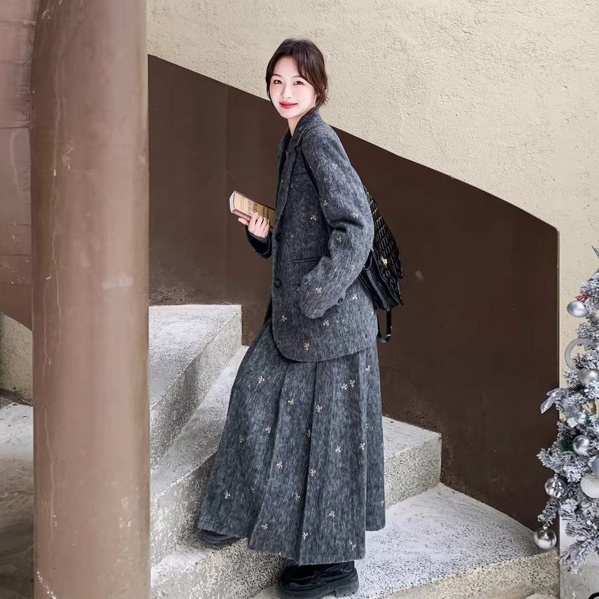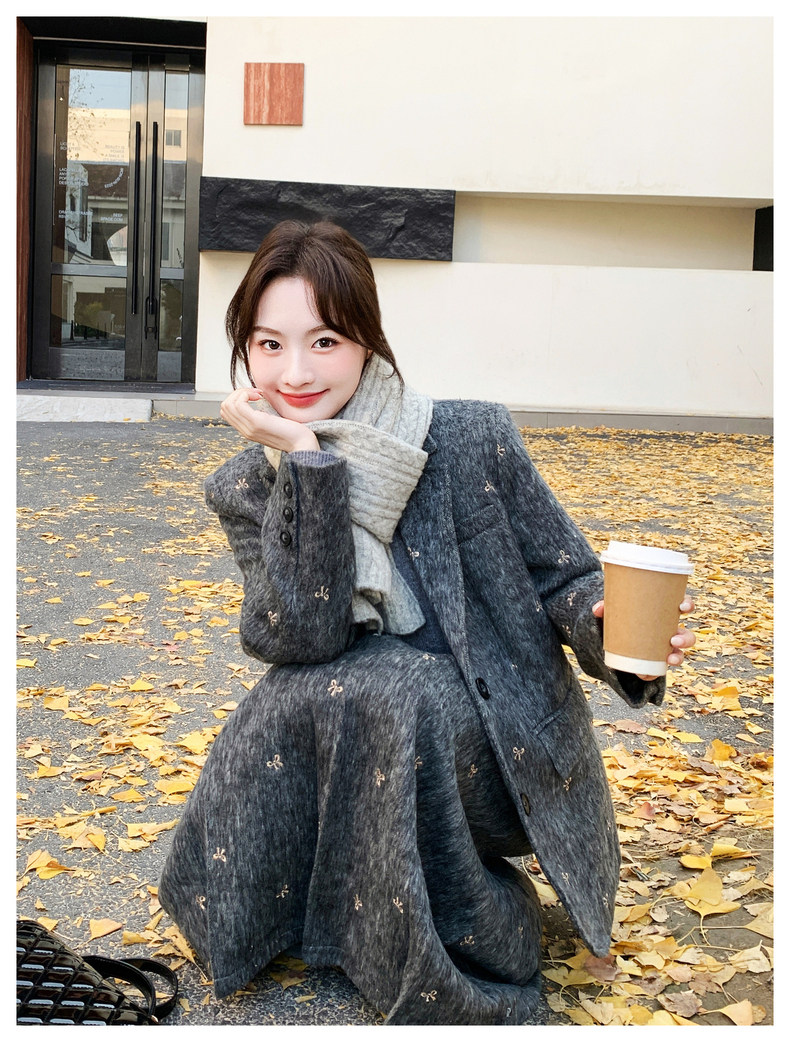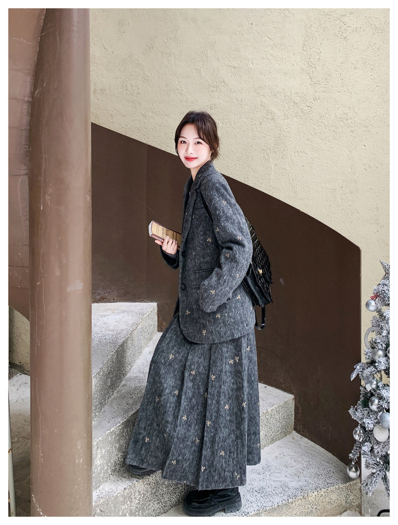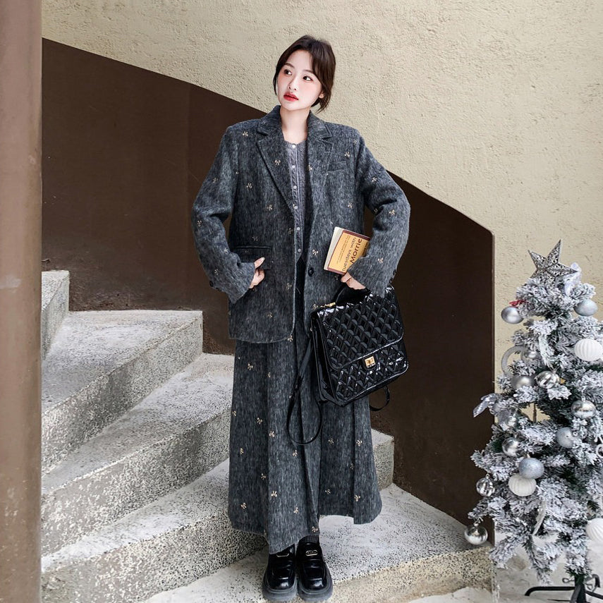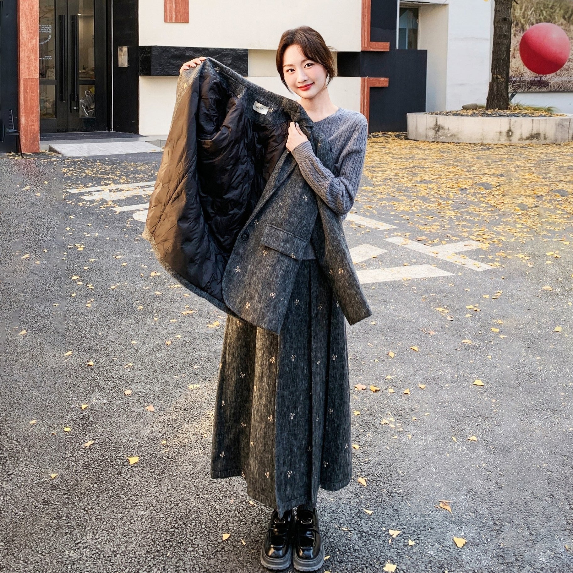 【セットアップ】刺繍入り ウール風 ブレンド ダウンジャケット&スカート 上下セット 秋冬 ダウンコート【SHシリーズ】【10~15日内発送】