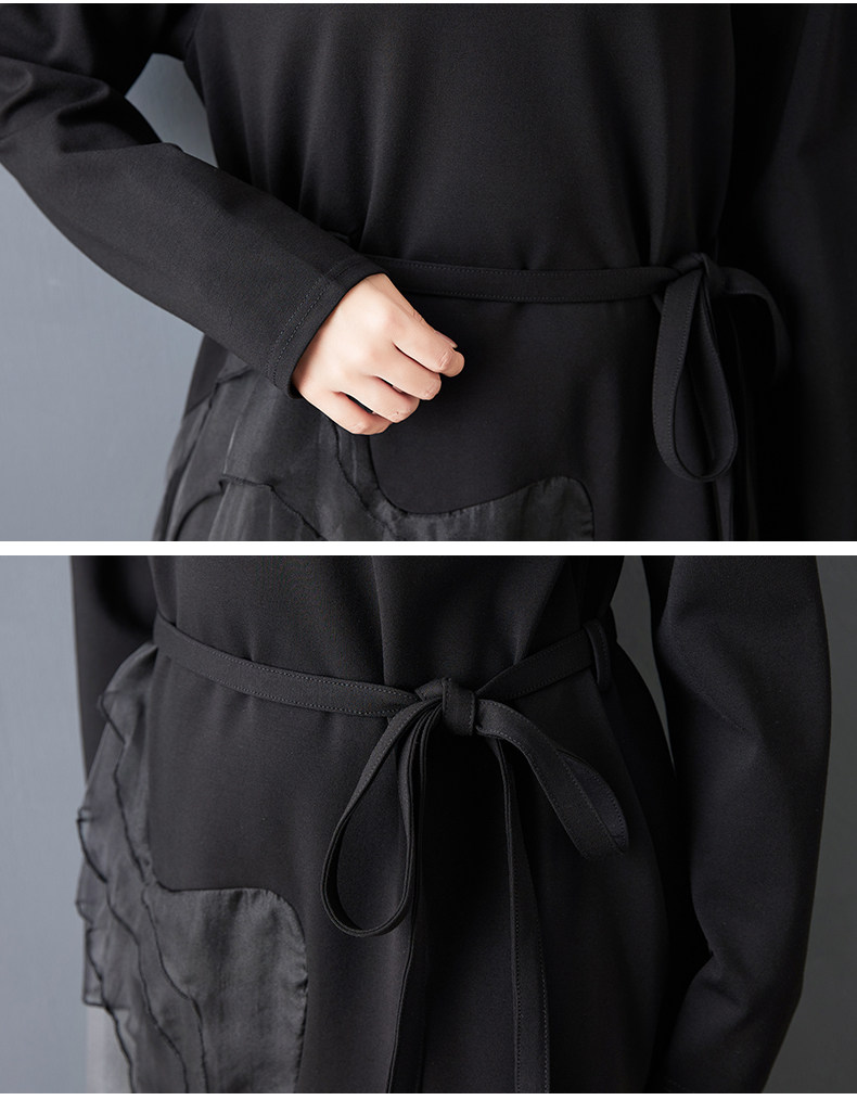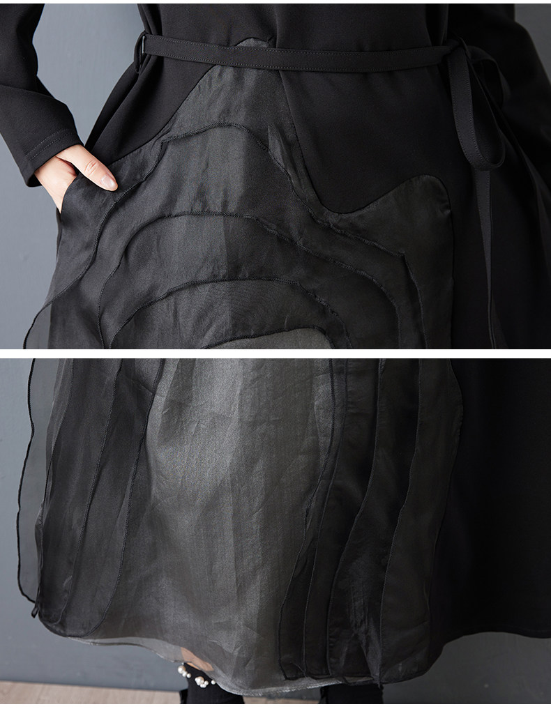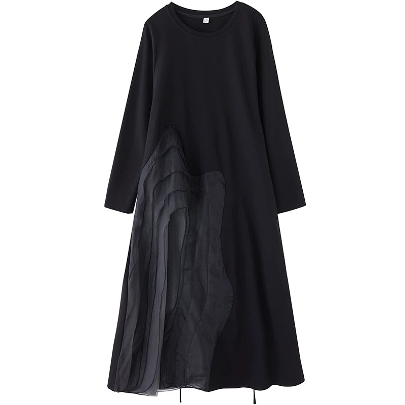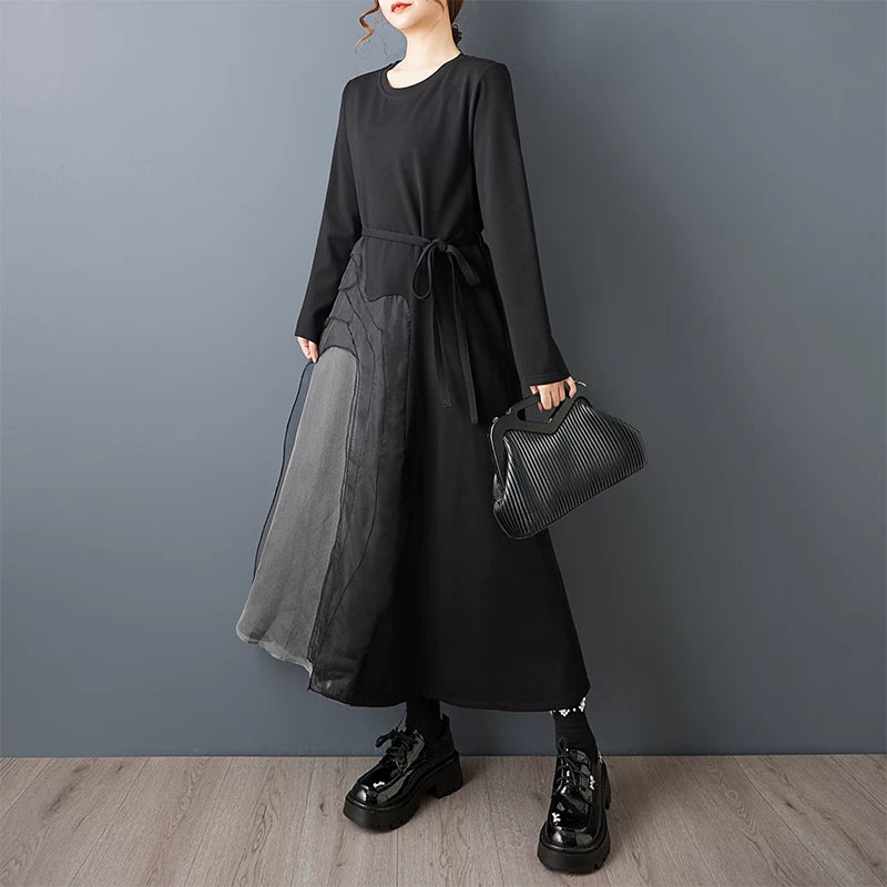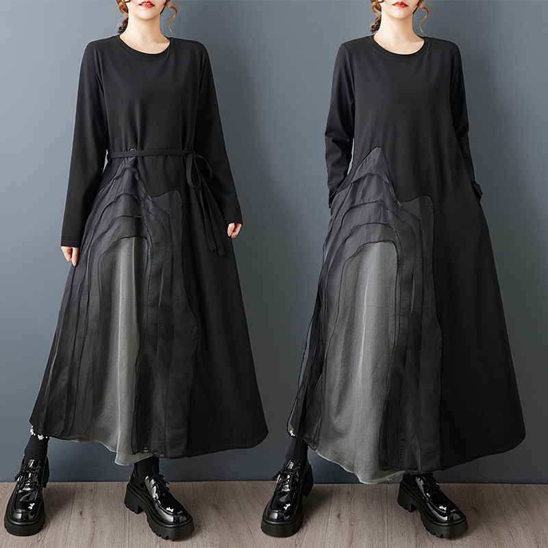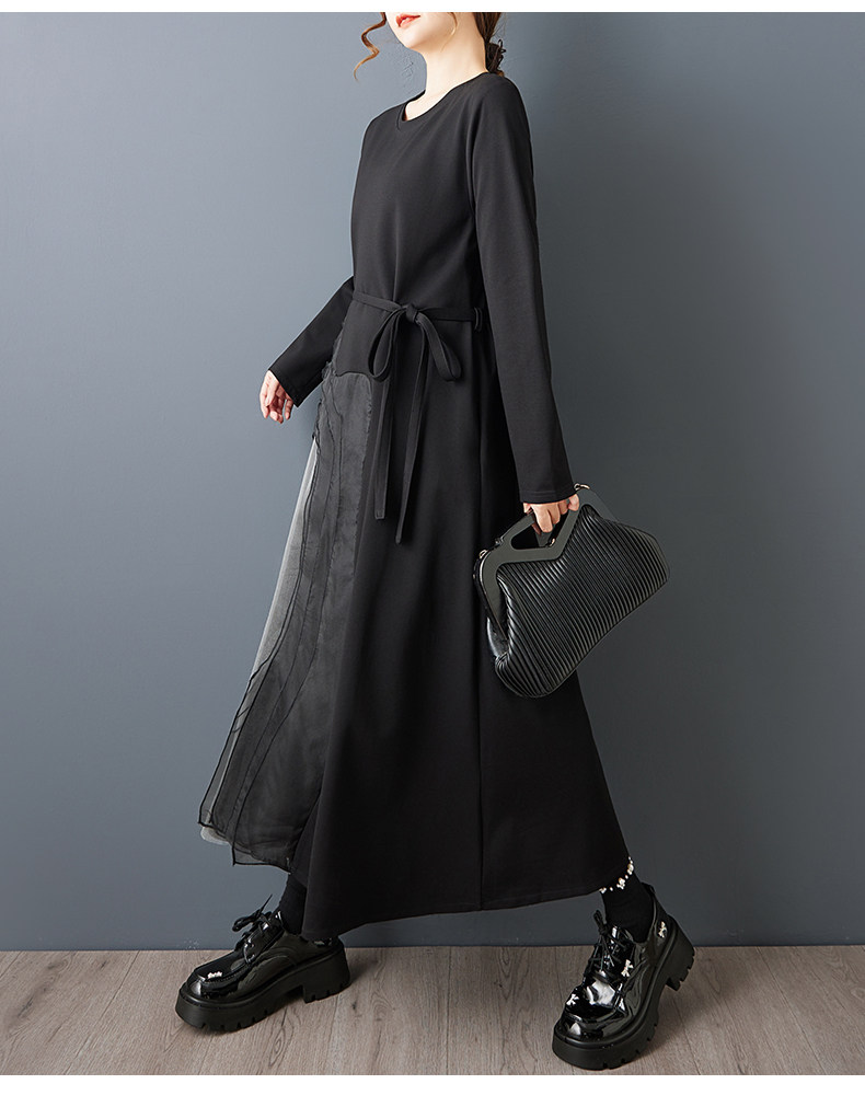 【ワンピース】ゆったり ダークモード デザインワンピース チュール 重ね切替 長袖ワンピース レディース モード系 雰囲気 ロングドレス【AHシリーズ】