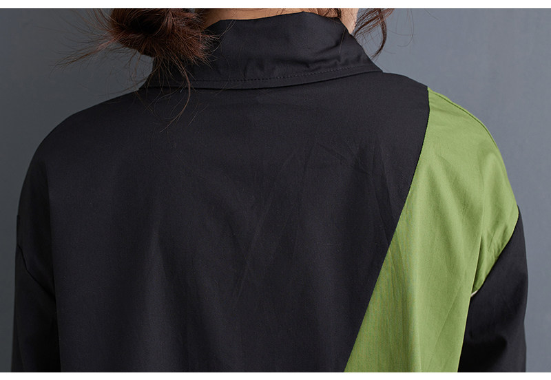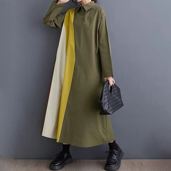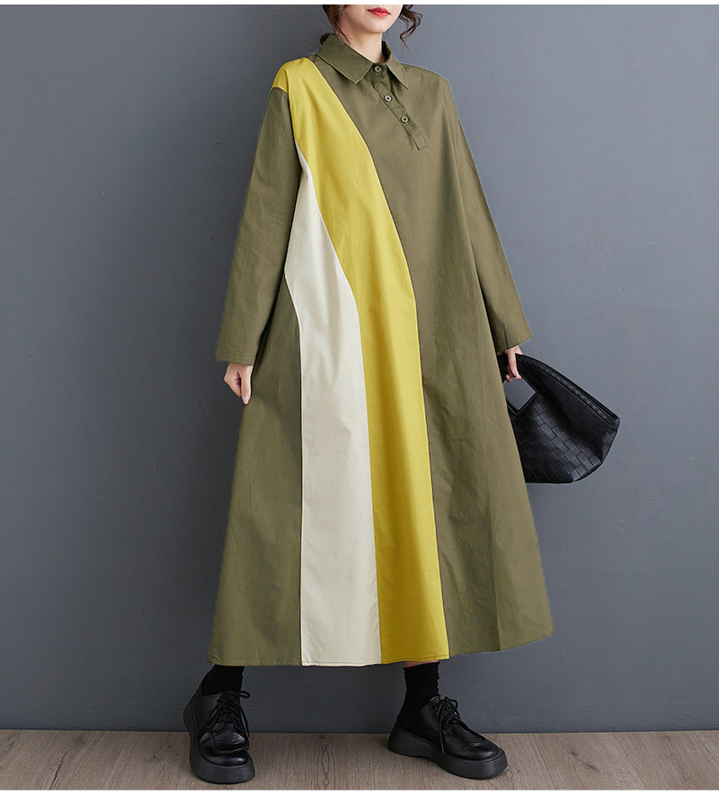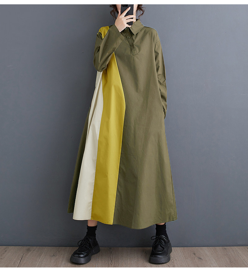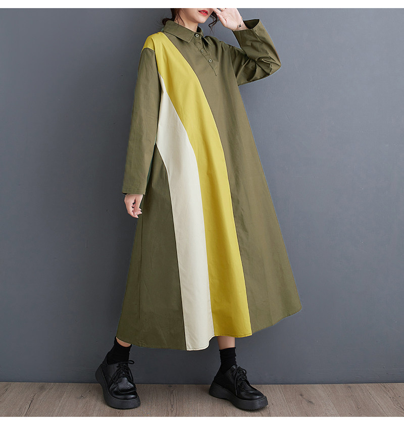 【ワンピース】香港風 クルーネック 切替 シャツ生地 大きめサイズ 長袖 ワンピース ビッグシルエット ゆったり【JZシリーズ】
