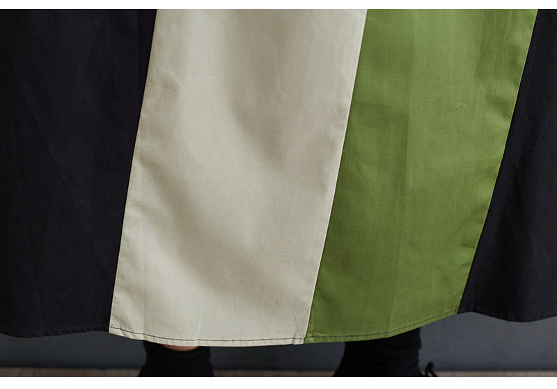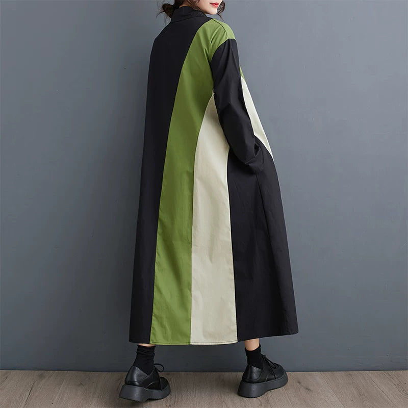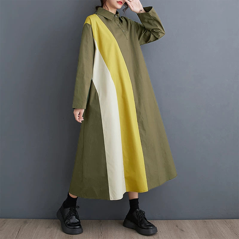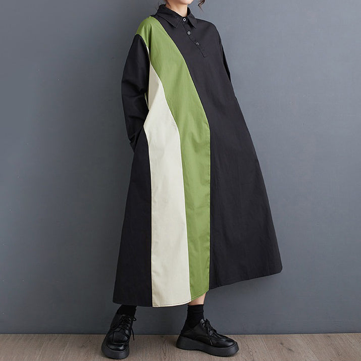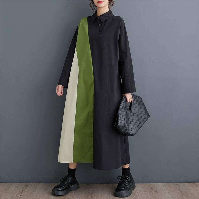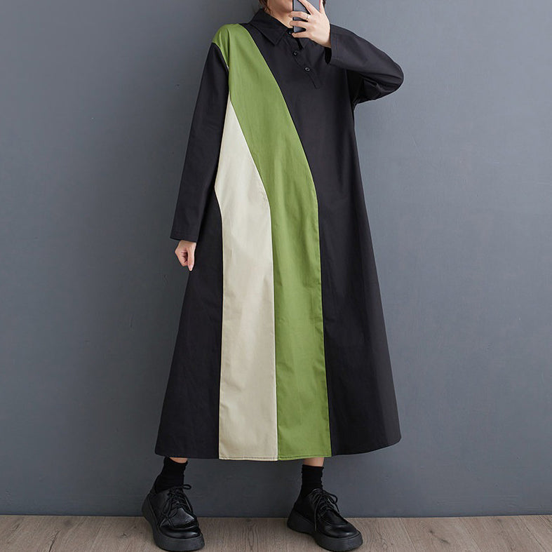 【ワンピース】香港風 クルーネック 切替 シャツ生地 大きめサイズ 長袖 ワンピース ビッグシルエット ゆったり【JZシリーズ】