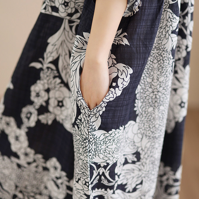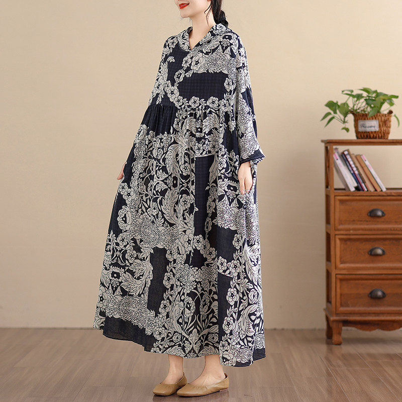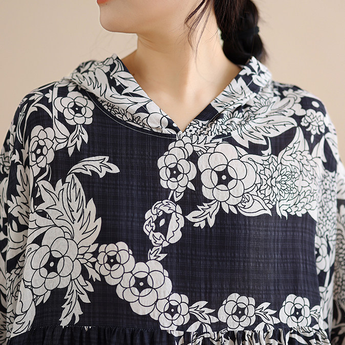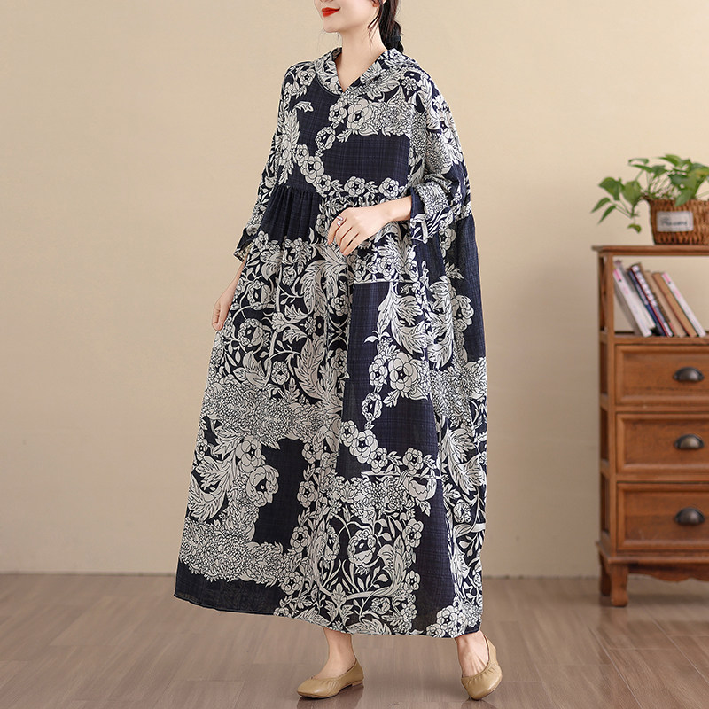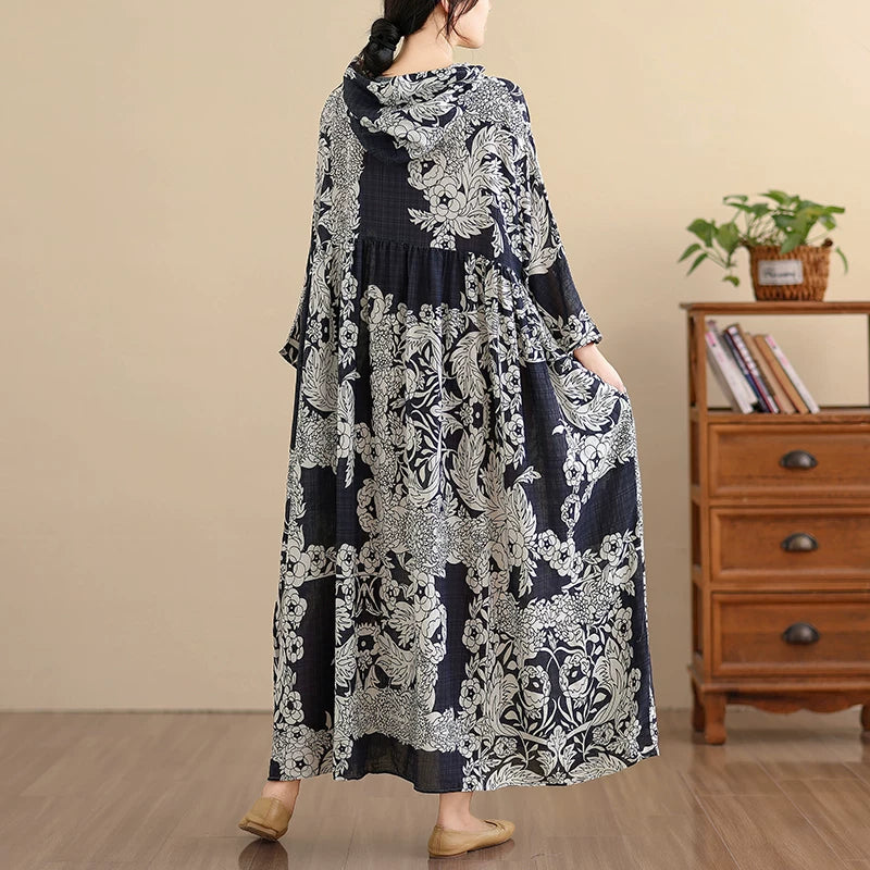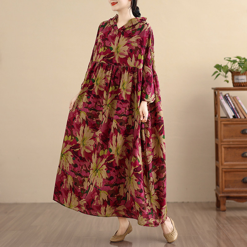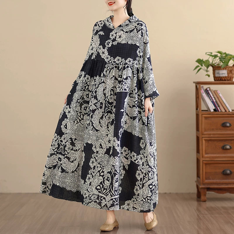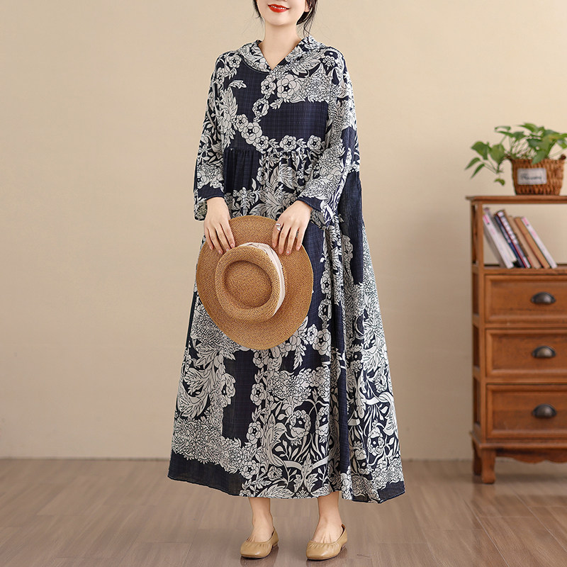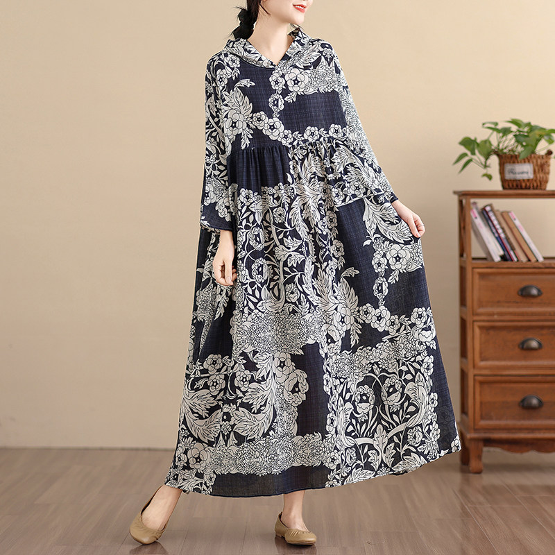 【60%OFF⭐️早い者勝ち】【ワンピース】上品 ナチュラル コットンリネン フード付き プリント 長袖ワンピース 大きいサイズ レディース ロングドレス【SHシリーズ】