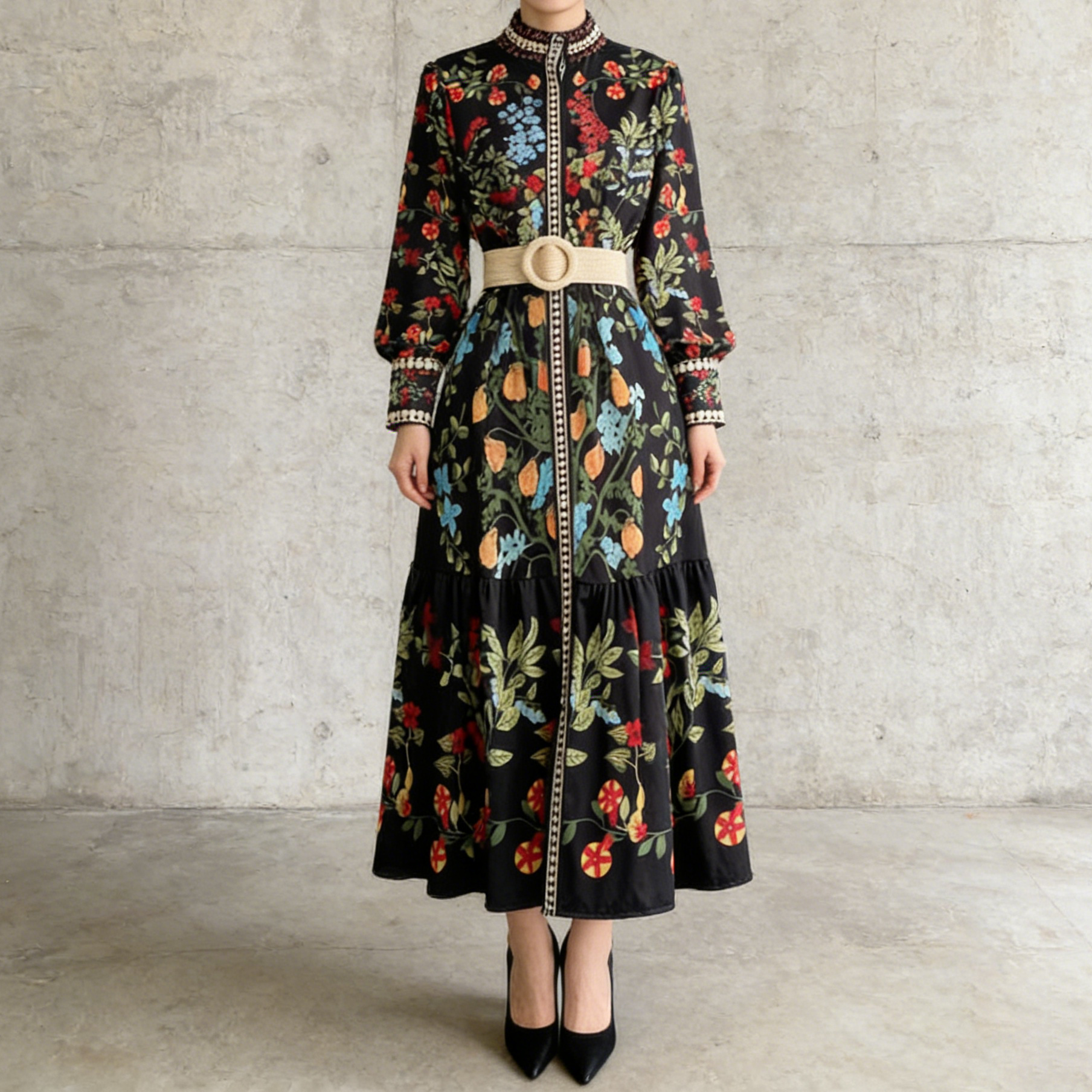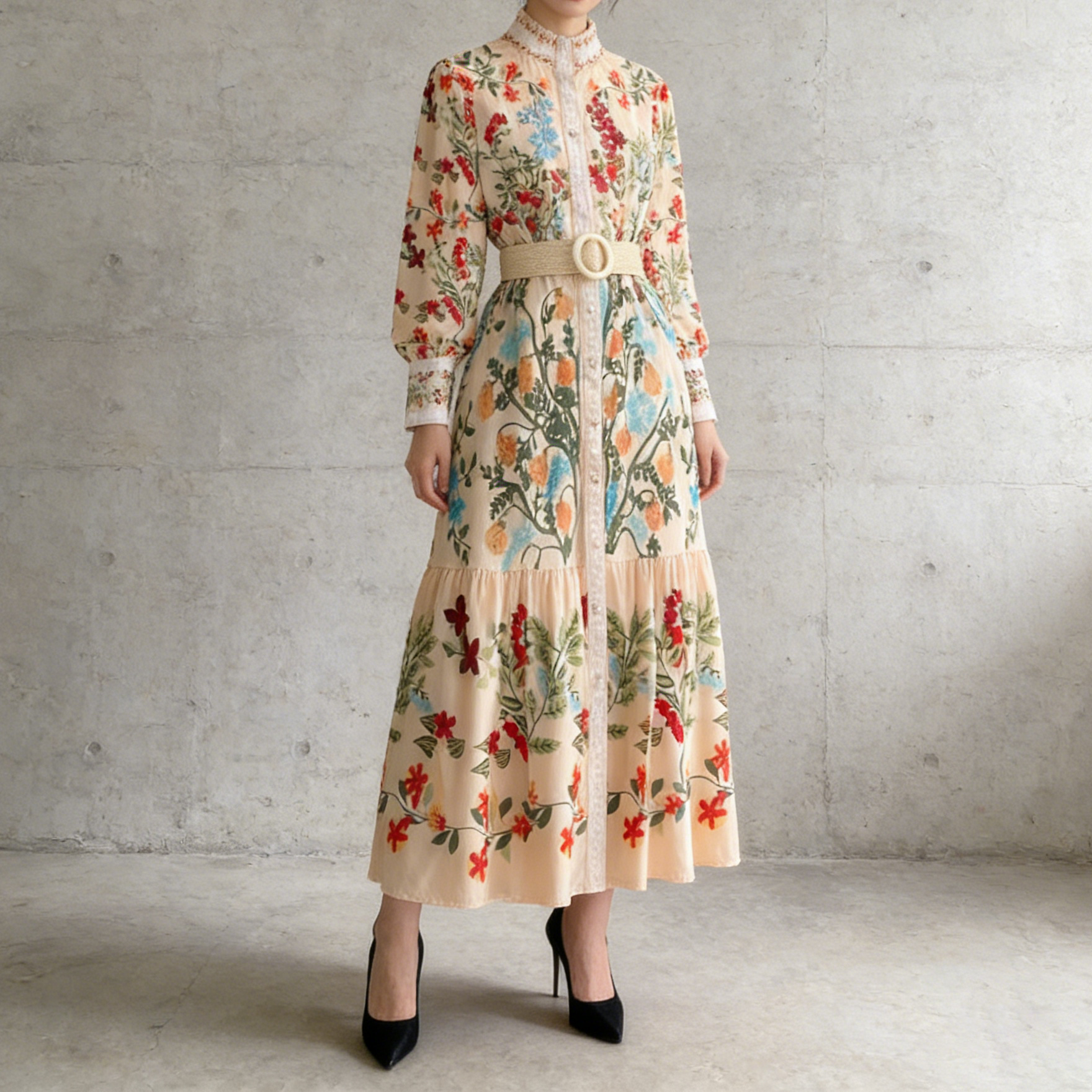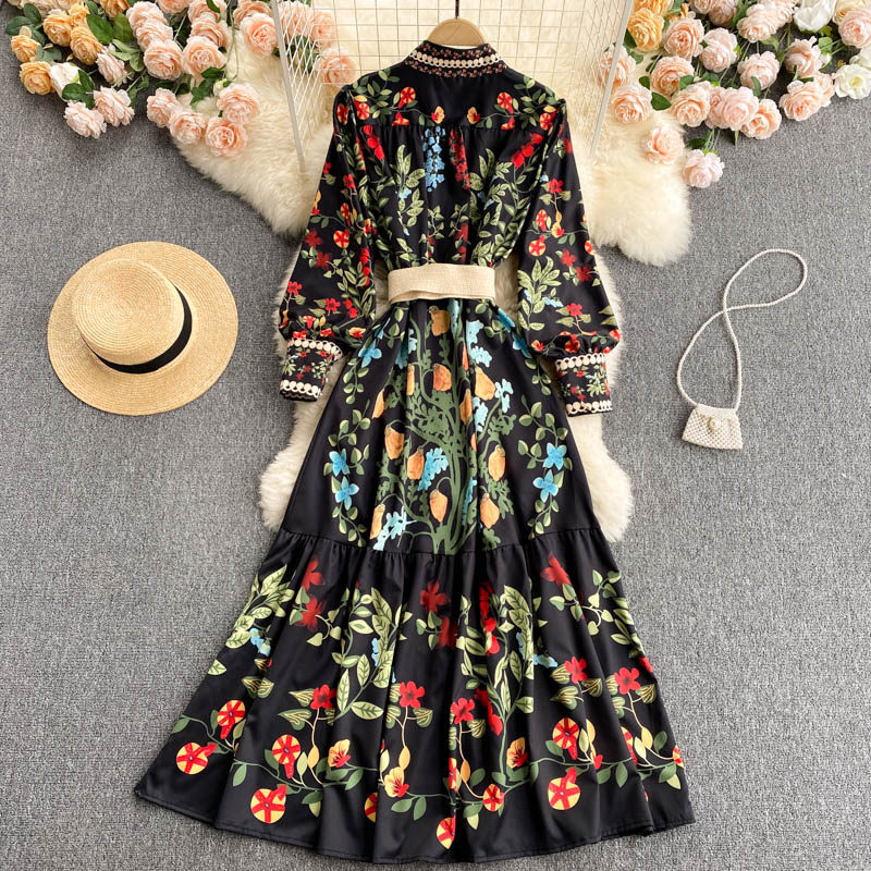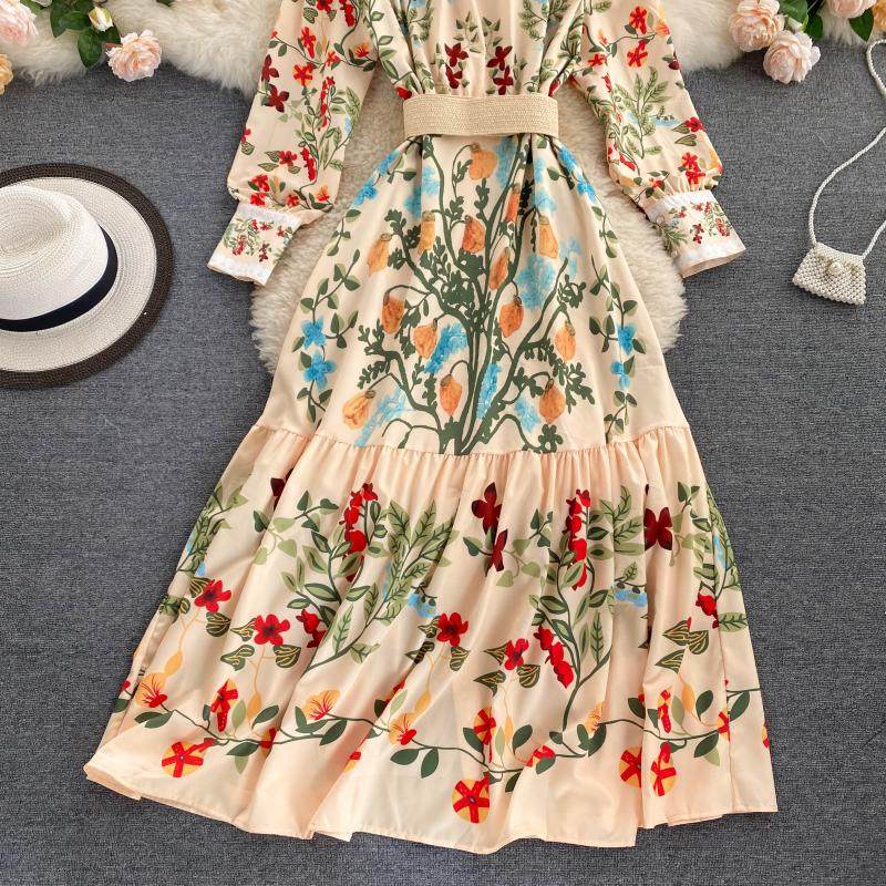 【商品名】【ワンピース】欧米レトロ 花柄 ウエストリボン 長袖 フリル Aライン ワンピース【SHシリーズ】