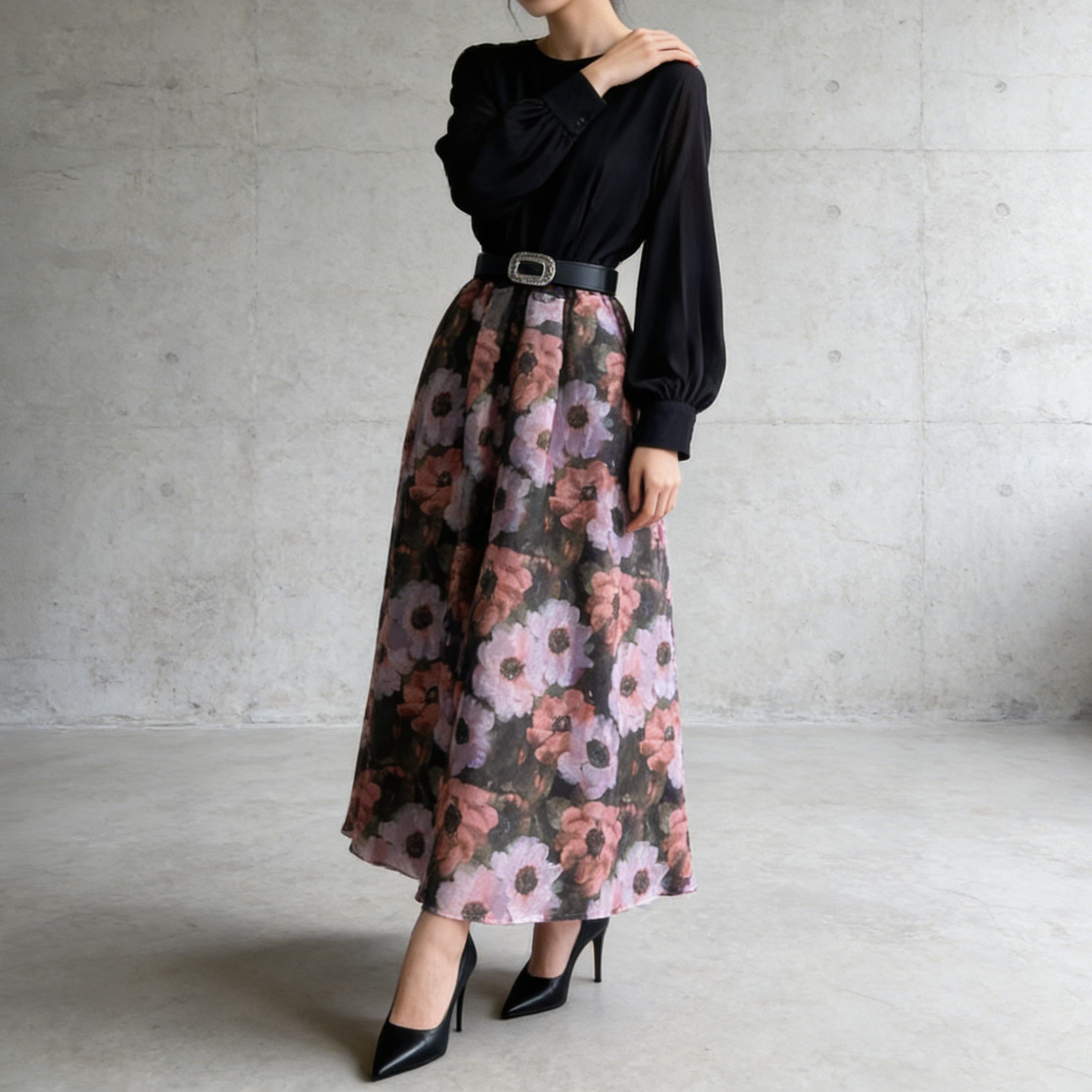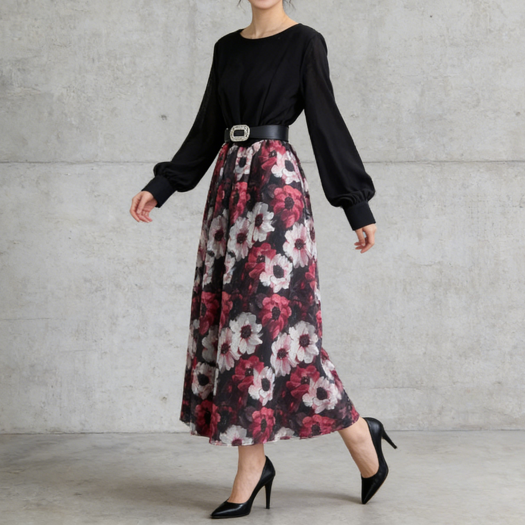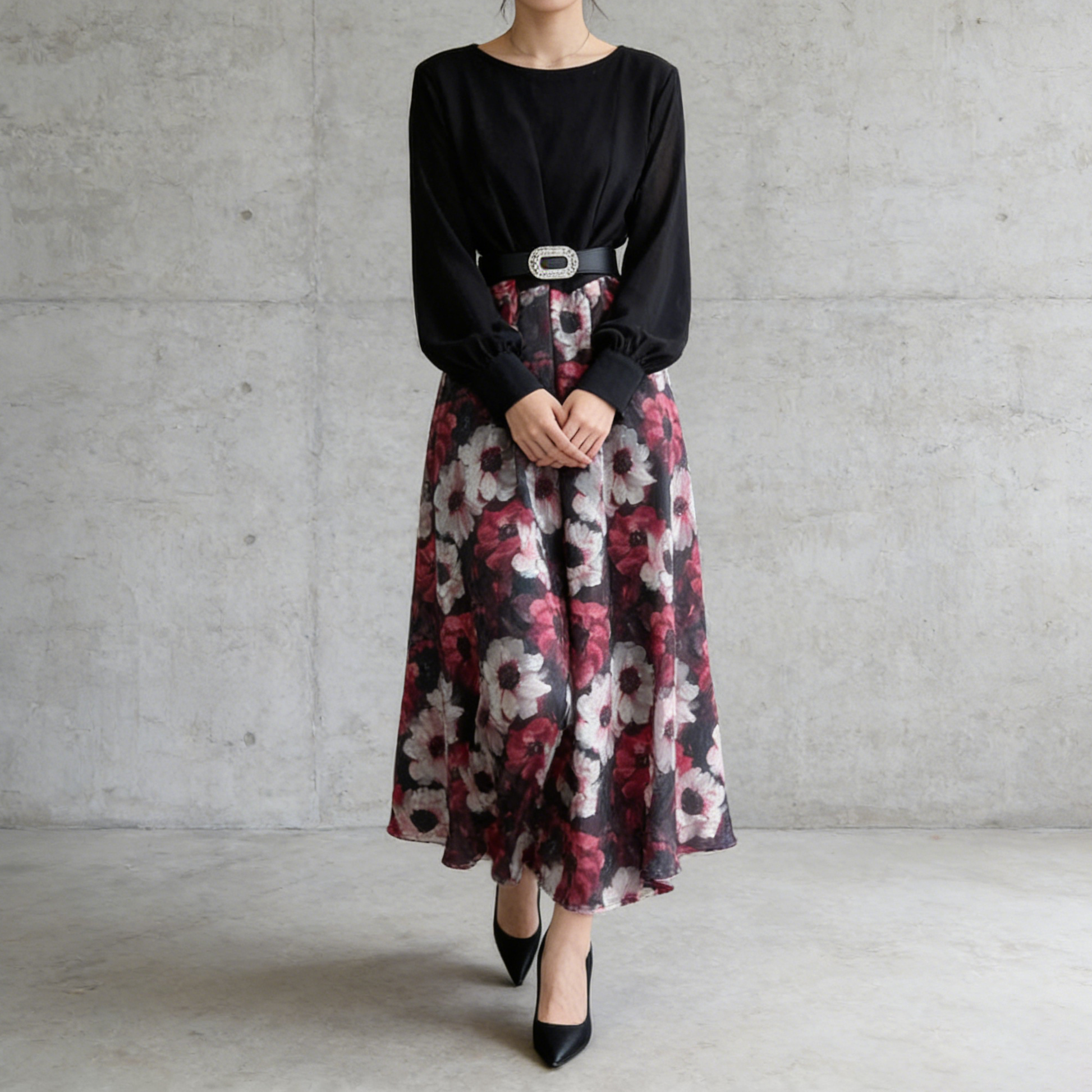 【ワンピース】フレンチ 花柄 切替 ウエストリボン 長袖 エレガント ロングワンピース【SHシリーズ】