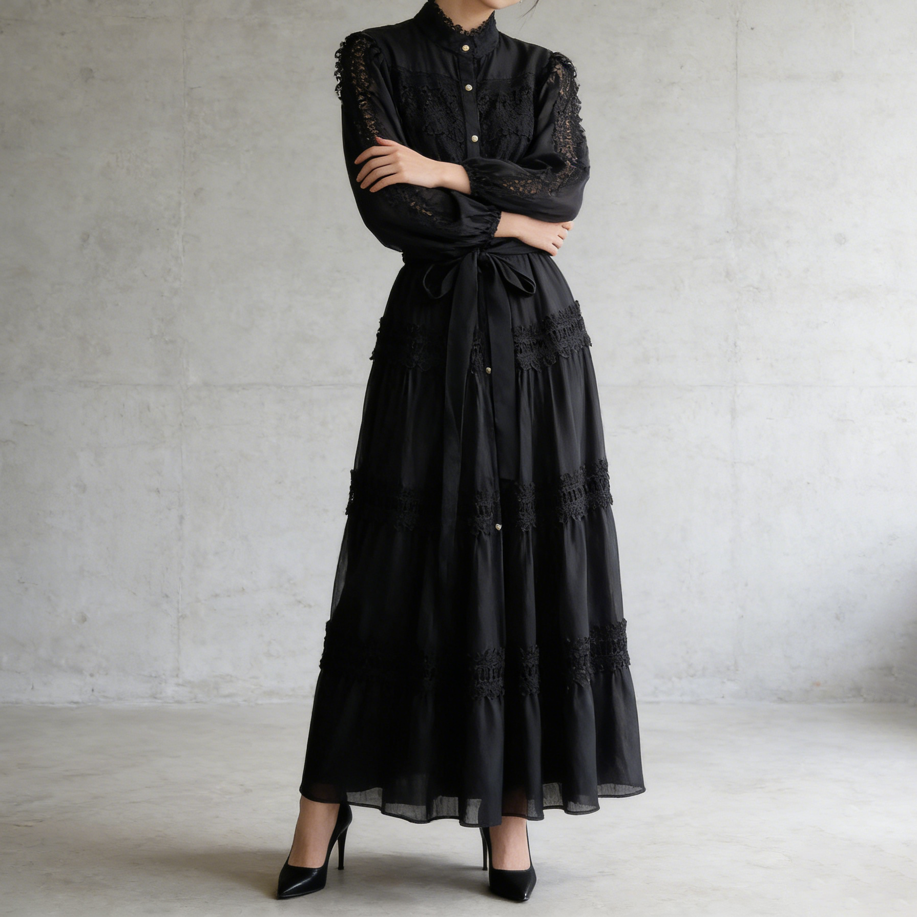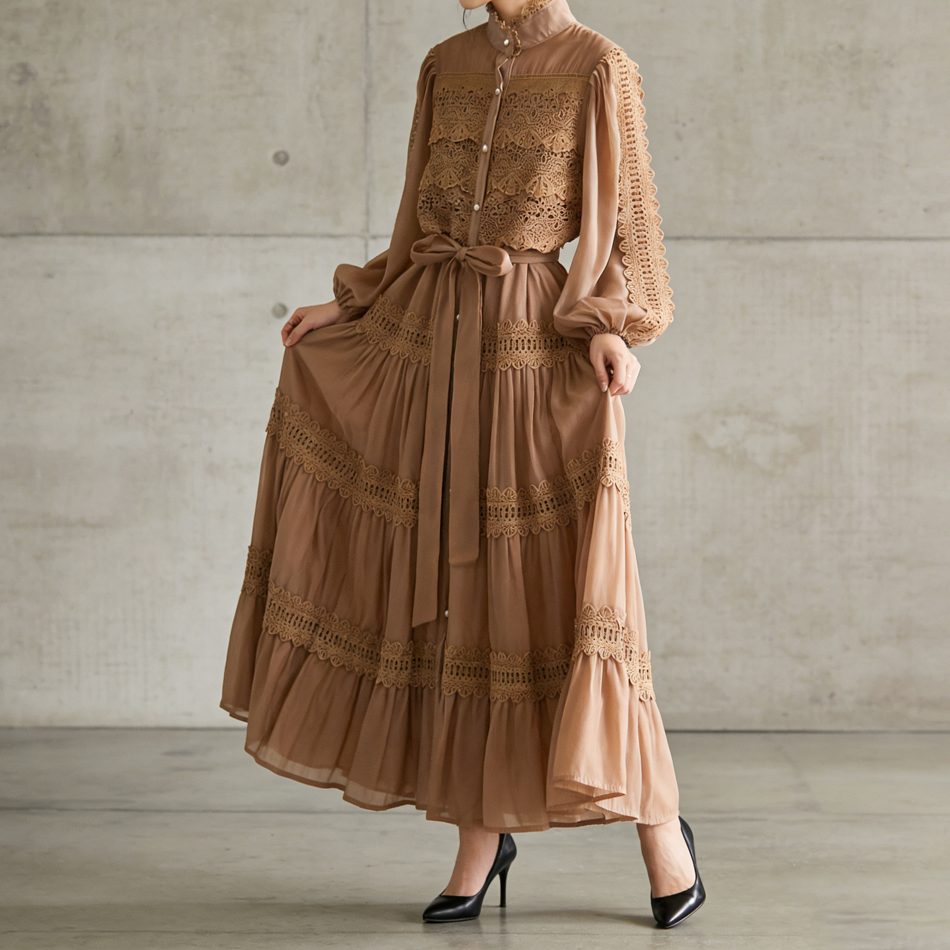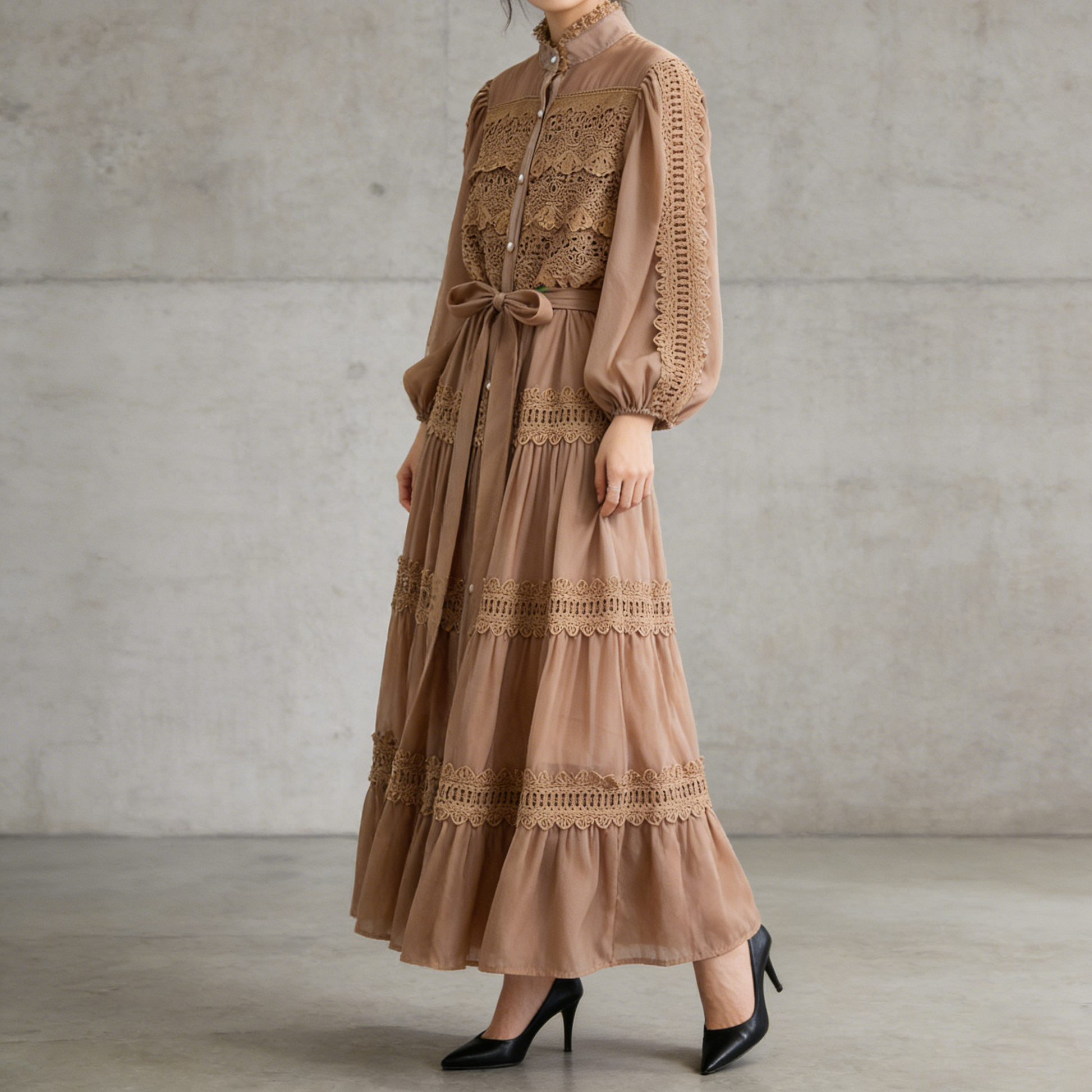 【商品名】【ワンピース】フレンチヴィンテージ レース切替 スタンドカラー ウエストマーク フレア 長袖ワンピース【JZシリーズ】