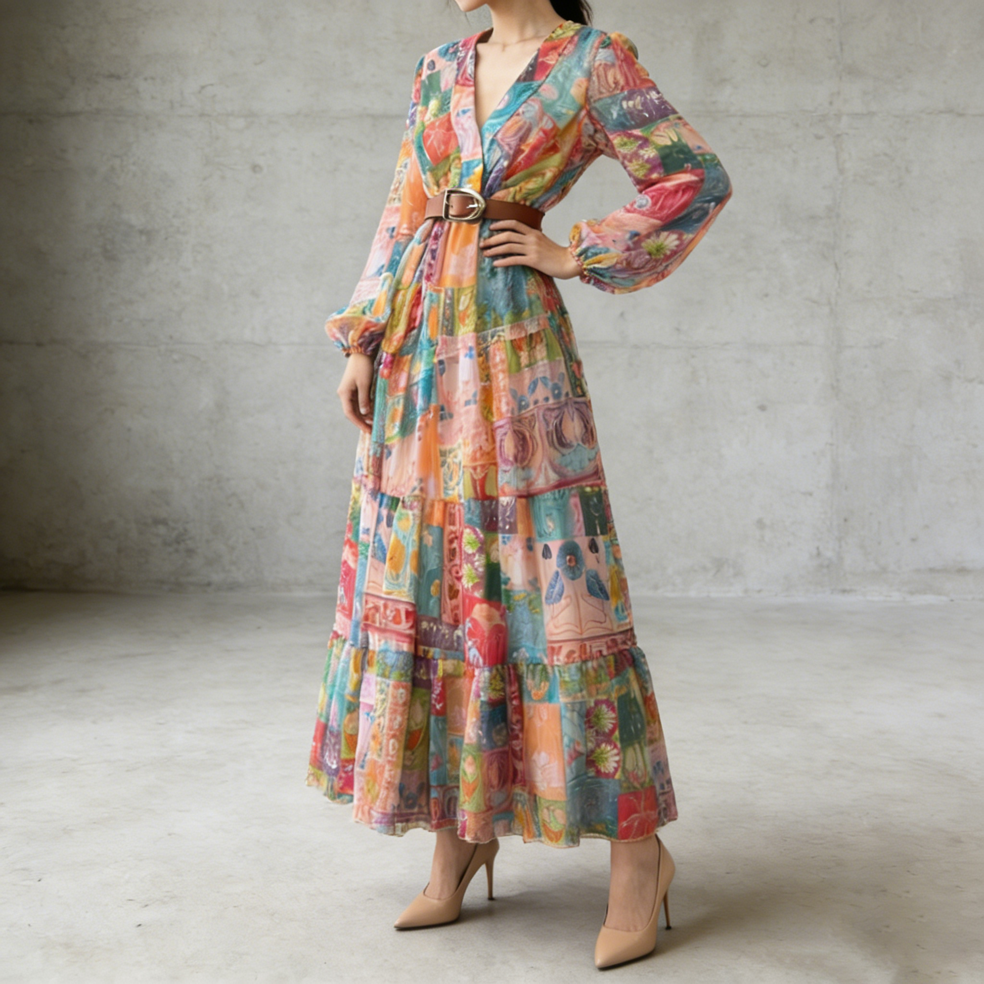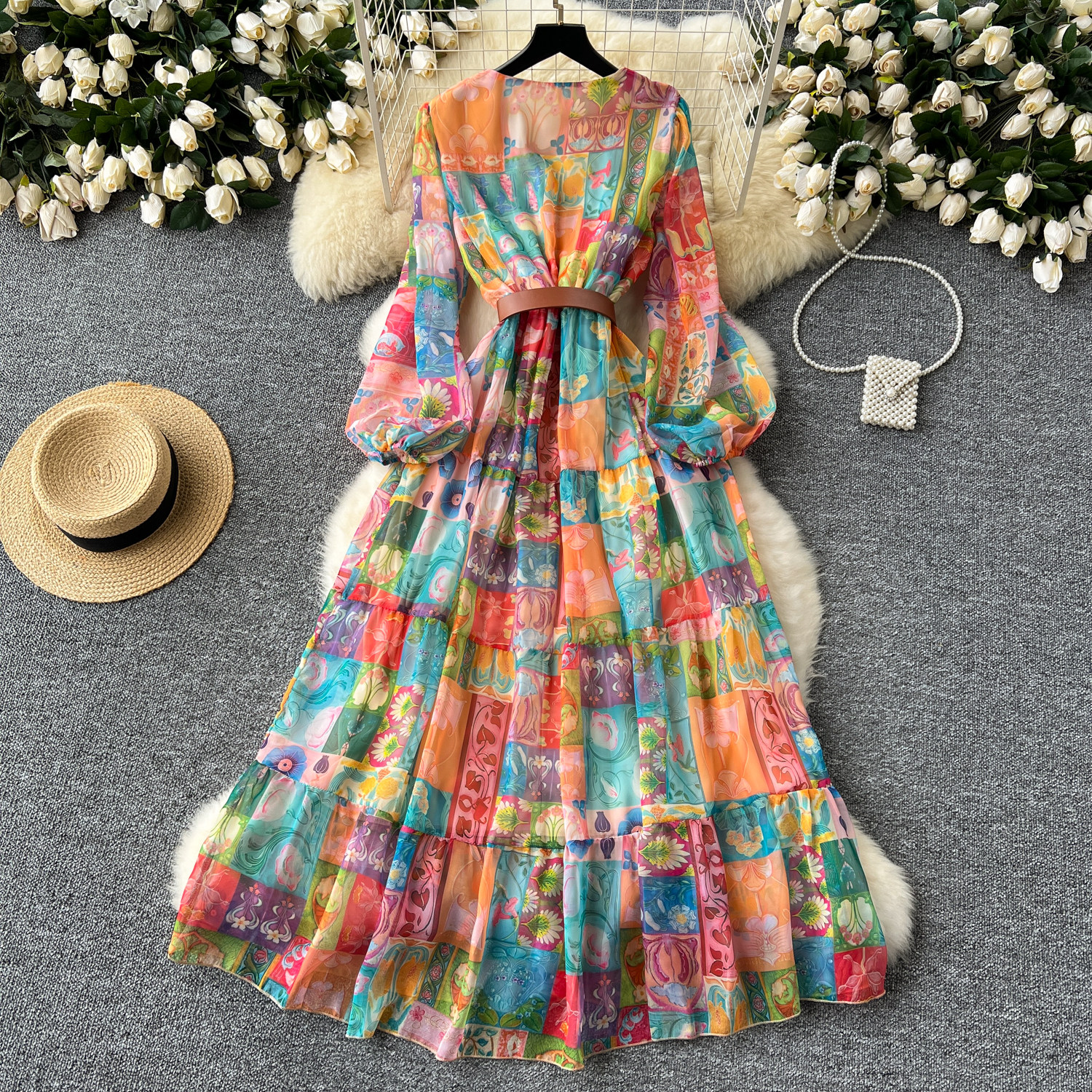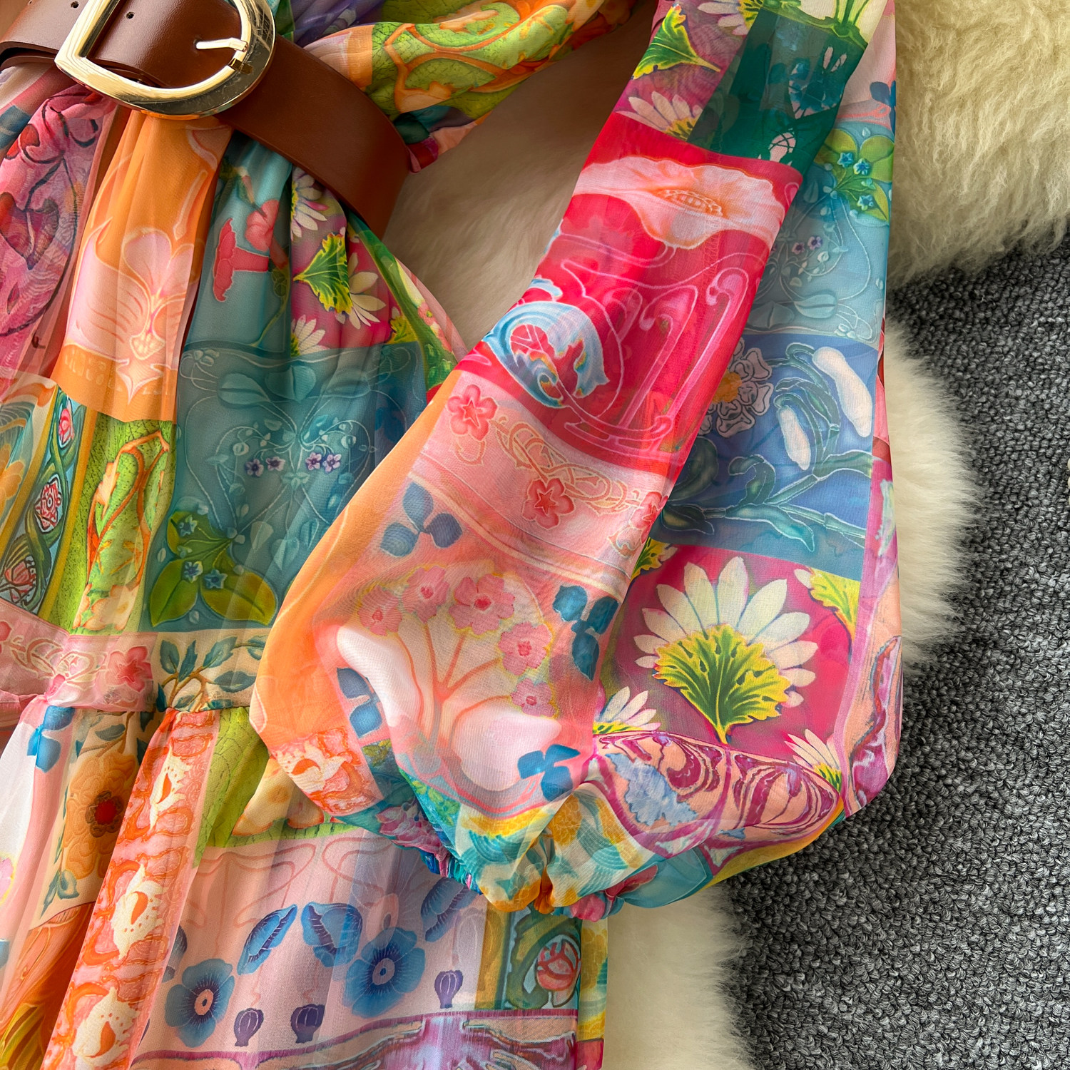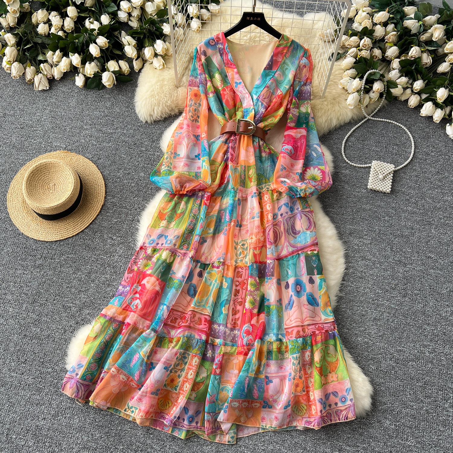 【ワンピース】欧米風 Vネック プリント シフォン長袖ワンピース フレア ロング丈 レディース【SHシリーズ】