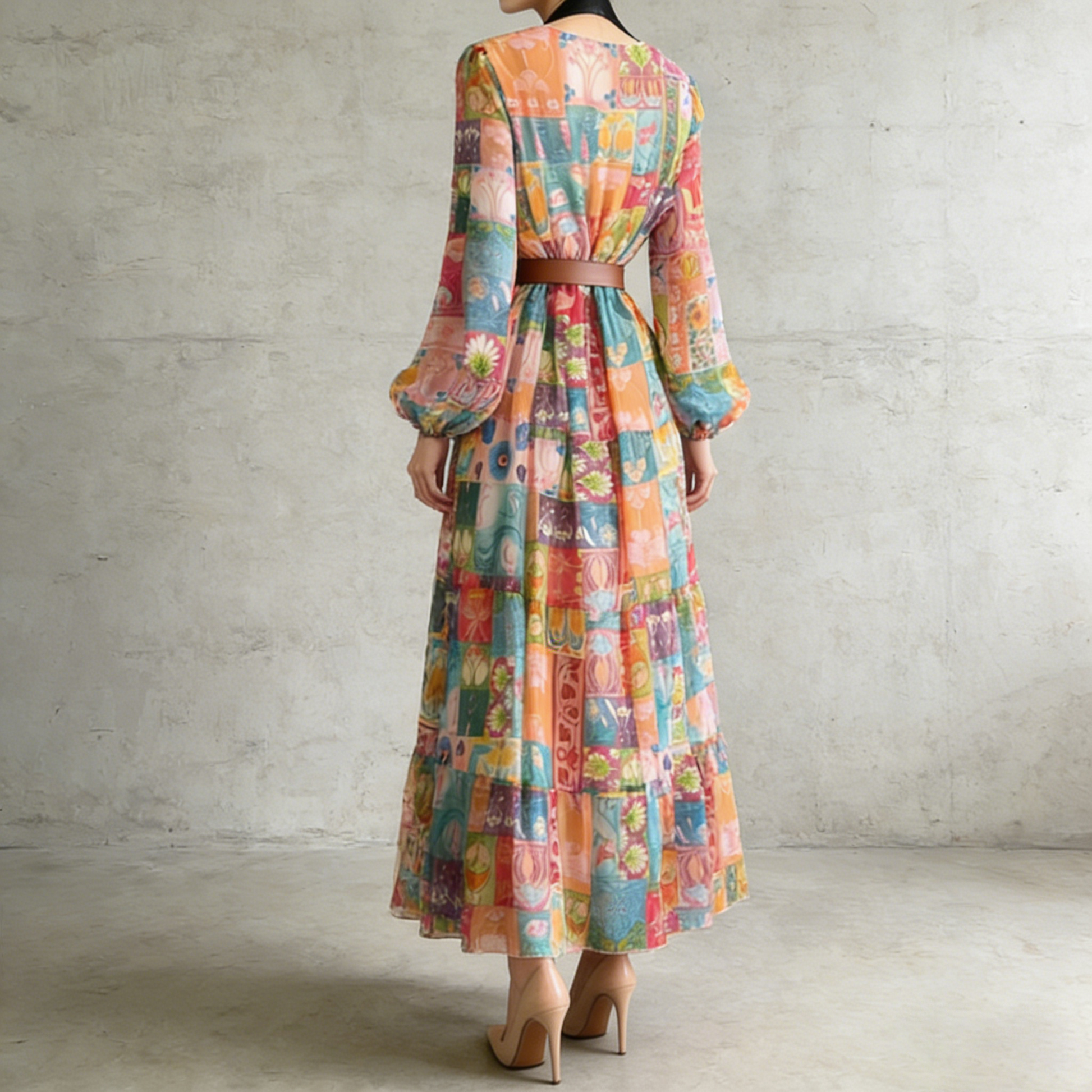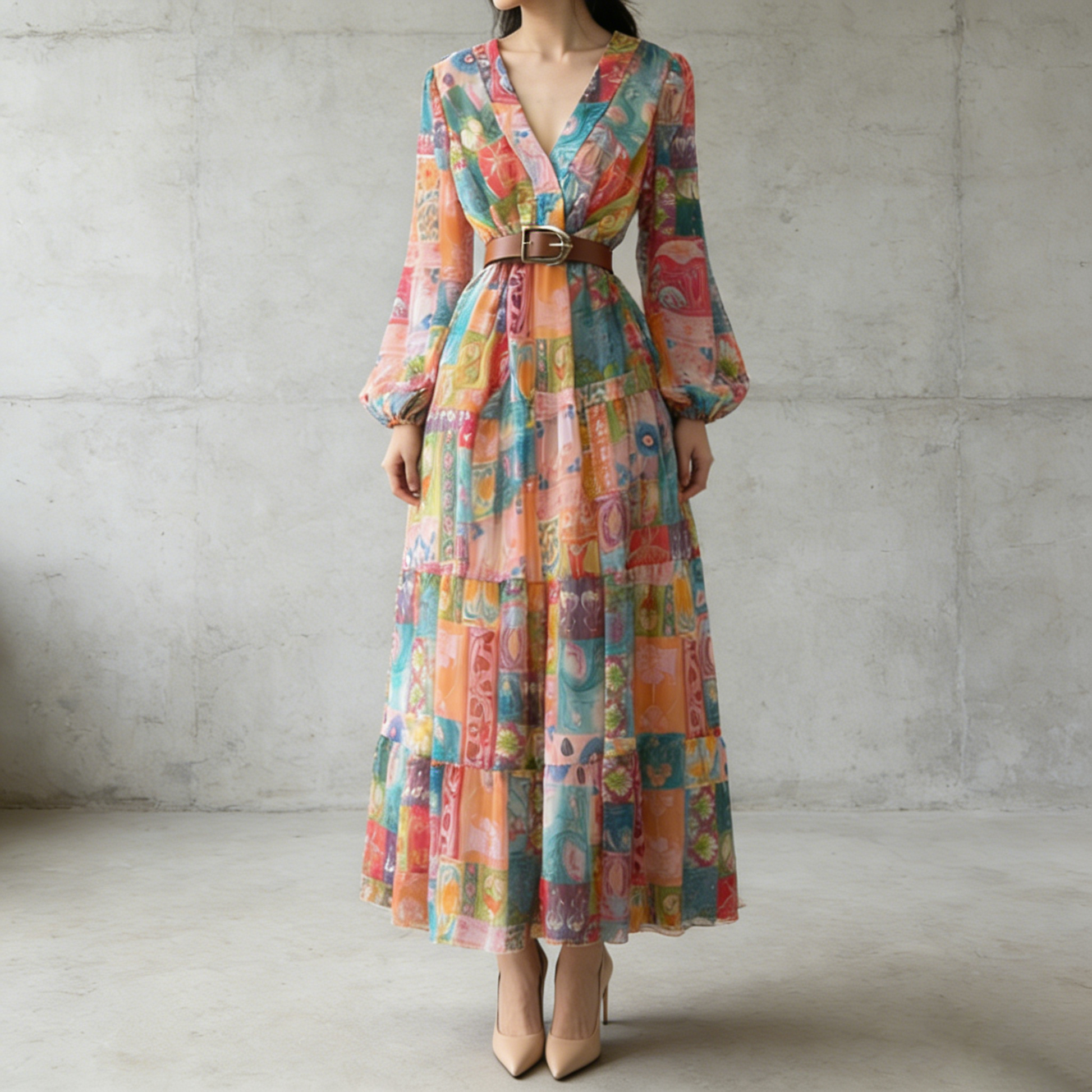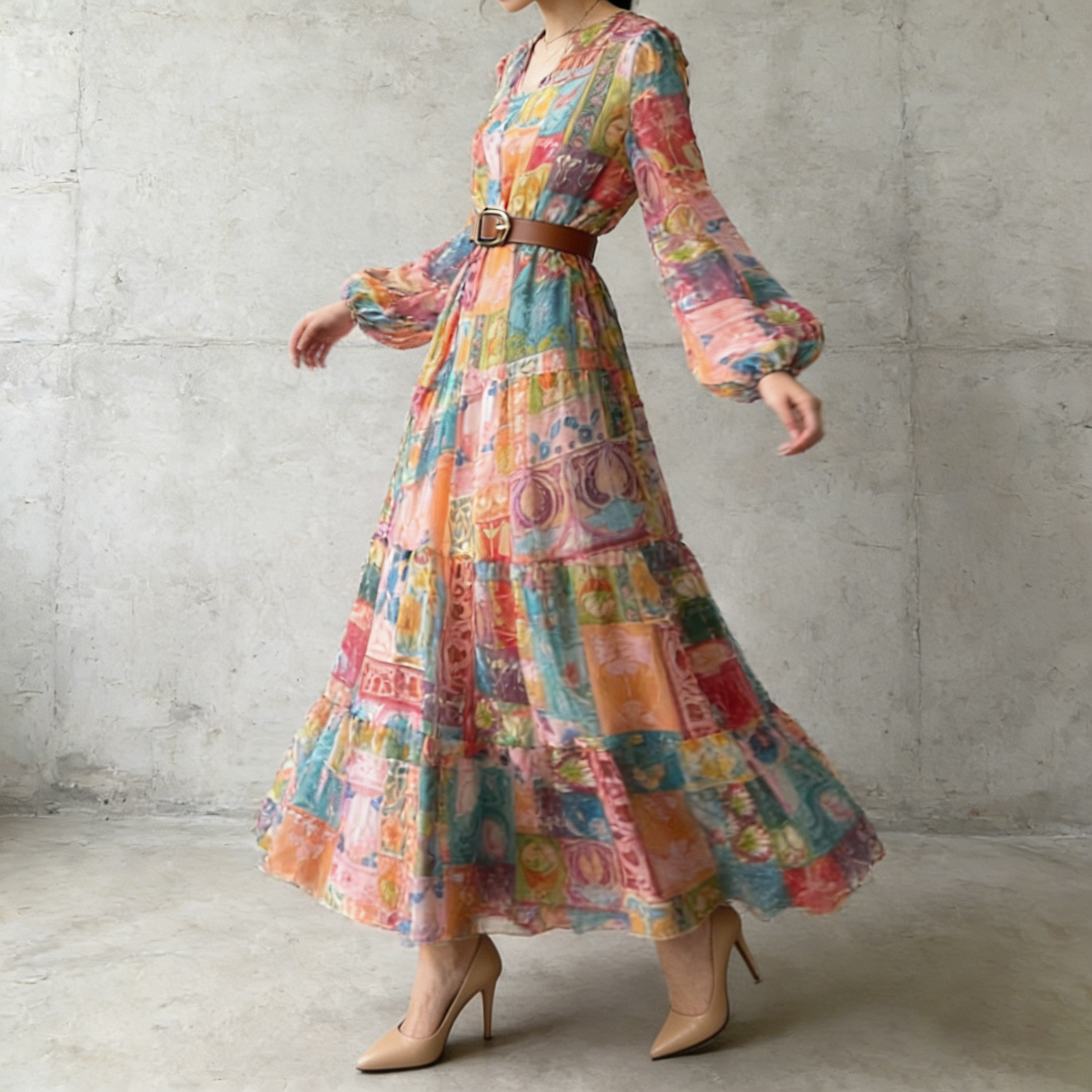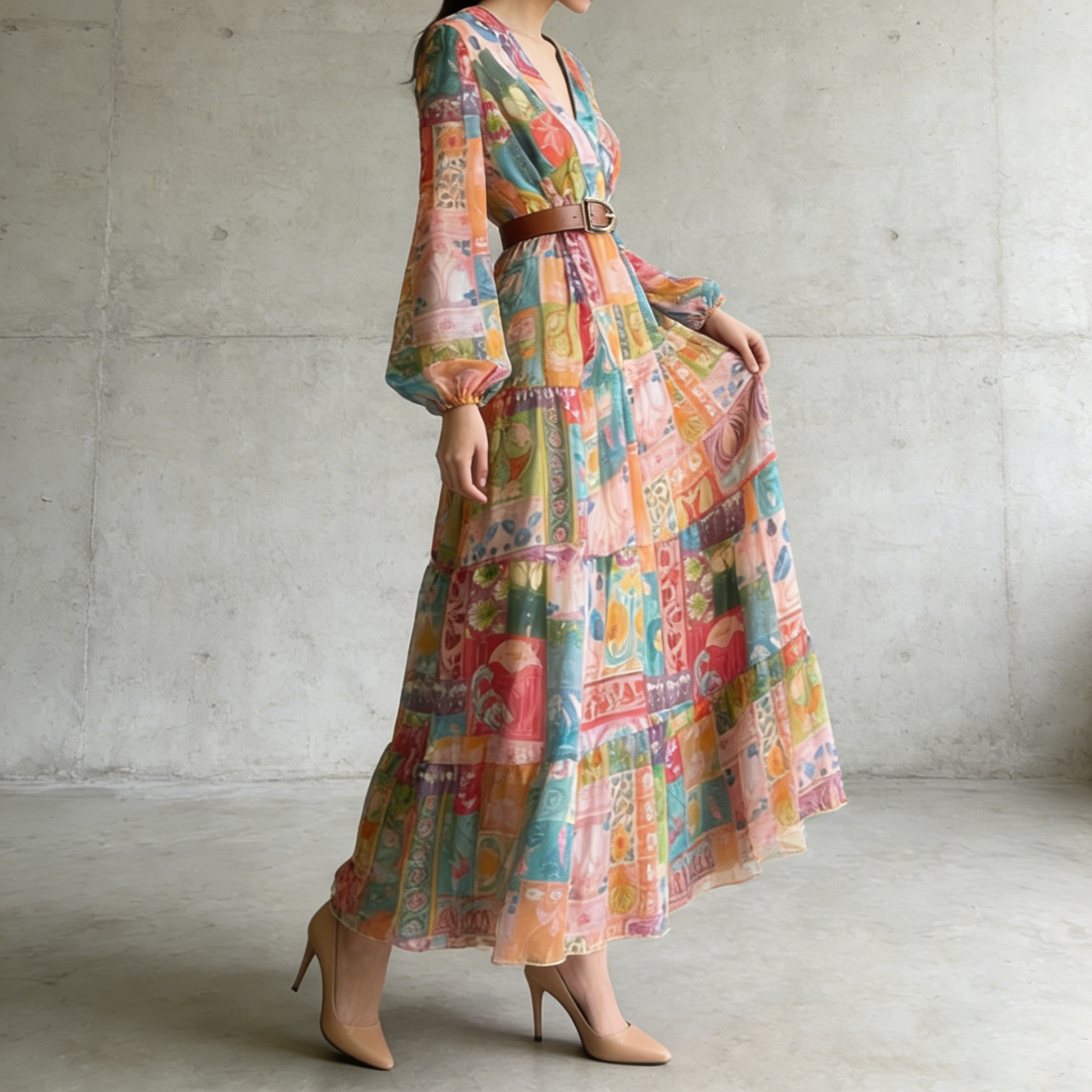 【ワンピース】欧米風 Vネック プリント シフォン長袖ワンピース フレア ロング丈 レディース【SHシリーズ】