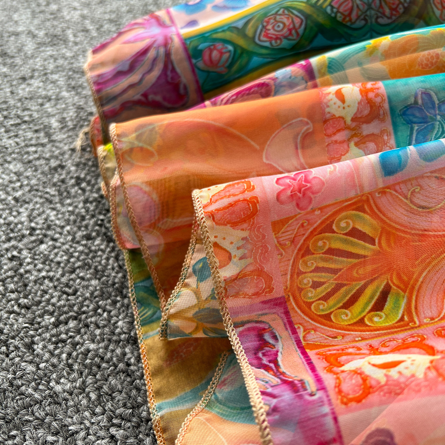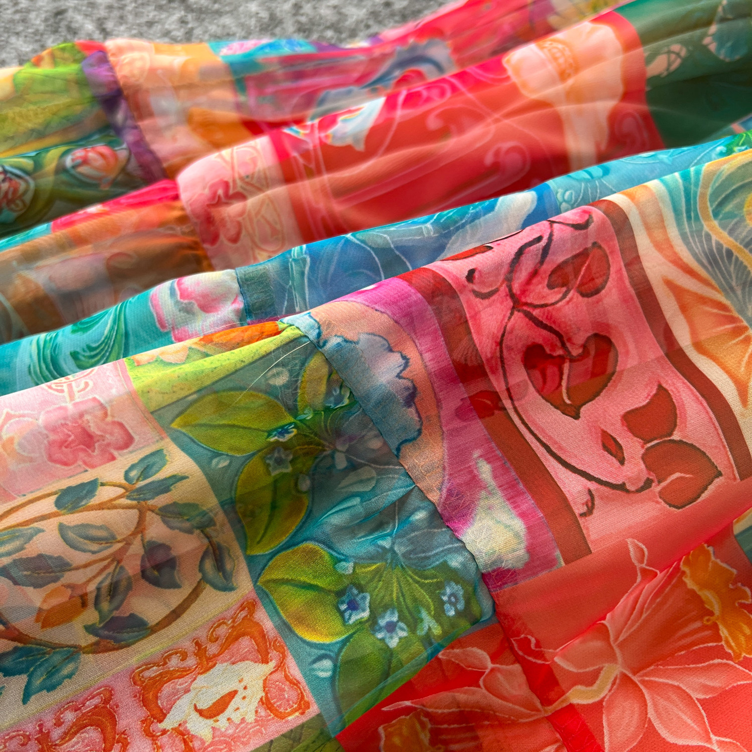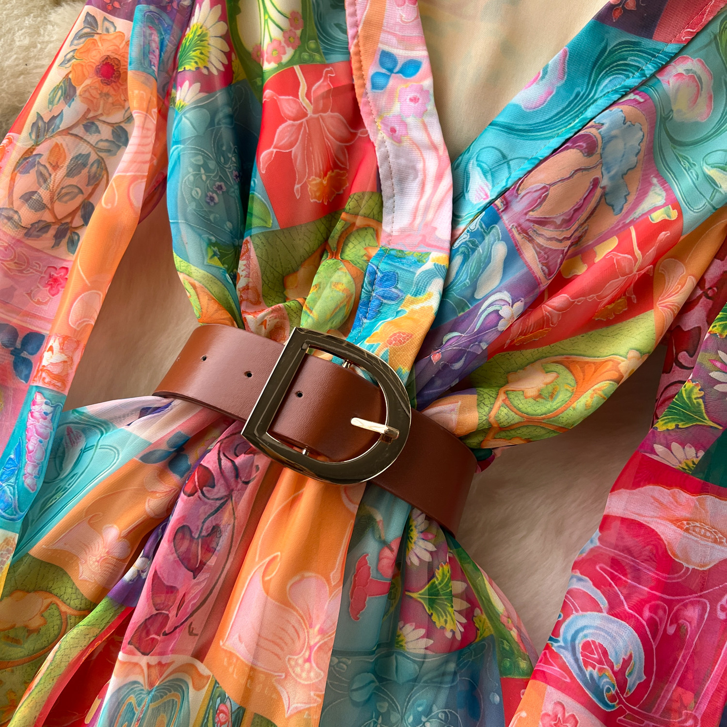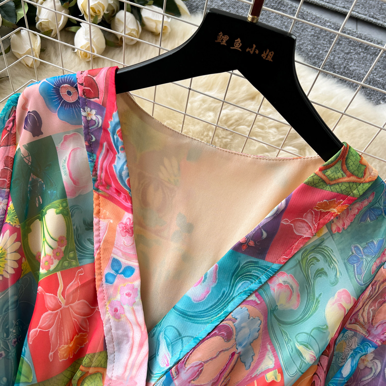 【ワンピース】欧米風 Vネック プリント シフォン長袖ワンピース フレア ロング丈 レディース【SHシリーズ】