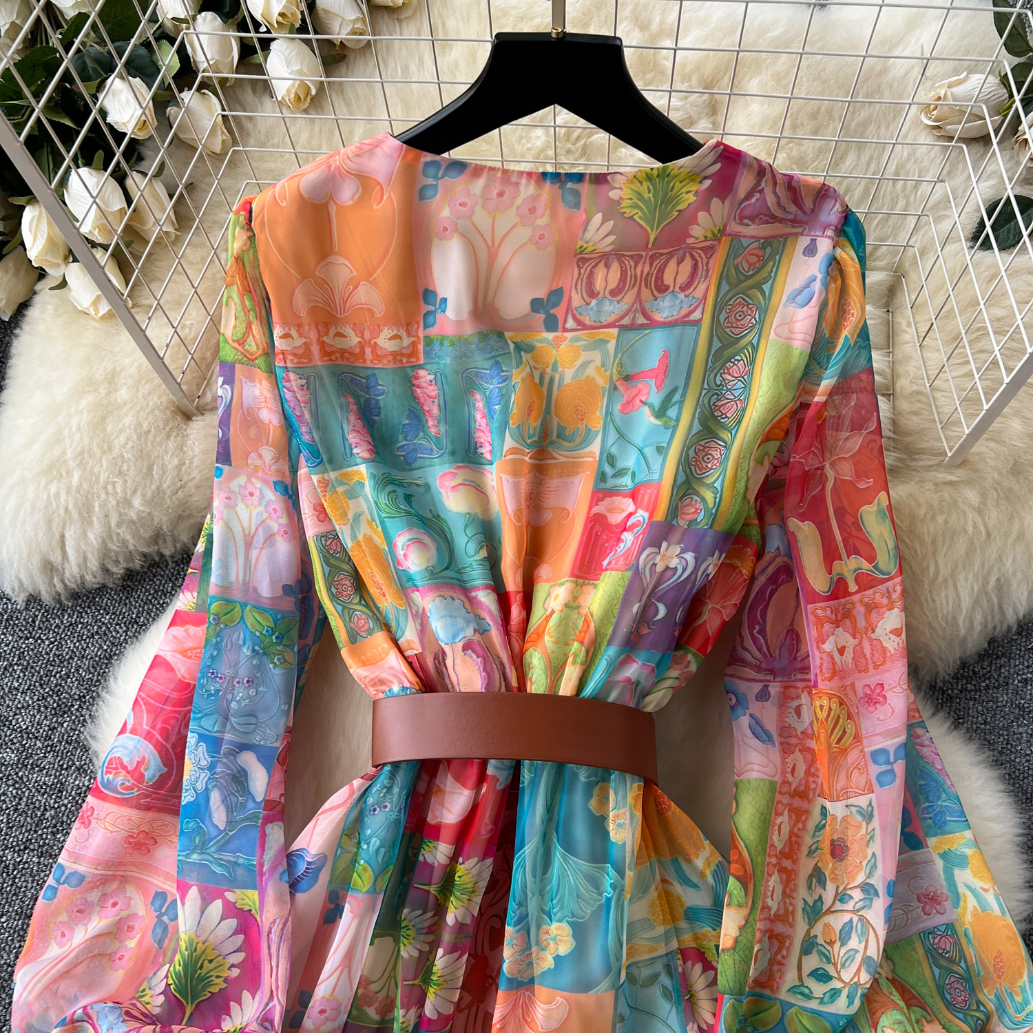 【商品名】【ワンピース】欧米風 Vネック プリント シフォン 長袖ワンピース フレア ロング丈 レディース【SHシリーズ】