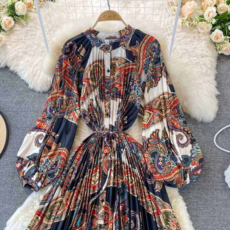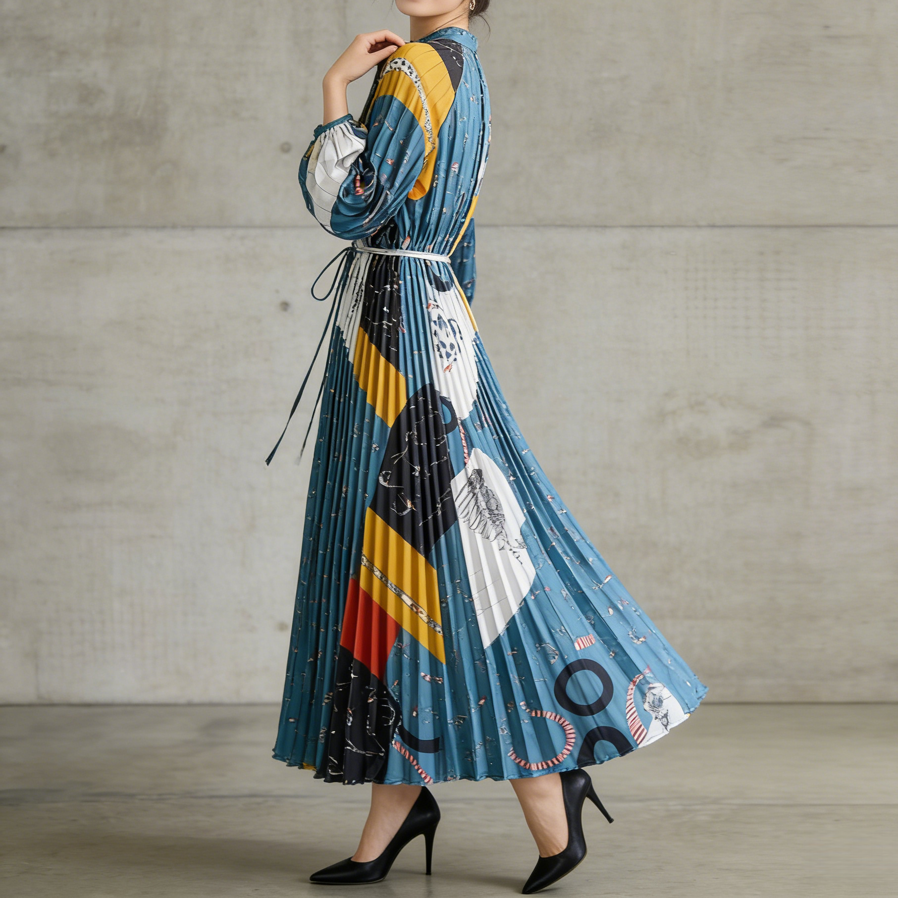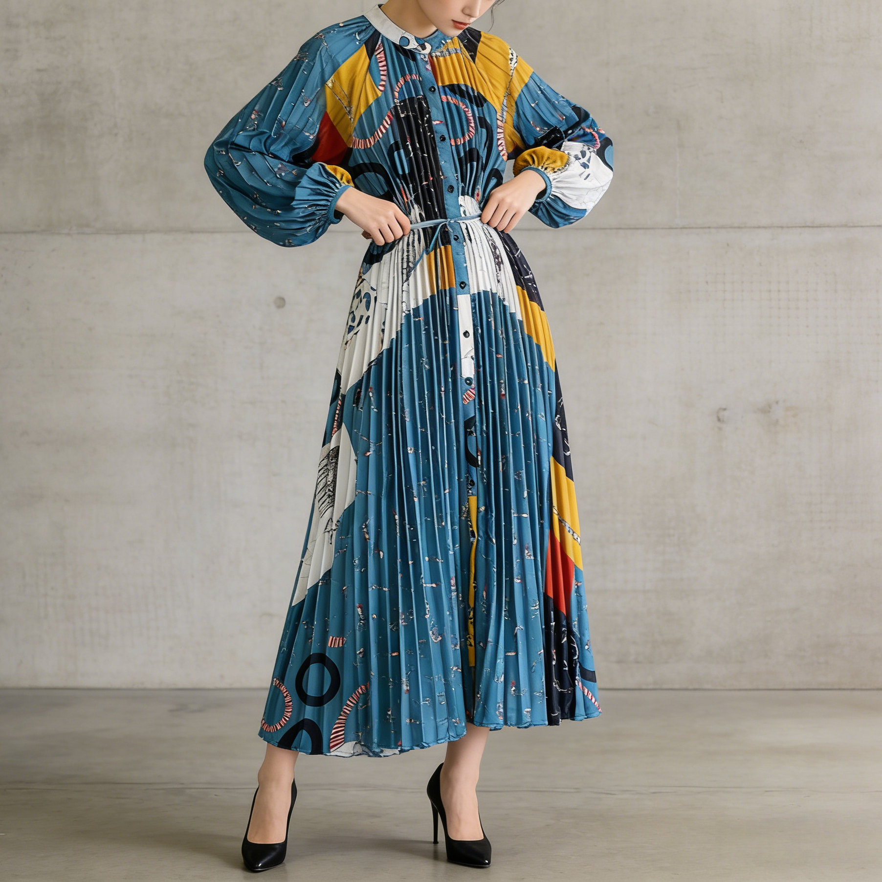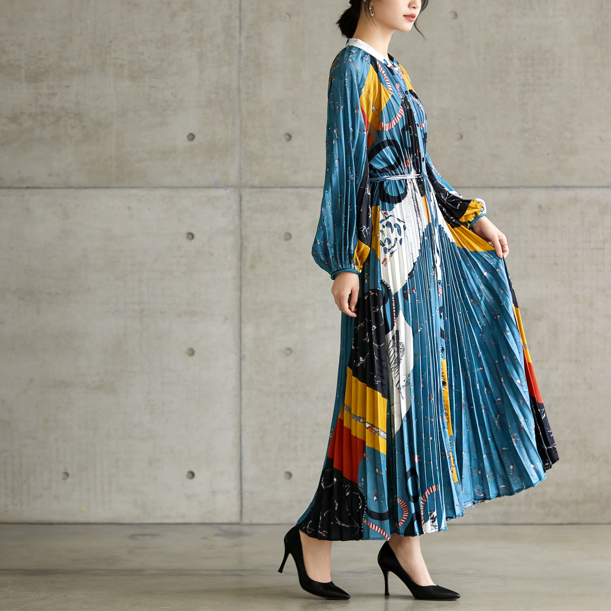 【ワンピース】ラウンドネック サテン プリント プリーツ 長袖 ワンピース 【SHシリーズ】