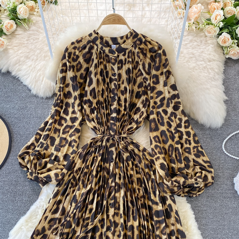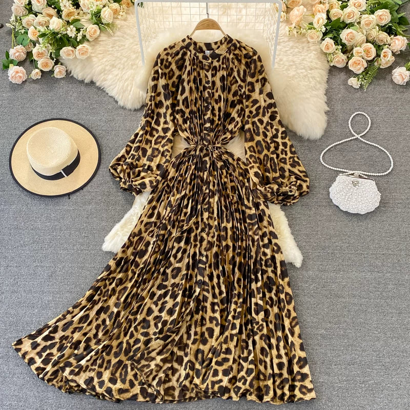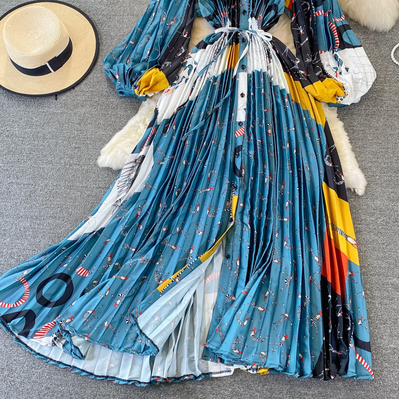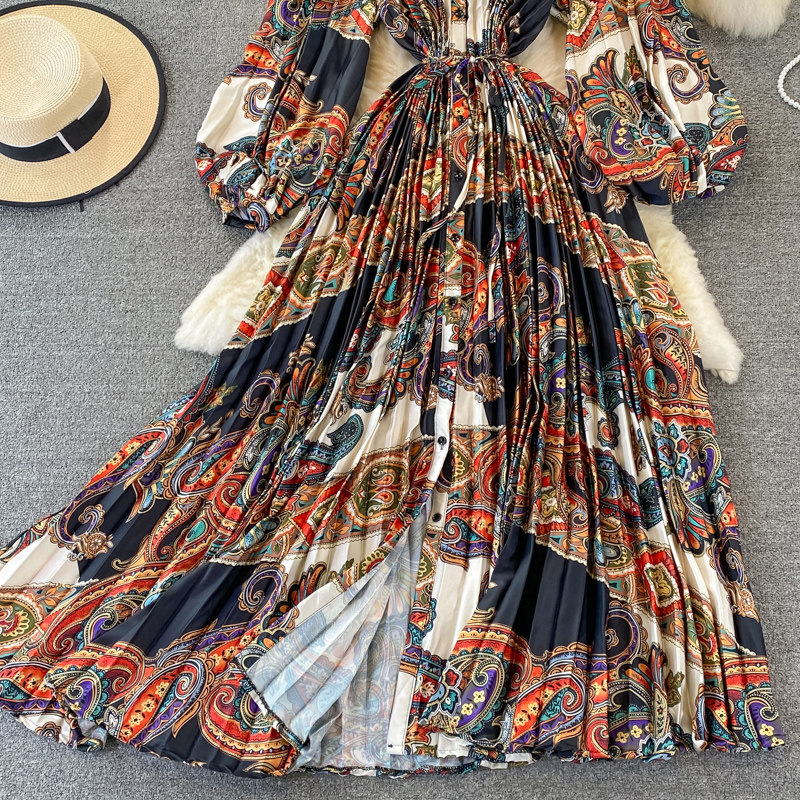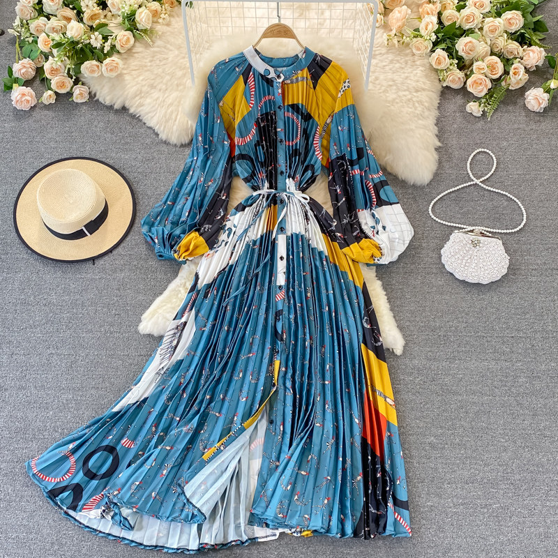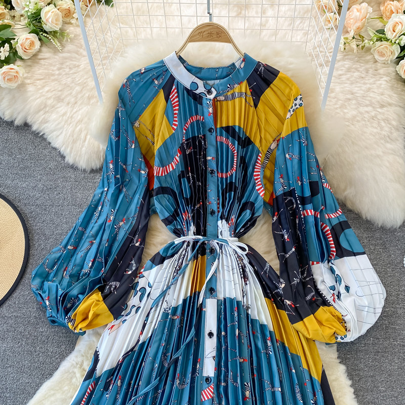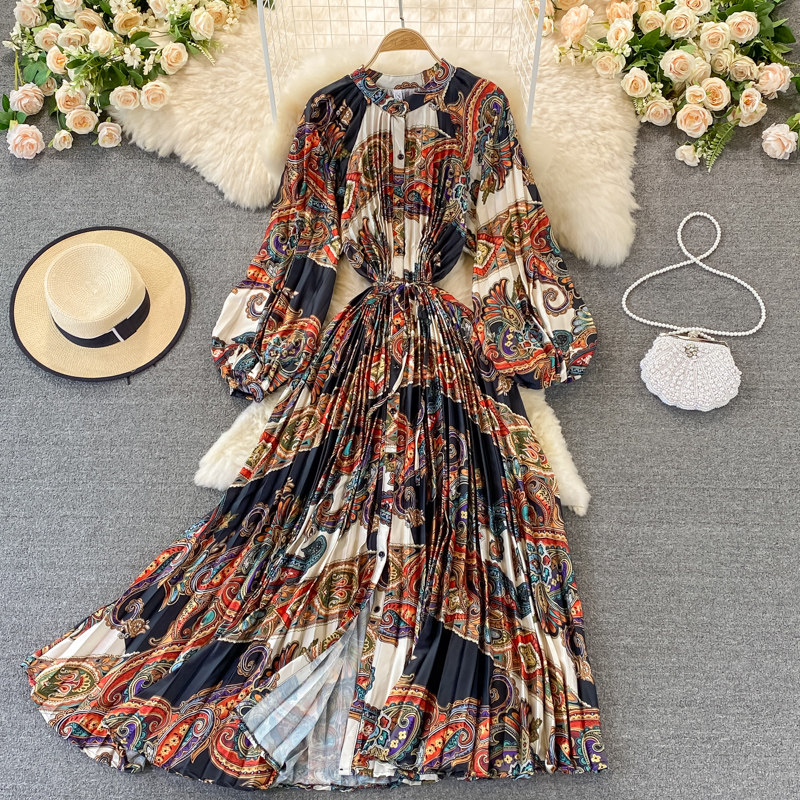 【ワンピース】ラウンドネック サテン プリント プリーツ 長袖 ワンピース 【SHシリーズ】