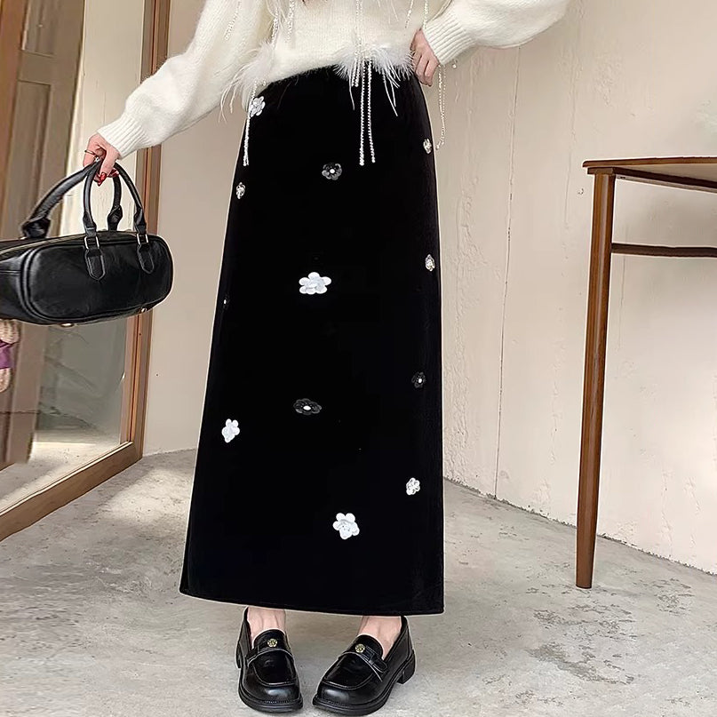【ボトムス】裏起毛 ロングスカート Aライン スリット入り ヒップカバー 落ち感 ベロア調 厚手 秋冬 レディース【JZシリーズ】