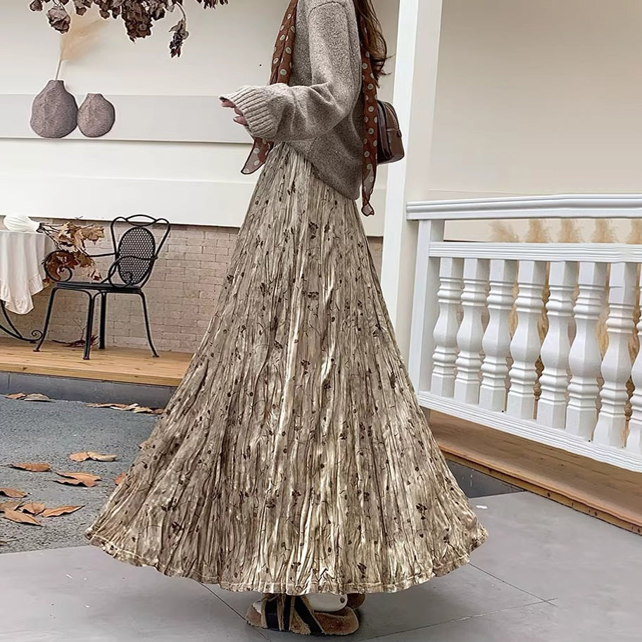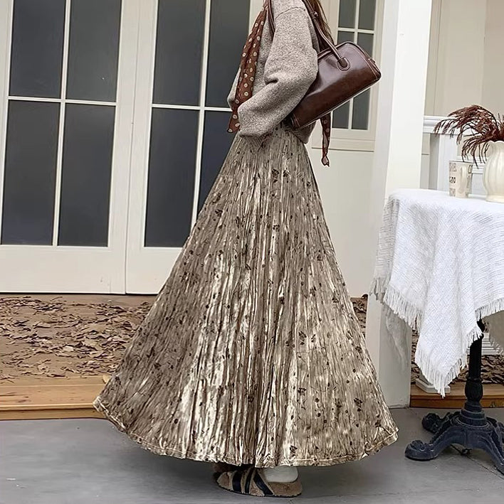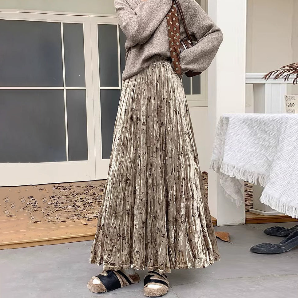 【ボトムス】レトロ 花柄 ベルベット プリーツスカート 秋冬 Aライン ヒップカバー すっきり見え エレガント ロング丈【SHシリーズ】