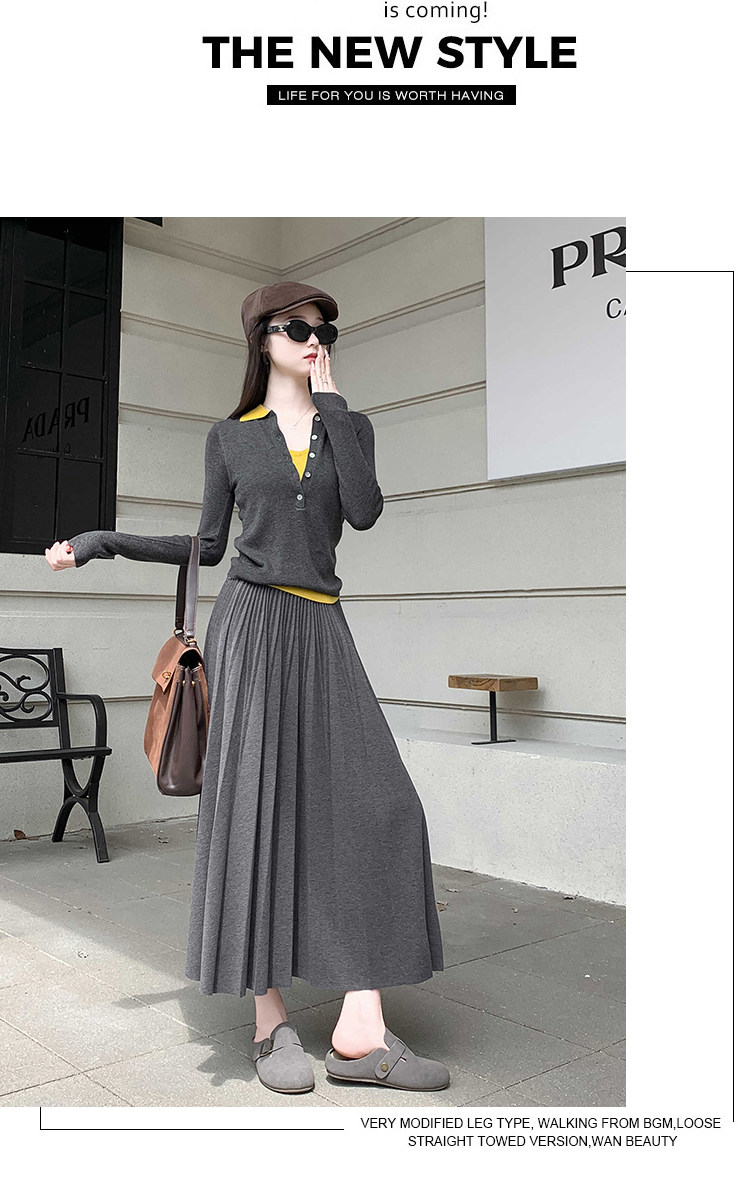 【ワンピース】ダーク系 無地 切替 プリーツ 長袖 シャツワンピース ゆるシルエット 垂れ感【AHシリーズ】