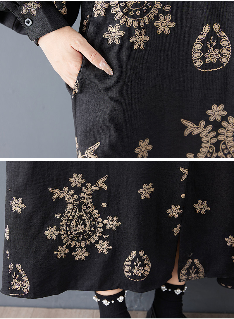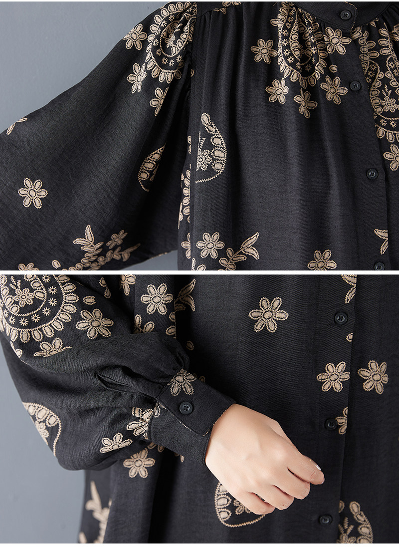 【ワンピース】プリント切替 長袖 シャツワンピース スタンドカラー ゆったり 大きいサイズ ミディ丈 レディース【SHシリーズ】