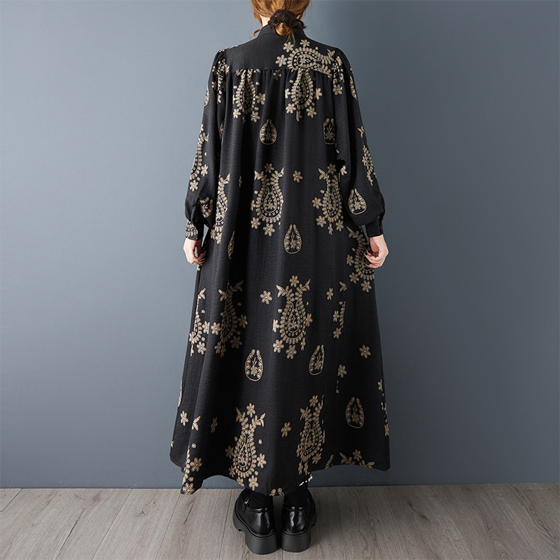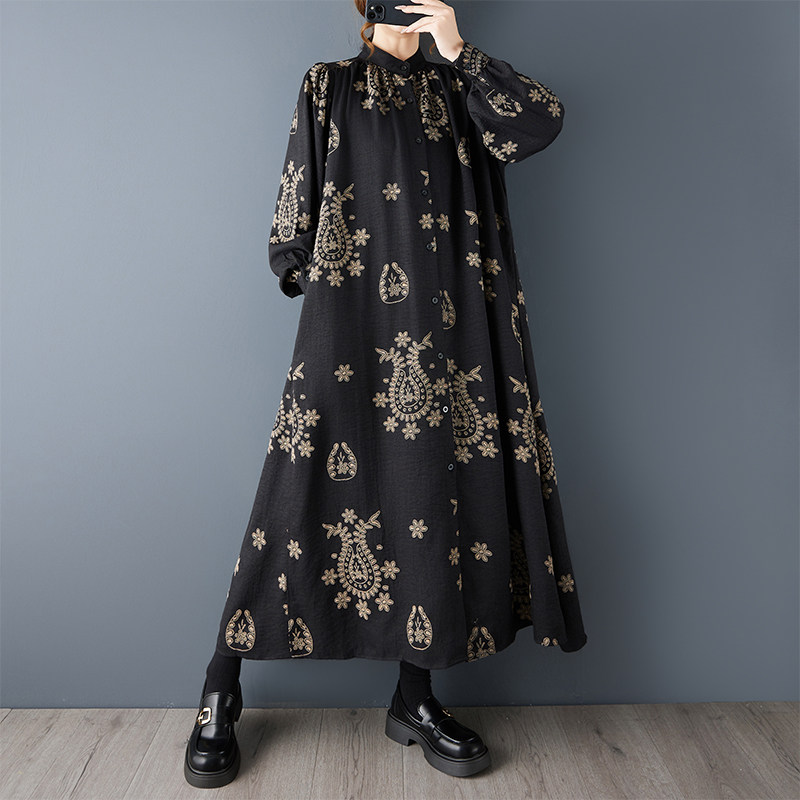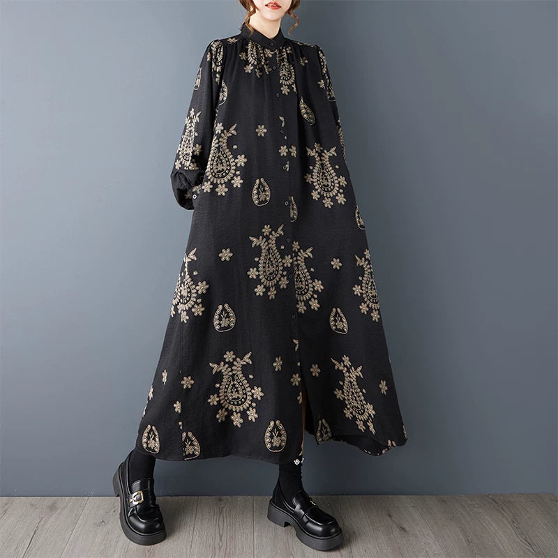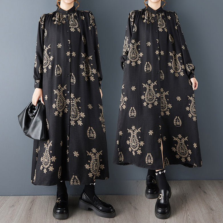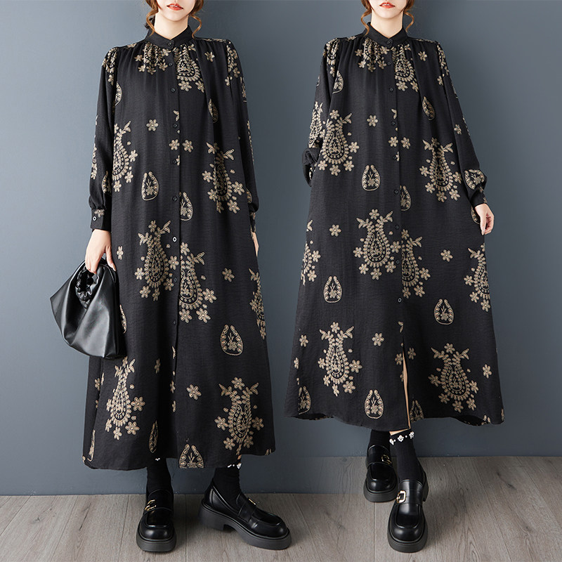 【商品名】【ワンピース】プリント切替 長袖 シャツワンピース スタンドカラー ゆったり 大きいサイズ ミディ丈 レディース【SHシリーズ】