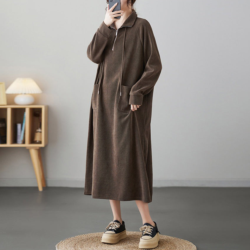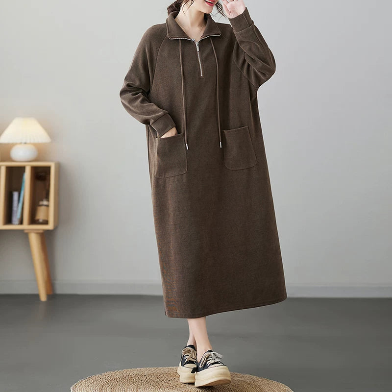 【60%OFF⭐️早い者勝ち】【ワンピース】ジップ&ドローストリング 切替 ロングワンピース 長袖 ゆったり 大きいサイズ ポケット付き レディース【JZシリーズ】