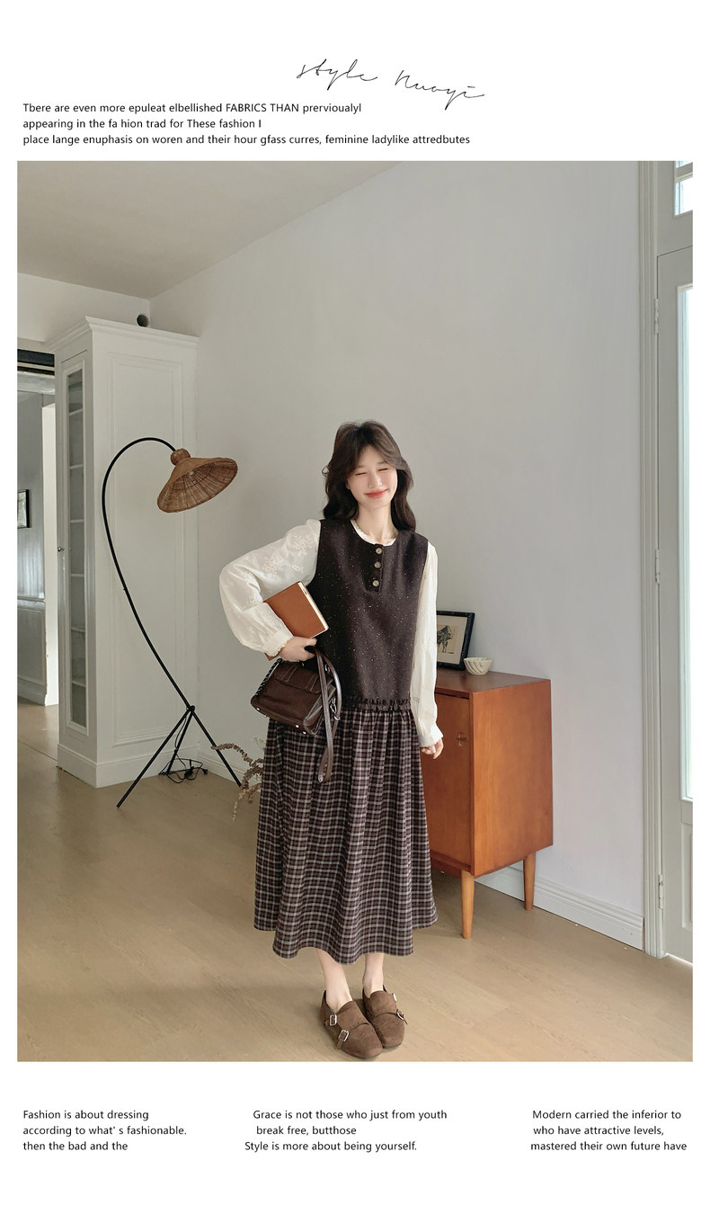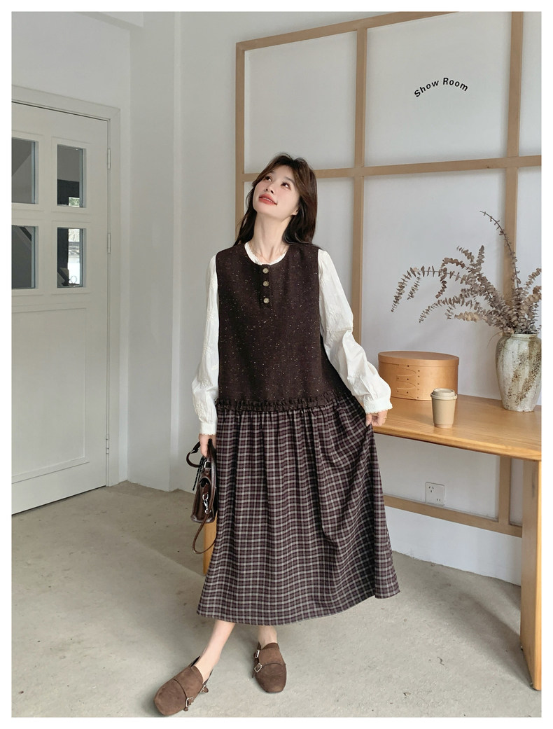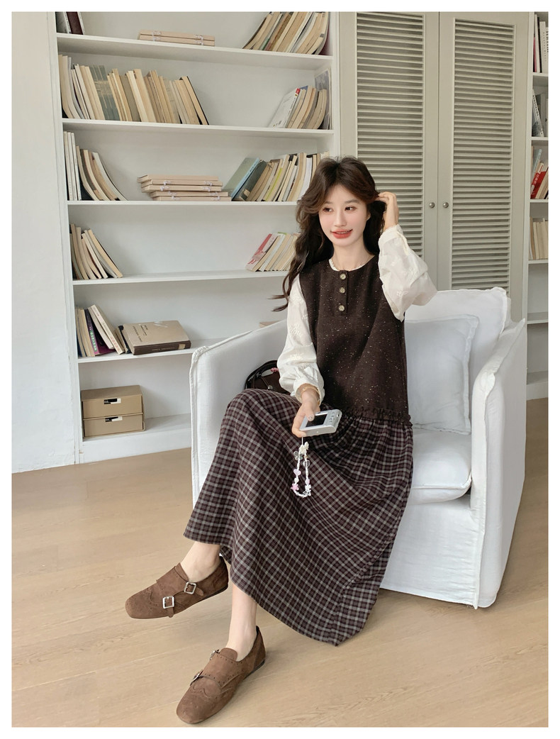 【60%OFF⭐️早い者勝ち】【ワンピース】春秋ラウンドネック 長袖 ニット パッチワーク ロング 長袖ワンピース