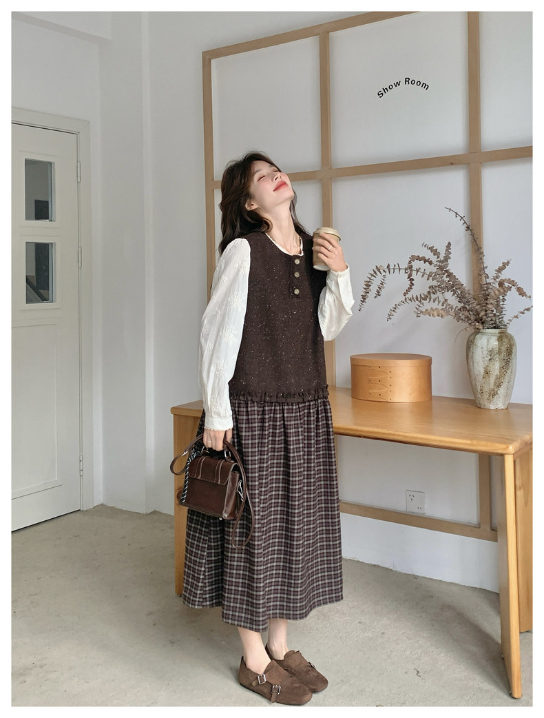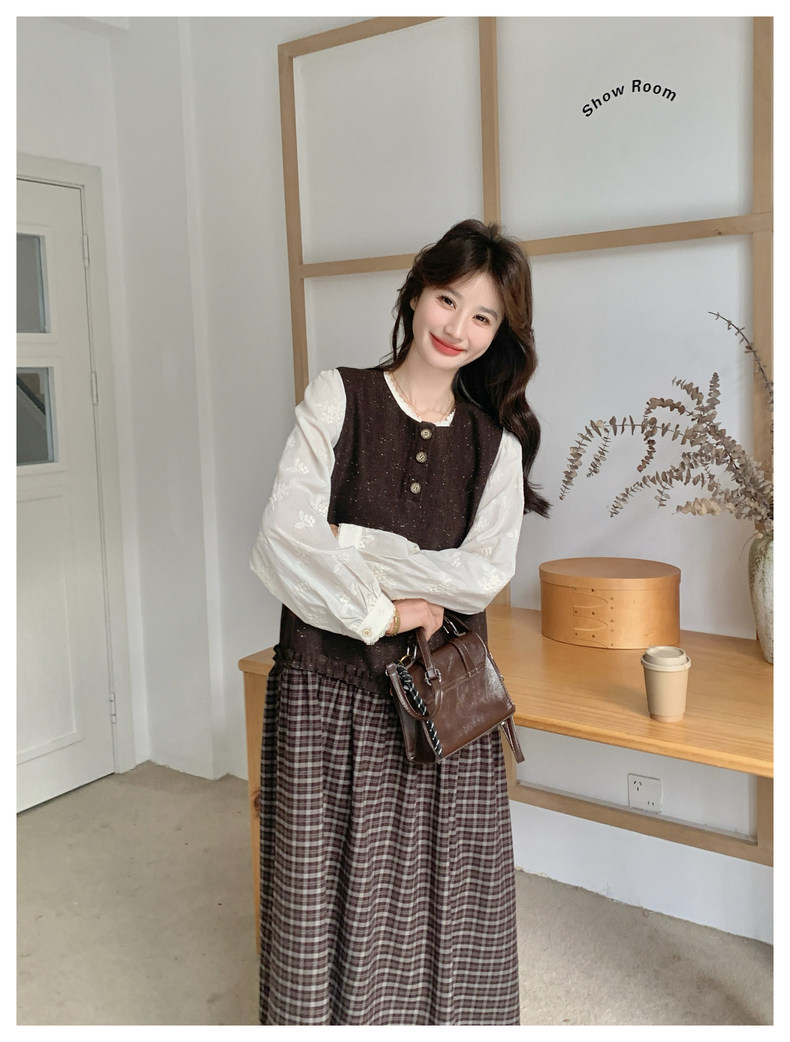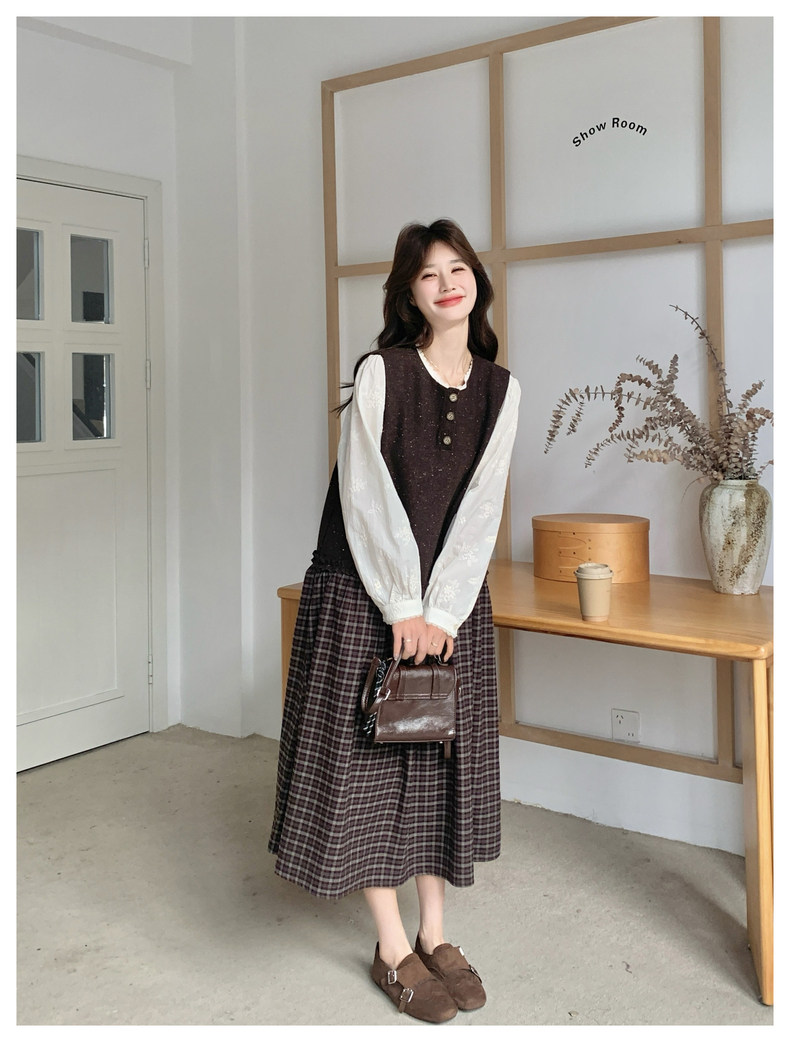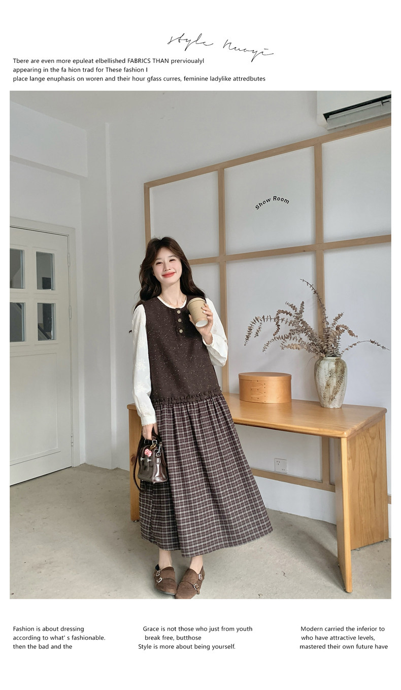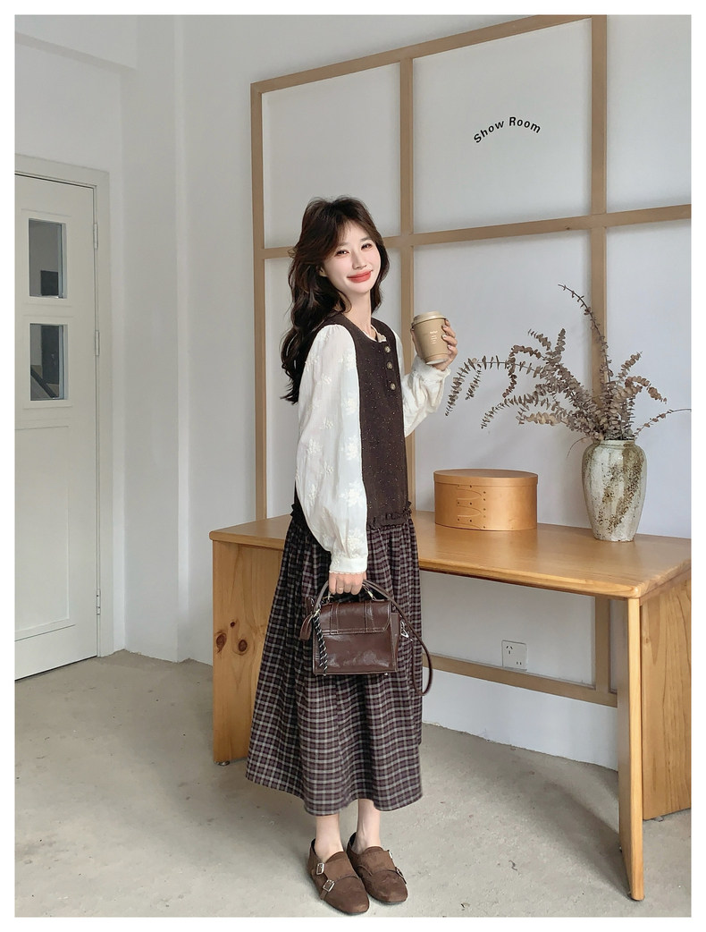【商品名】【ワンピース】レース刺繍 シャツ+ノースリーブワンピース 2点セット チェック柄 配色切替【JZシリーズ】