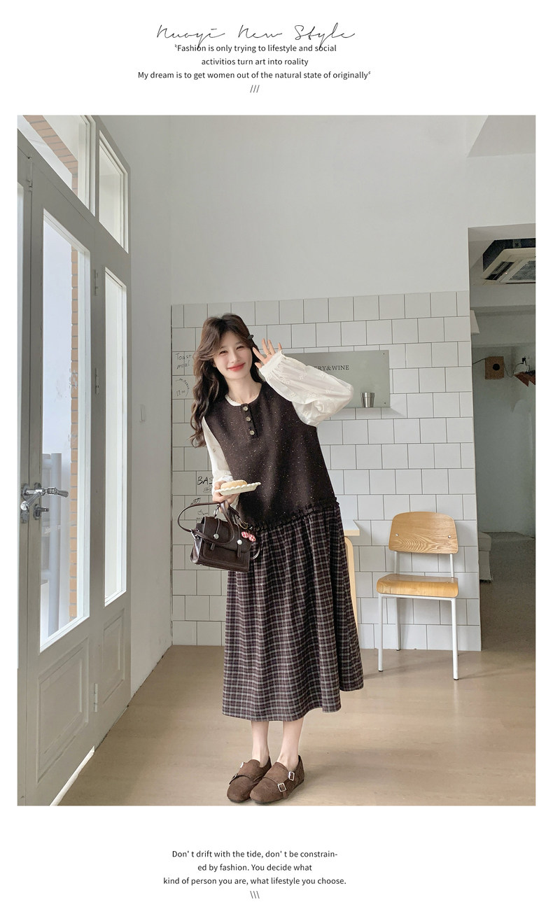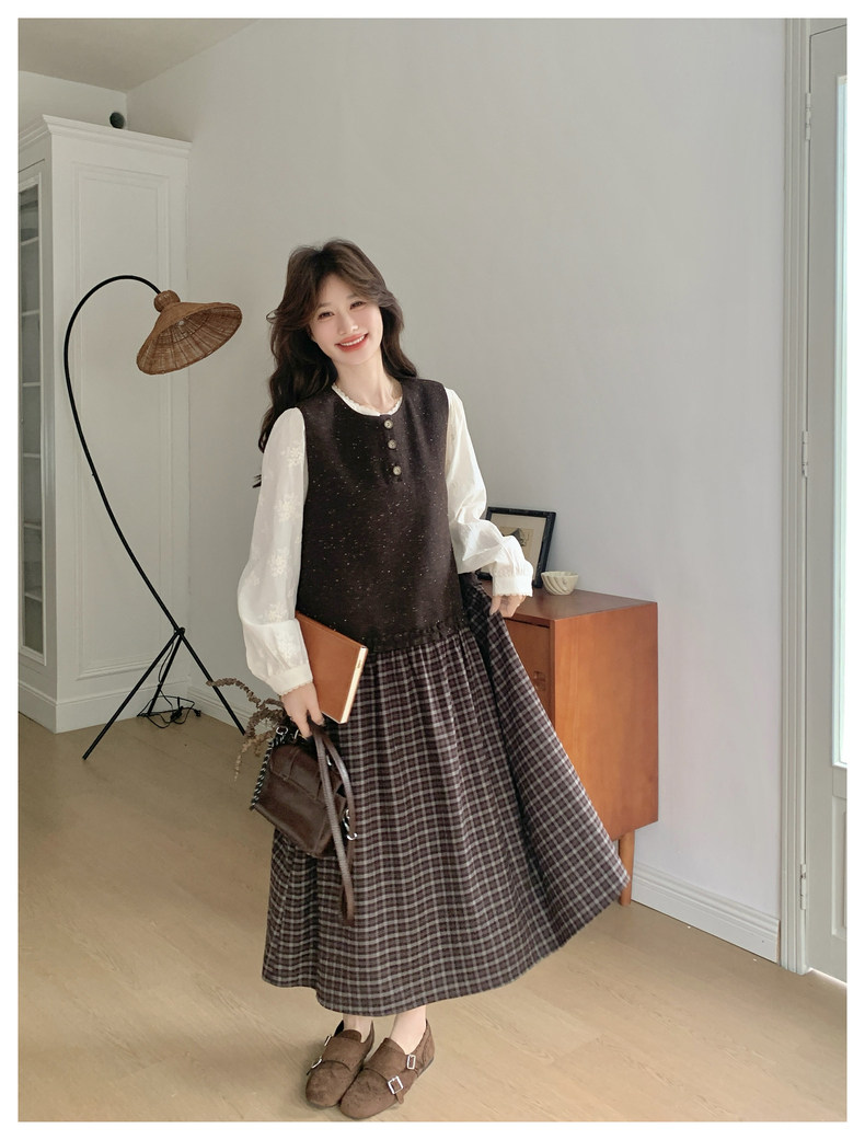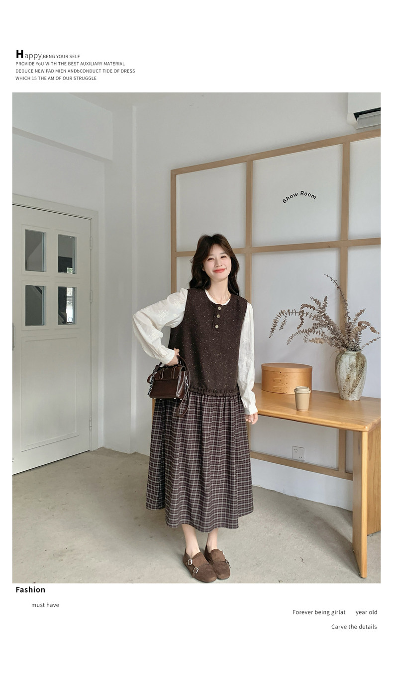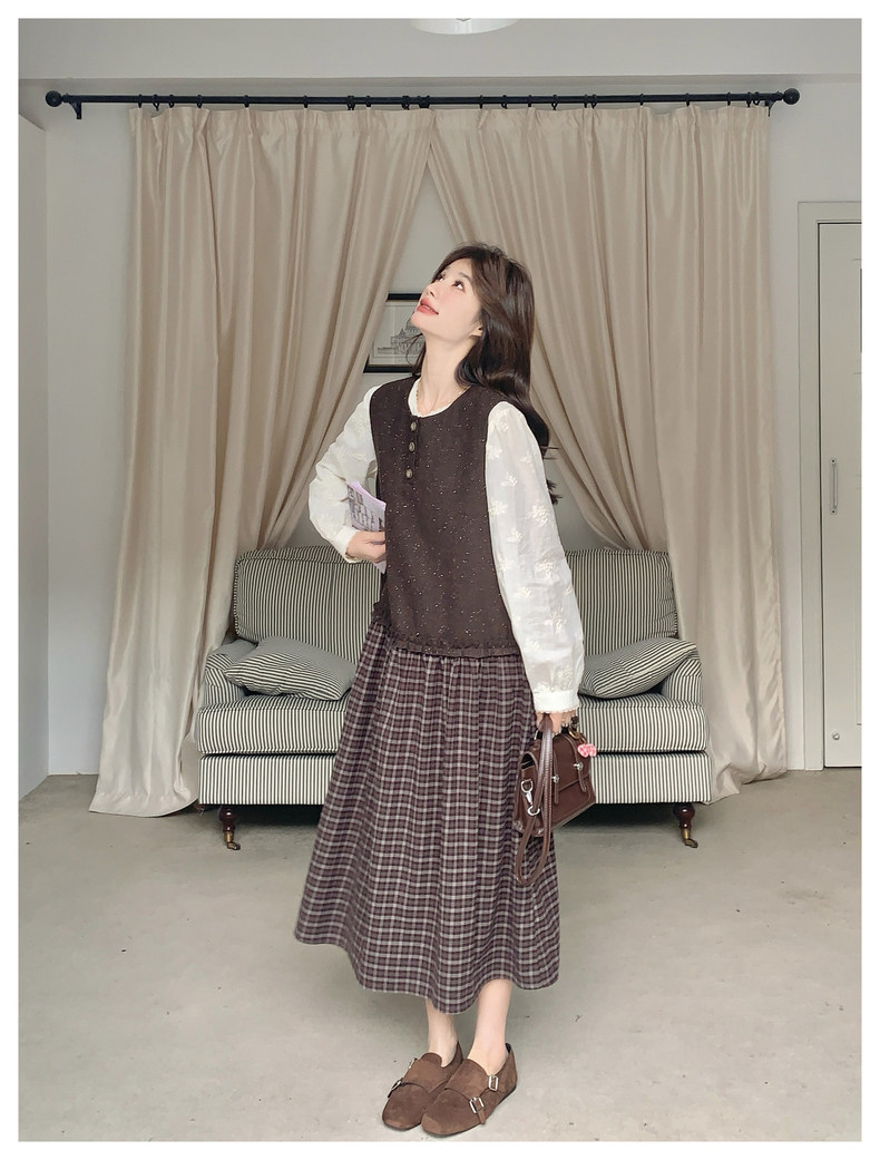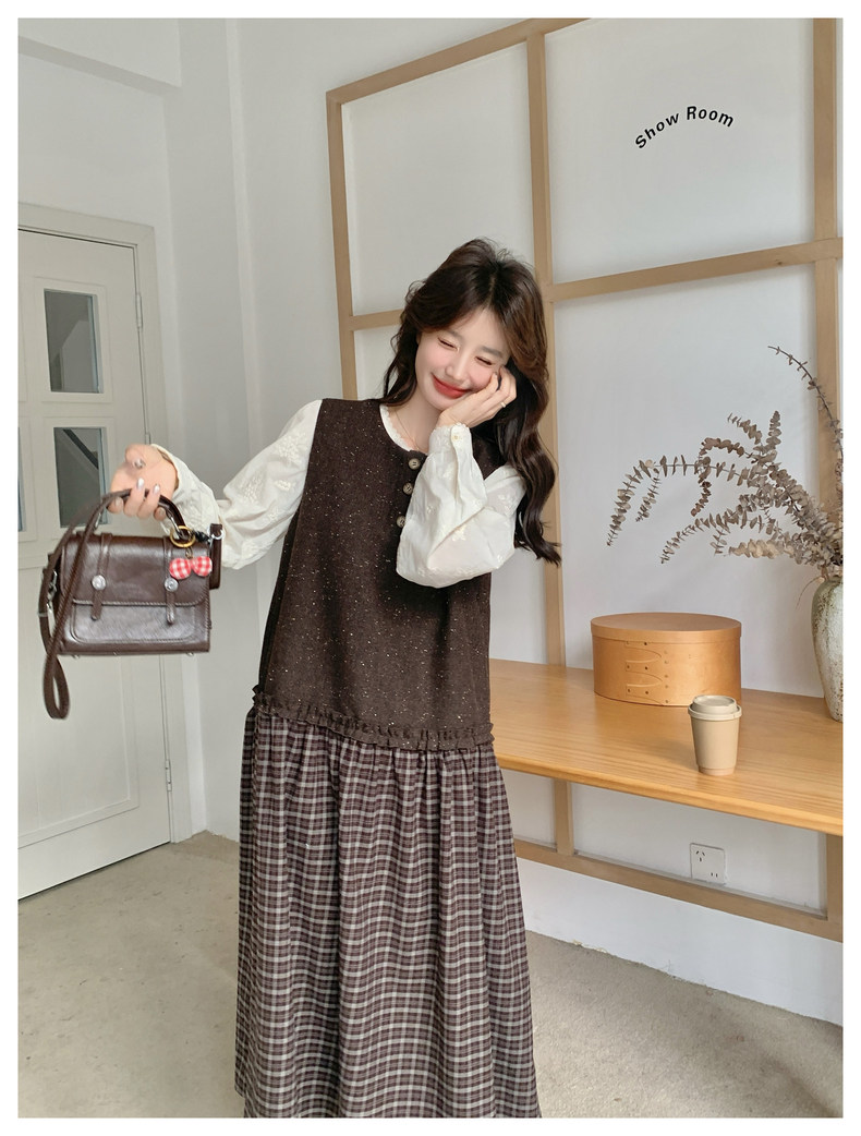【商品名】【ワンピース】レース刺繍 シャツ+ノースリーブワンピース 2点セット チェック柄 配色切替【JZシリーズ】