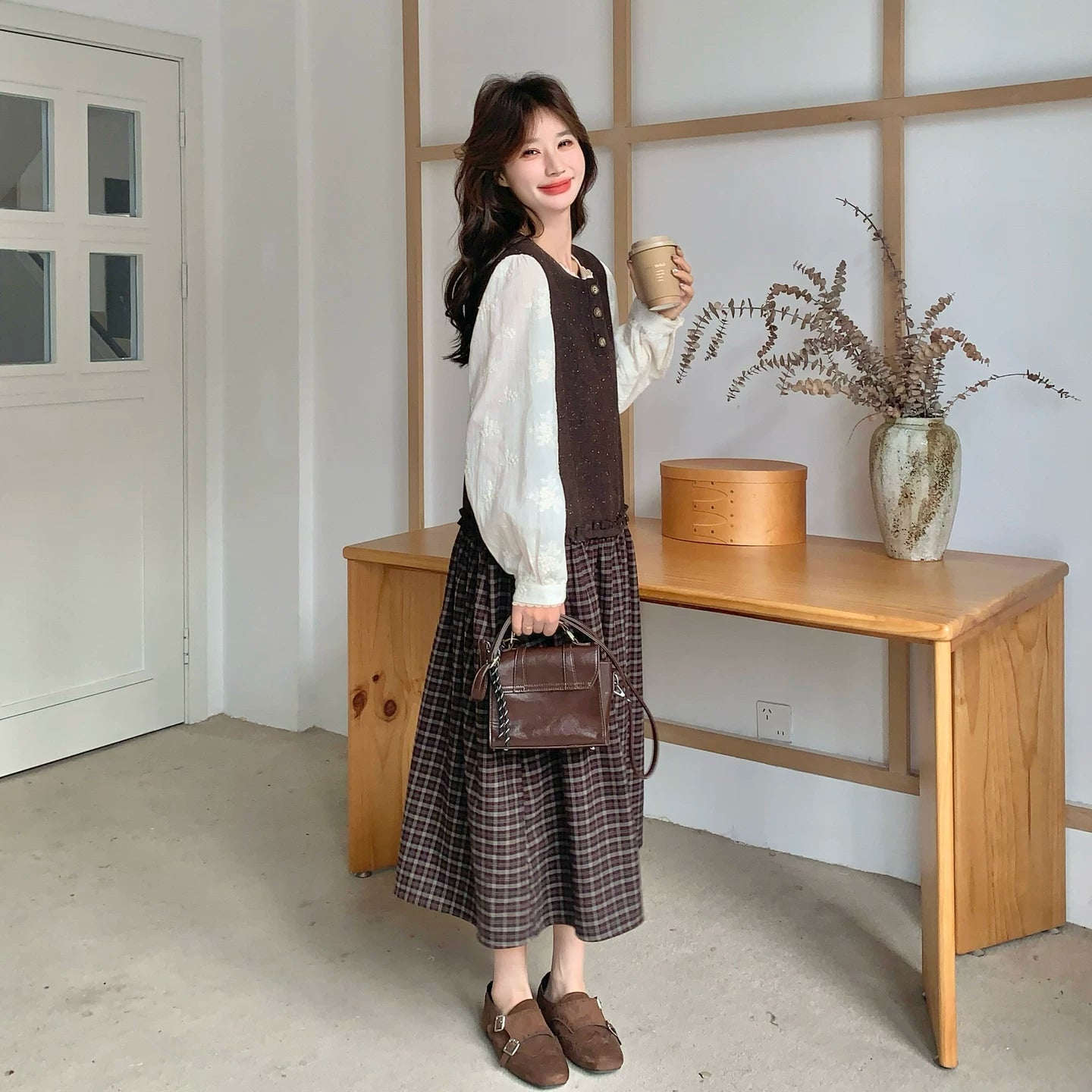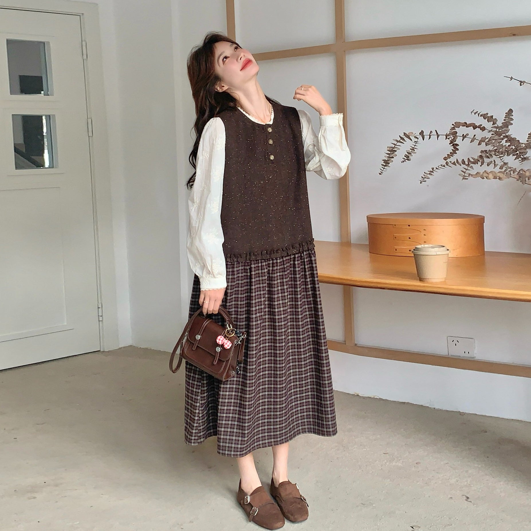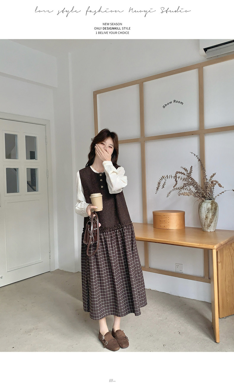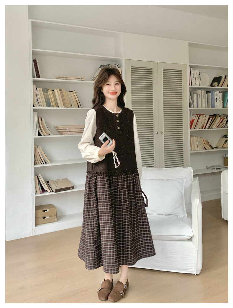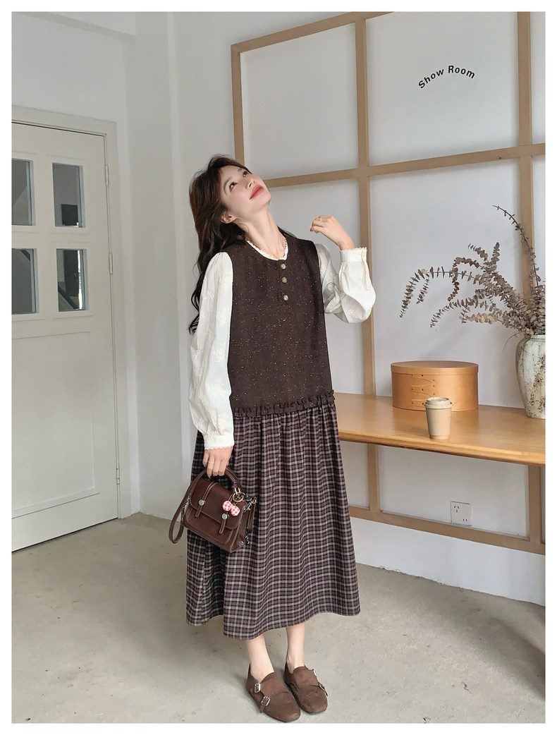 【商品名】【ワンピース】レース刺繍 シャツ+ノースリーブワンピース 2点セット チェック柄 配色切替【JZシリーズ】