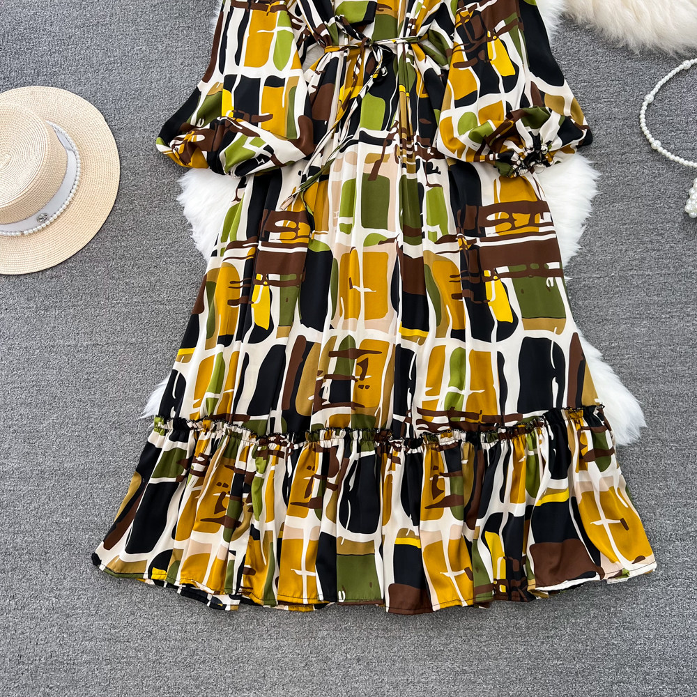 【商品名】【ワンピース】リボン ウエストマーク Aライン フレア フリル プリント 長袖 ワンピース 【SHシリーズ】