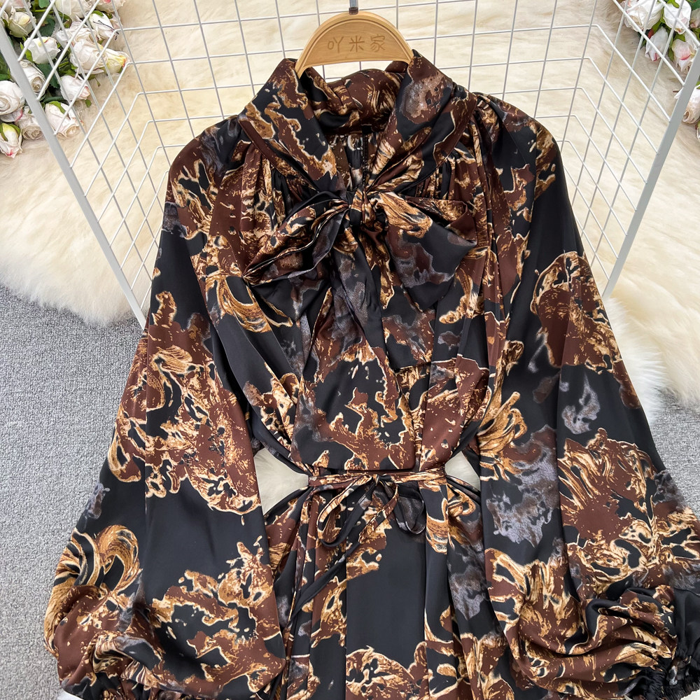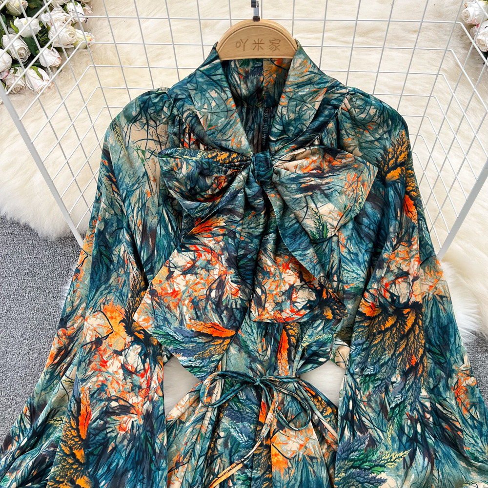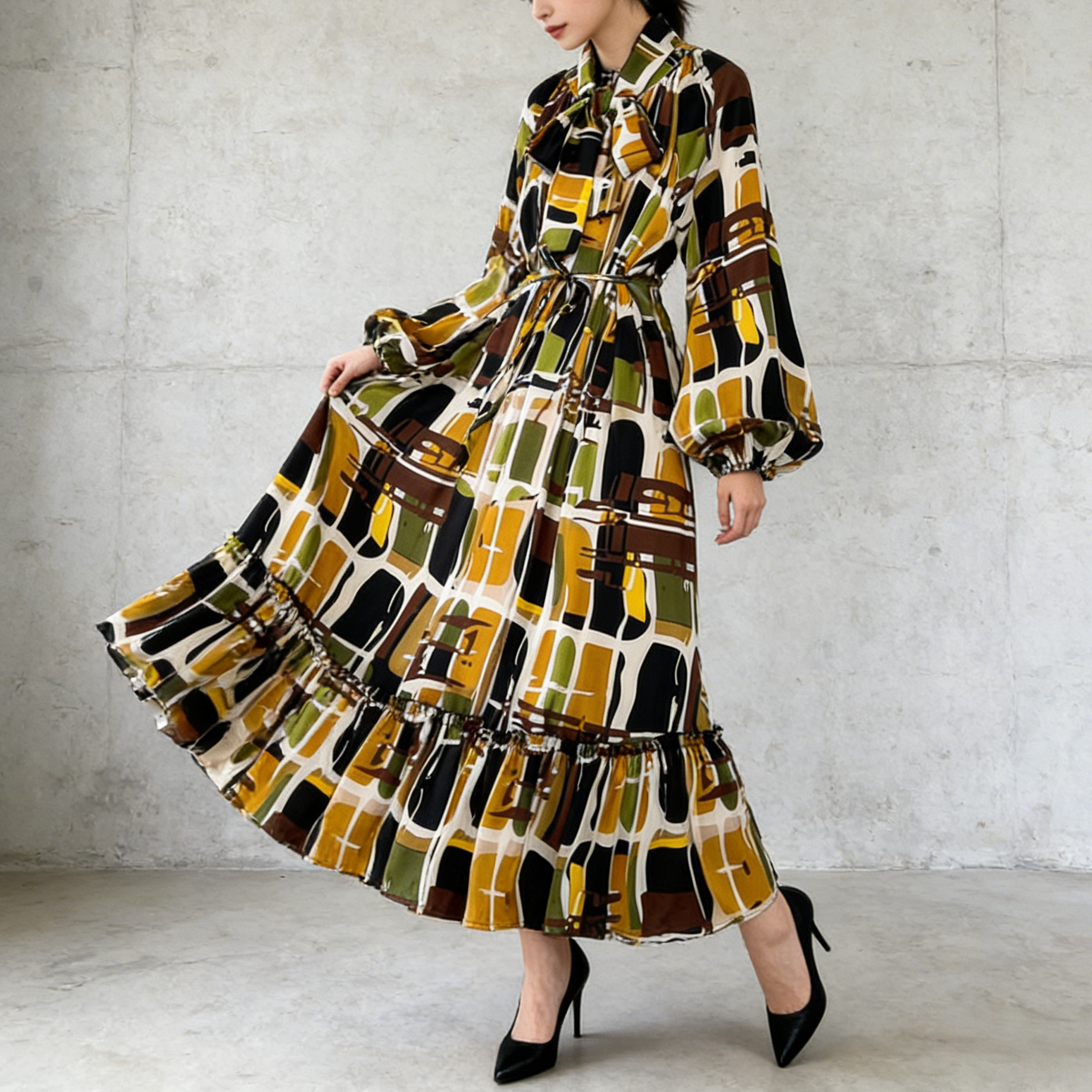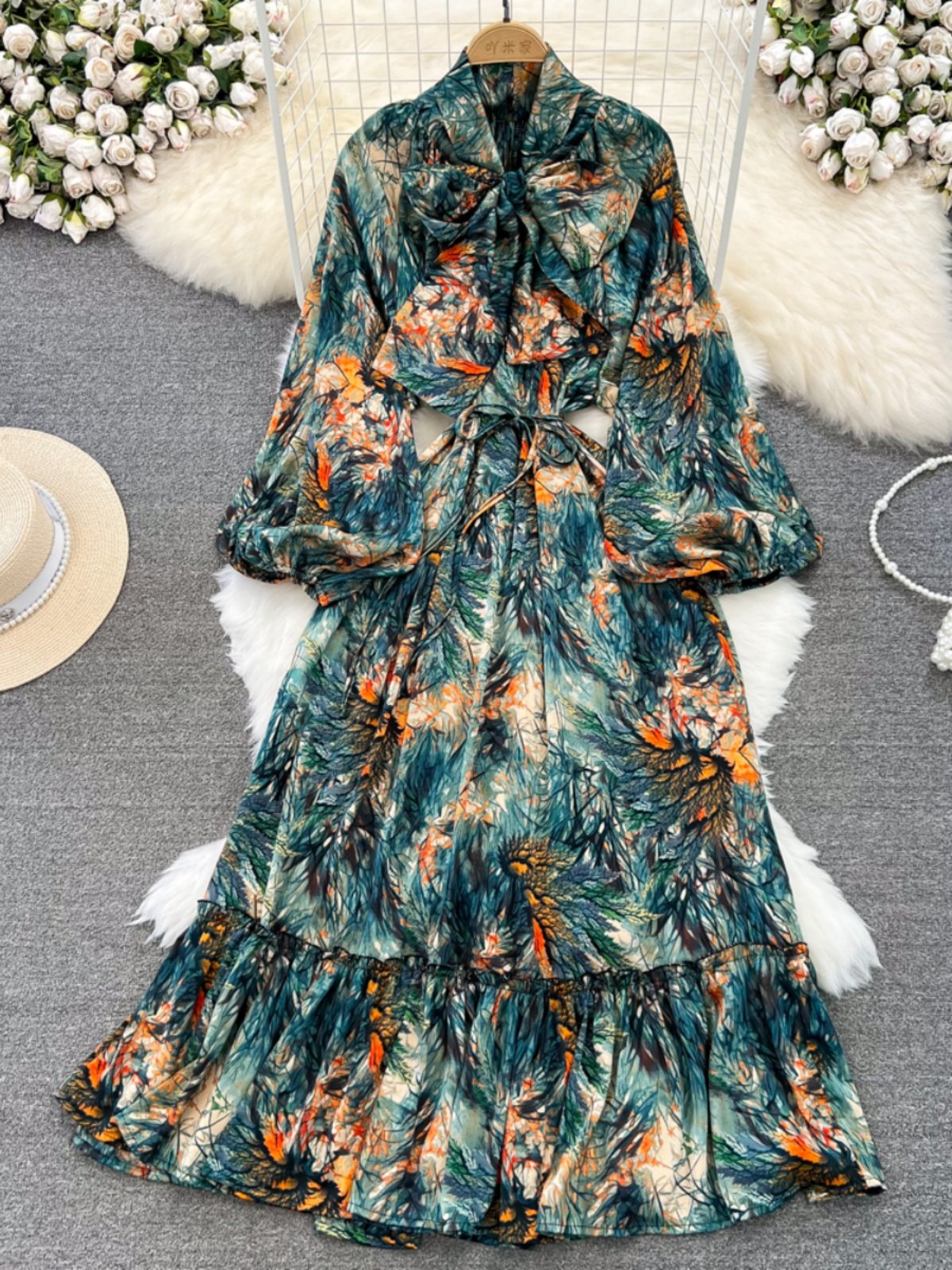 【60%OFF⭐️早い者勝ち】【ワンピース】リボン ウエストマーク Aライン フレア フリル プリント 長袖 ワンピース 【SHシリーズ】
