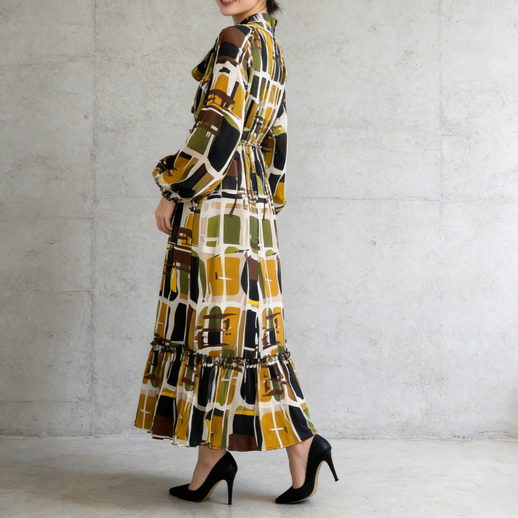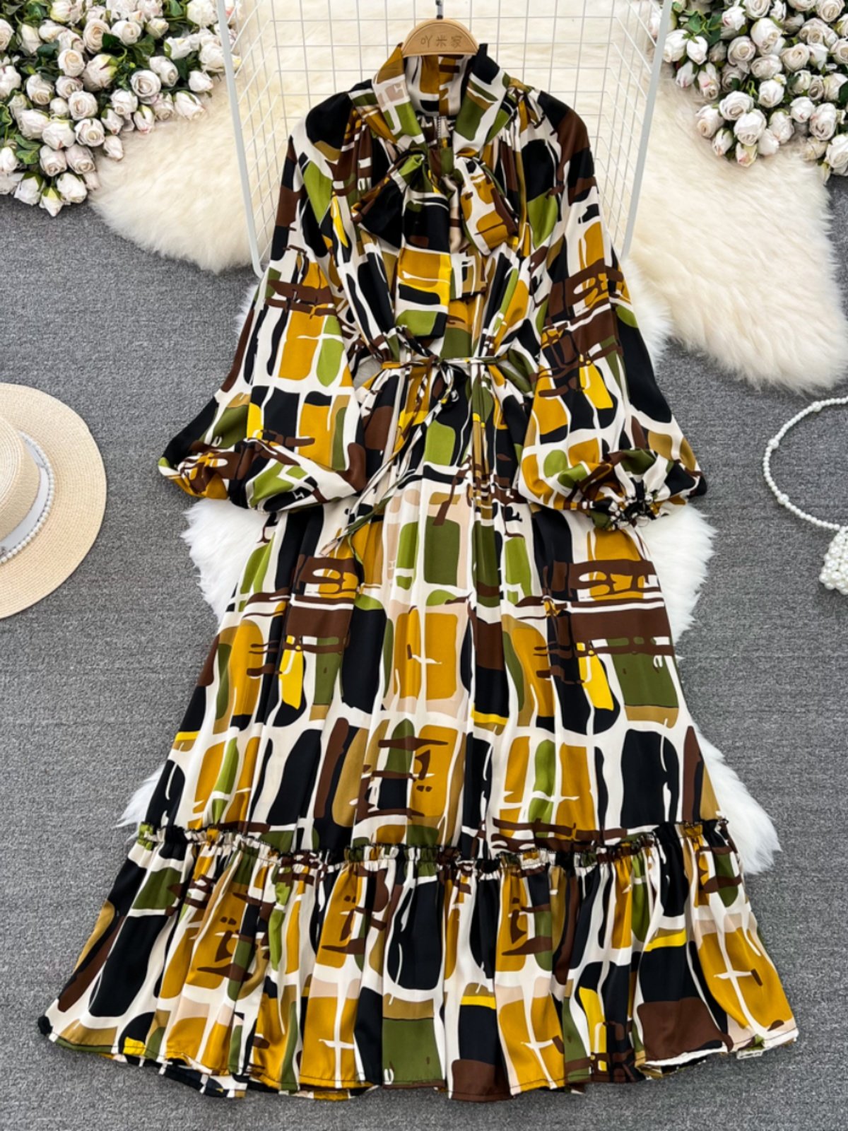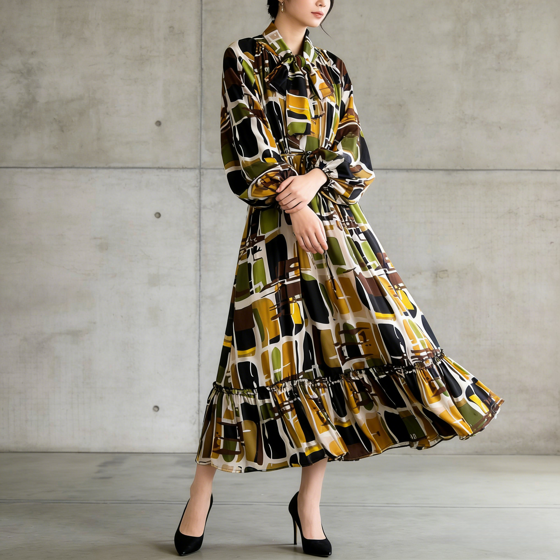 【60%OFF⭐️早い者勝ち】【ワンピース】リボン ウエストマーク Aライン フレア フリル プリント 長袖 ワンピース 【SHシリーズ】